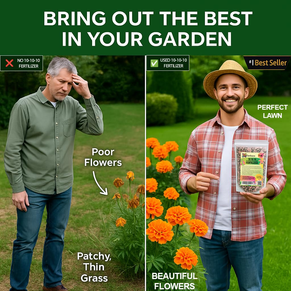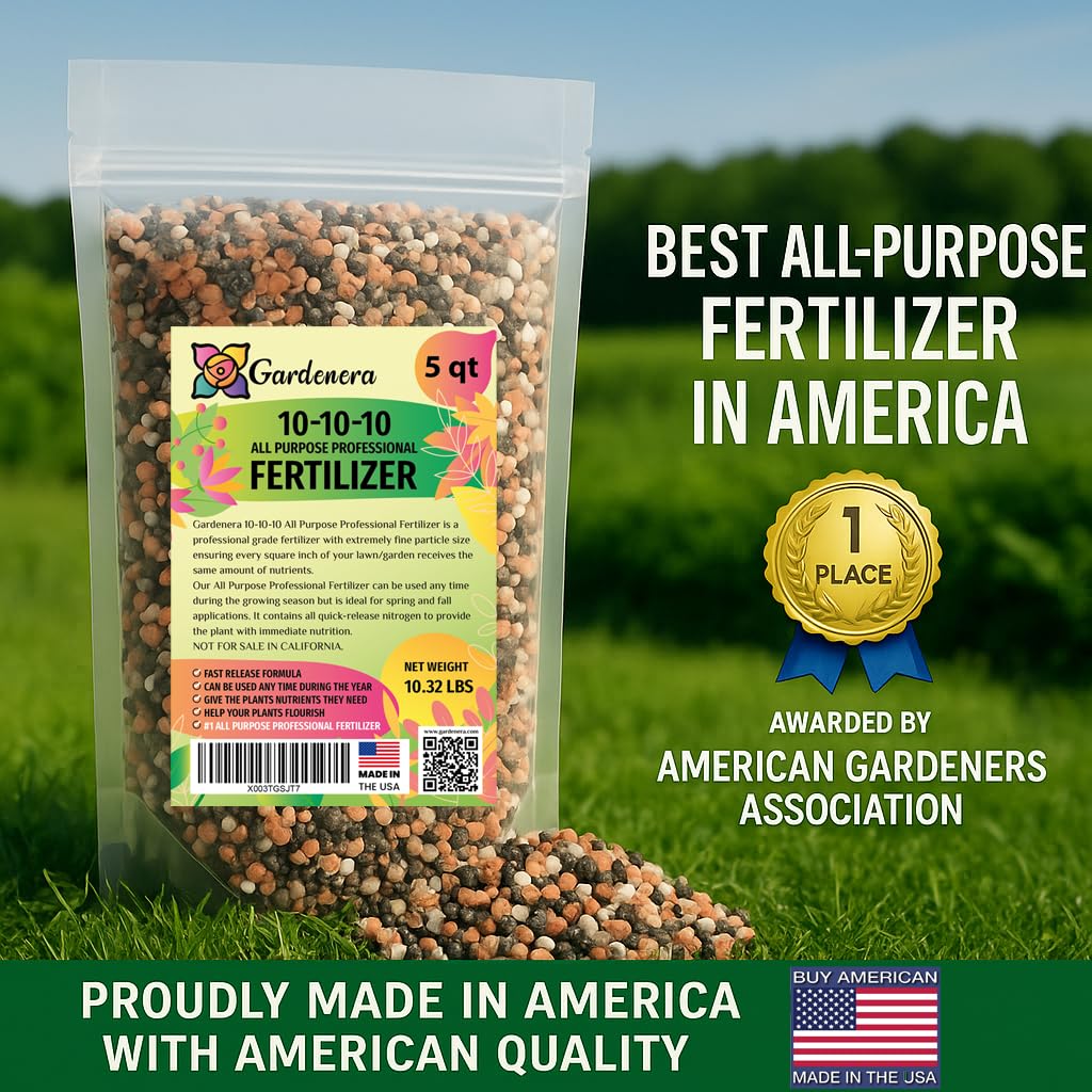 Gardenera 10-10-10 All-Purpose Fertilizer is a premium-grade plant food designed to support healthy, balanced growth in virtually every type of plant — from lawns and trees to vegetables, flowers, and ornamentals. With an equal blend of 10% Nitrogen (N), 10% Phosphorus (P), and 10% Potassium (K), this fertilizer delivers the essential nutrients your plants need to thrive throughout every stage of growth. Whether you're caring for a lush green lawn, vibrant flower beds, or a productive vegetable garden, Gardenera’s balanced formula ensures strong root development, vigorous foliage growth, and abundant blooms or fruit. This all-in-one solution takes the guesswork out of plant nutrition and helps even beginner gardeners achieve professional results. What makes Gardenera different is our dual-action formula. Fast-acting ingredients jumpstart growth and recovery, while slow-release granules continue to feed your plants for up to 40 days, providing consistent nourishment with less frequent applications. That means fewer interruptions, more time enjoying your garden, and longer-lasting results. Designed for easy application, Gardenera 10-10-10 can be applied by hand or with a spreader, then watered in to activate nutrient absorption. It’s safe for people and pets once watered in and dry, and it's ideal for both spring and fall feedings. Each resealable bag is filled with high-purity, American-made granules — proudly manufactured in the USA with strict quality standards to ensure optimal performance in all climates and soil types. Gardenera has even been recognized as the #1 All-Purpose Fertilizer by the American Gardeners Association in 2025, making it a trusted choice for gardeners across the country. From lawn care to edible gardening, Gardenera 10-10-10 is the go-to fertilizer for consistent, balanced results in any garden setting.