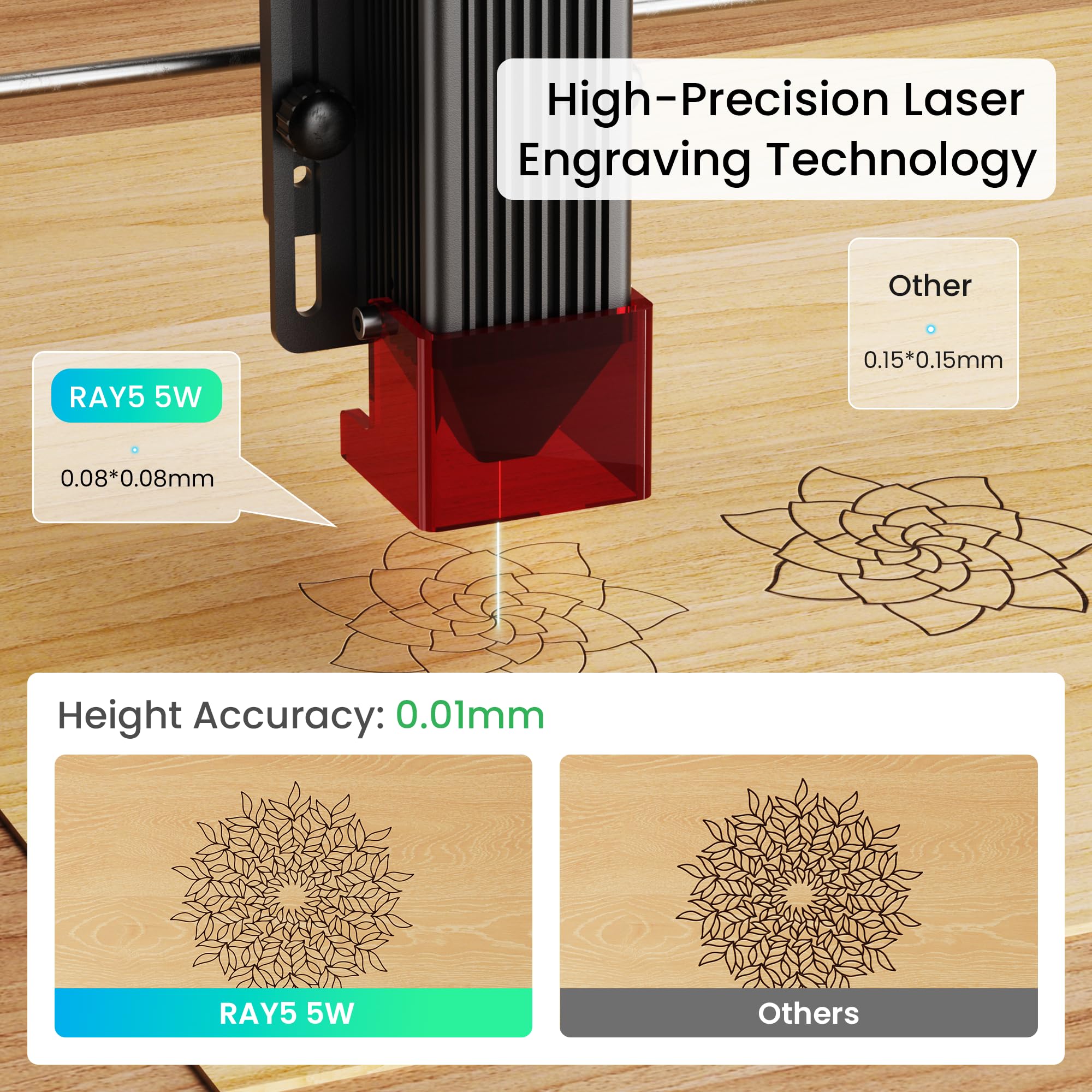 【High-Precision Laser Engraving】The Longer Ray5 laser engraver 5000MW utilizes advanced laser technology, featuring a laser point size of 0.08*0.08mm and an engraving accuracy of 0.01mm. This ensures precise engraving down to 0.01mm, enabling intricate designs and detailed patterns.