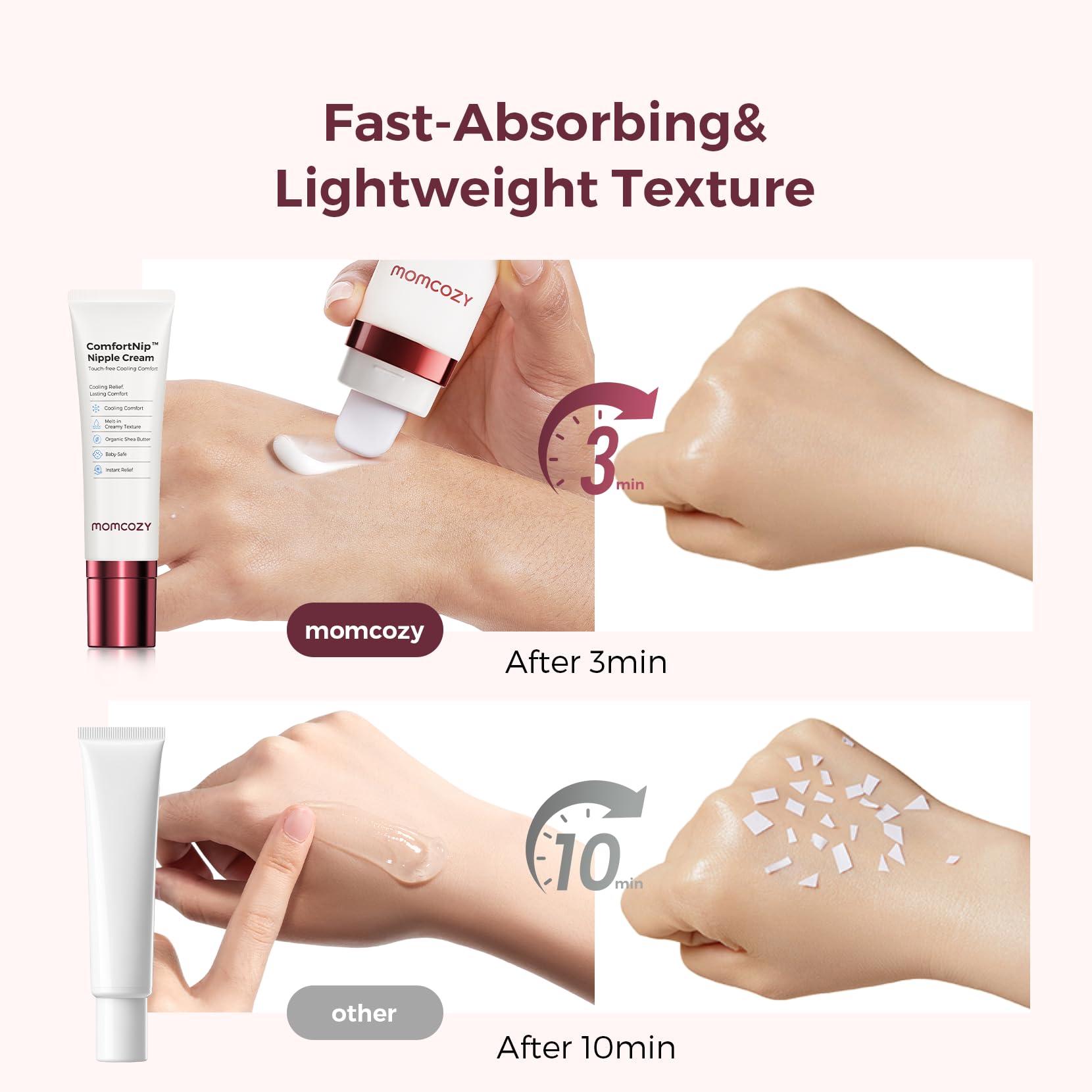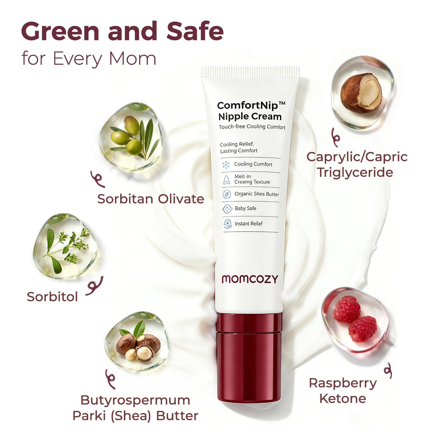 Mom & Baby-Safe Formula with Gentle Ingredients:Momcozy nipple cream safe for breastfeeding features Aqua (gentle base) and Sorbitol (moisturizing) to soothe delicate skin. Rigorously tested, free of lanolin (no lanolin nipple cream), petroleum, preservatives & fragrances—safe for postpartum moms, no residue worry.