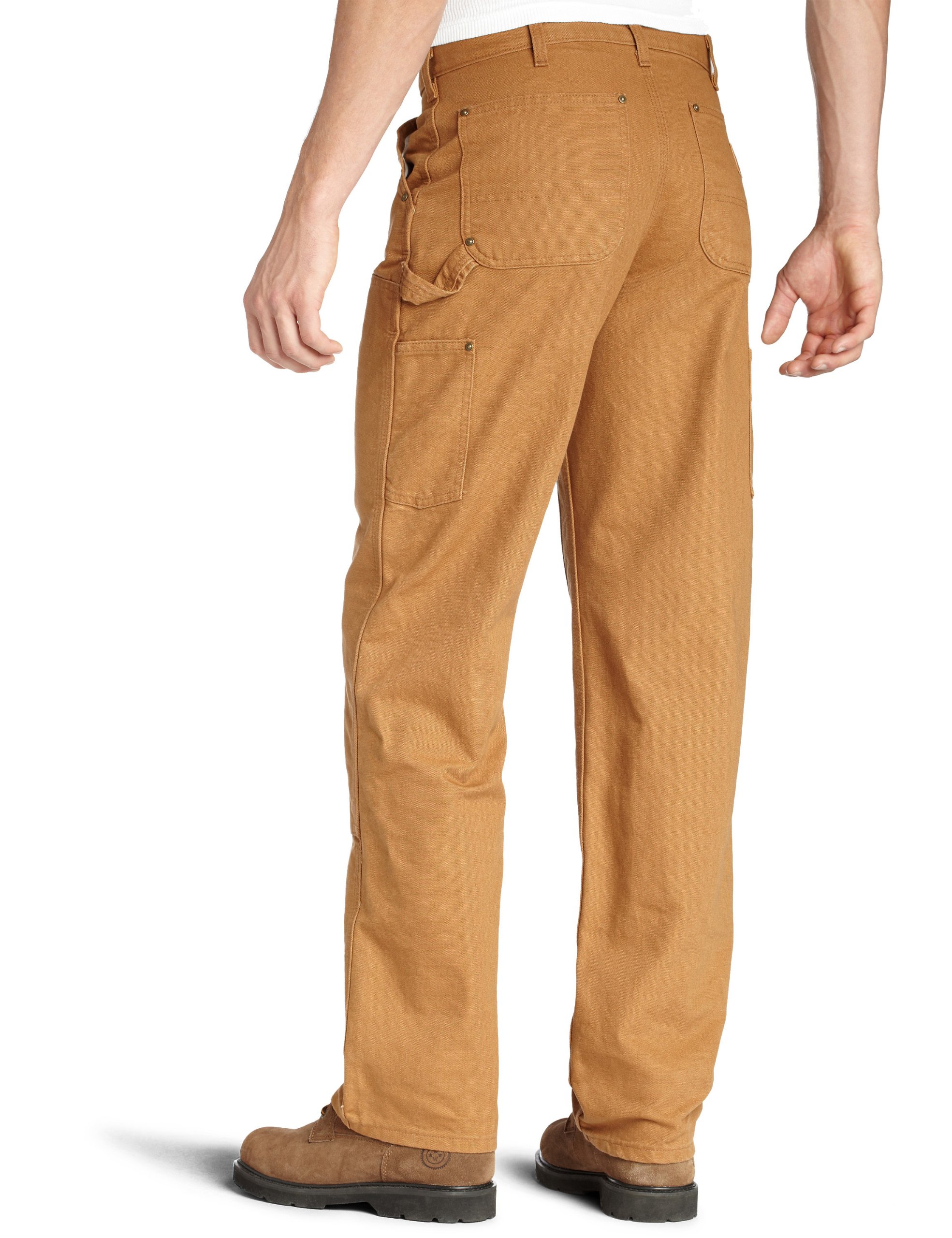 Description Built for long wear with chap-style leg panels, carhartt's double-front work dungaree also features double knees with cleanout bottoms that accommodate knee pads, Constructed of heavyweight 12-ounce, 100 percent ring-spun cotton duck, the dungaree sits at the natural waist and is cut with a full seat and thigh, It includes multiple tool and utility pockets, plus a hammer loop, Leg openings measure 19-inches to fit over work boots