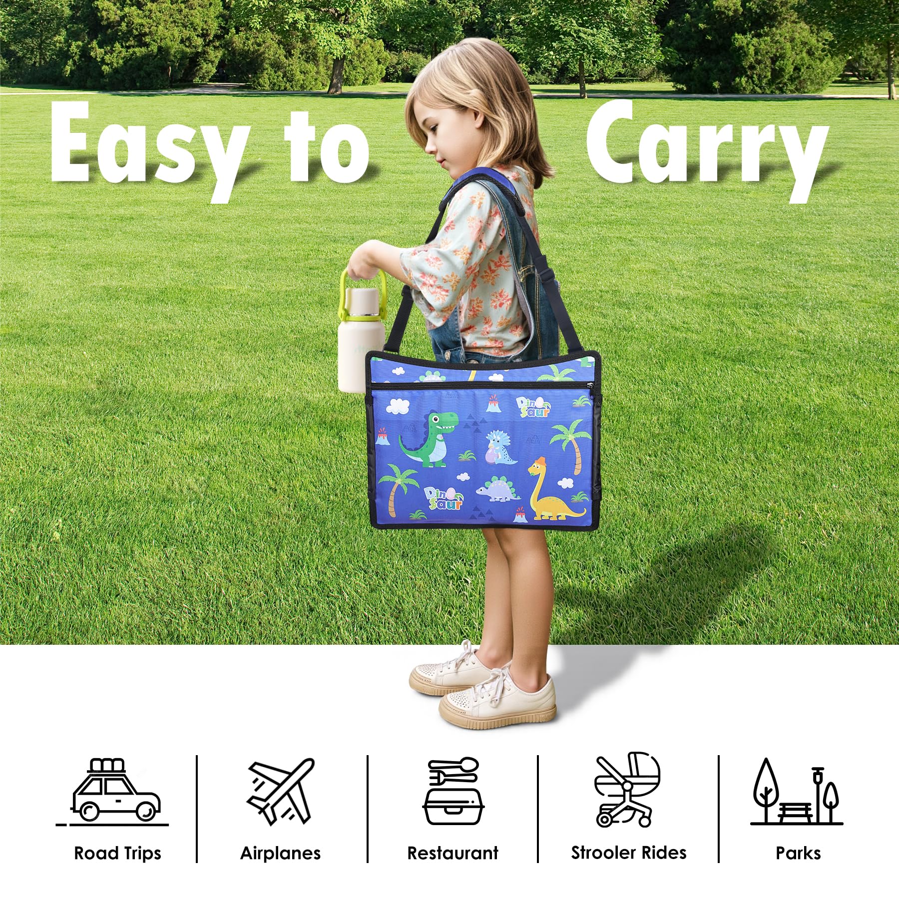 Wide Application Size : Our 17" x 13.5" x 1.5" kids travel tray for car seat is compatible with most kids car seats and airplane seats. The adjustable shoulder strap and foldable design make car seat tray easy to store, while the car seat tray even doubles as a compact backpack for added portability. Perfect for use cars, airplanes, trains, camping, parks and more. The toddler travel tray for car seat can be the birthday gifts and Christmas gifts for your kids