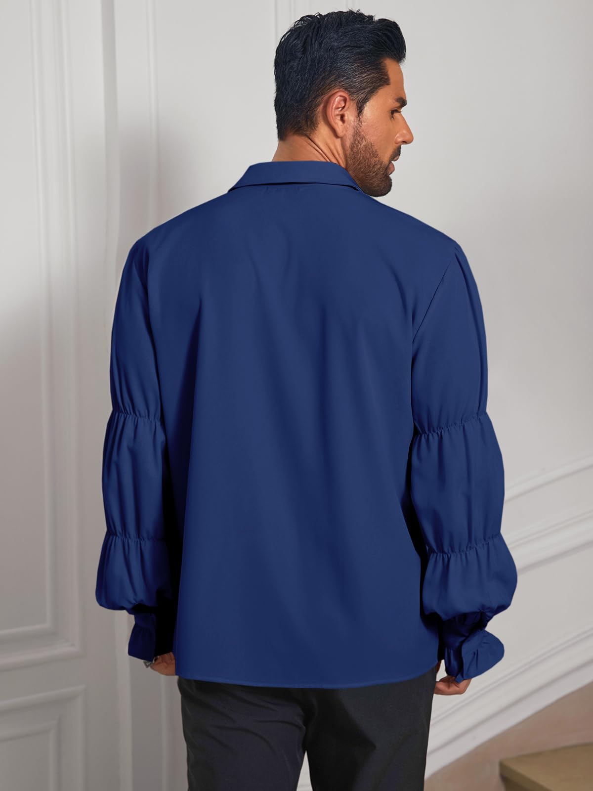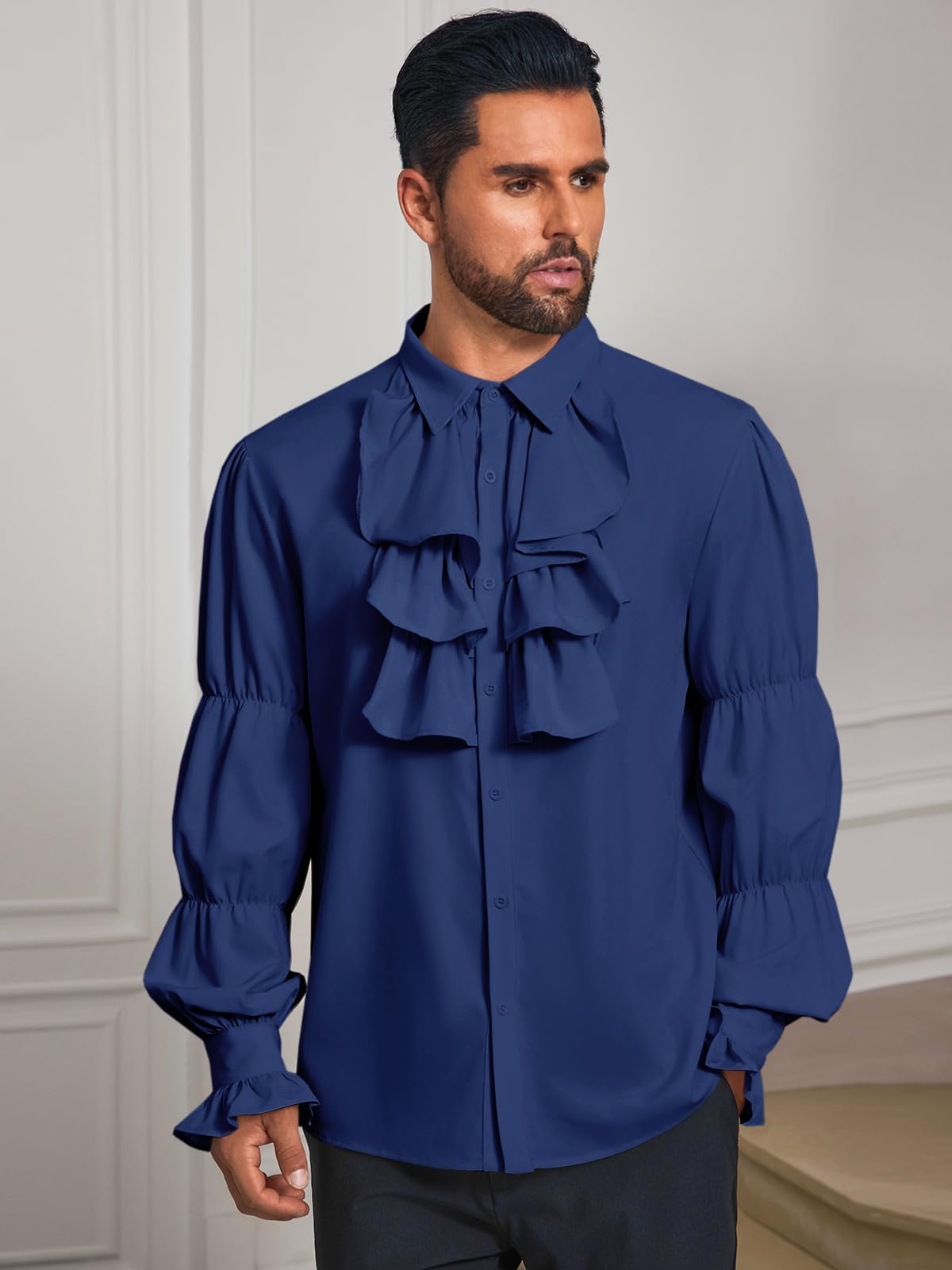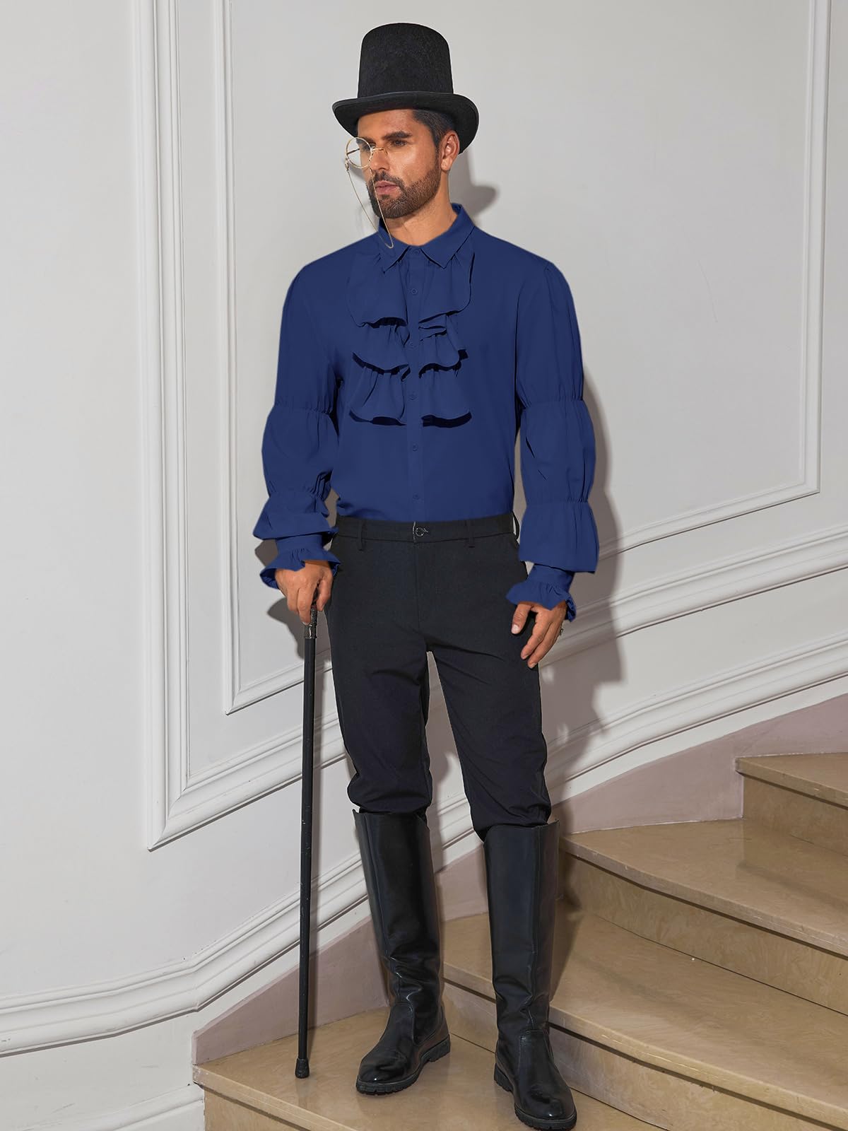 【Feature】 These mens Halloween medieval pirate cosplay shirts are design with puff flared long sleeve with elastic, spread collar with ruffle front, button down closure, steampunk gothic style. Medieval vintage style, adding an authentic touch to your pirate Viking, or Renaissance costume