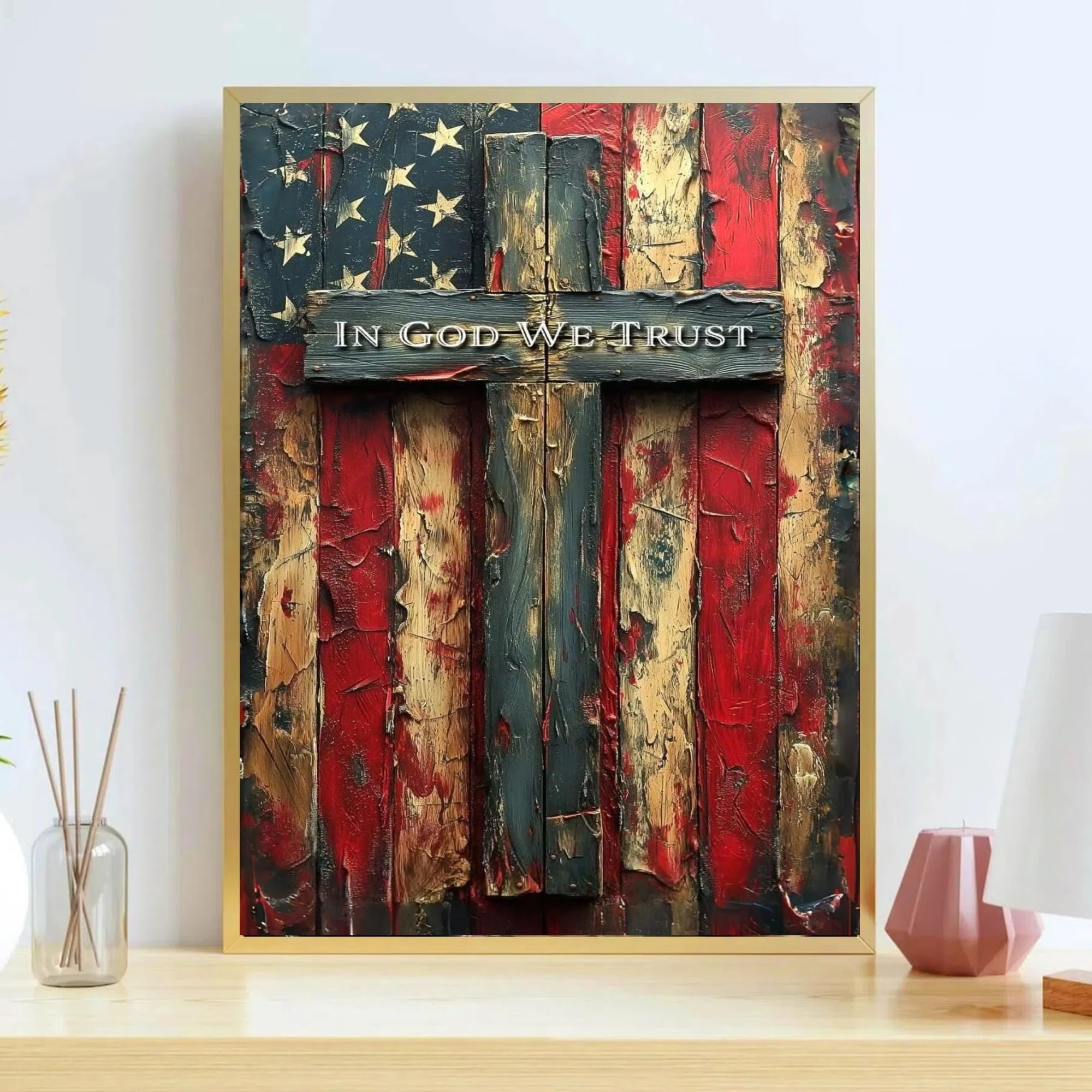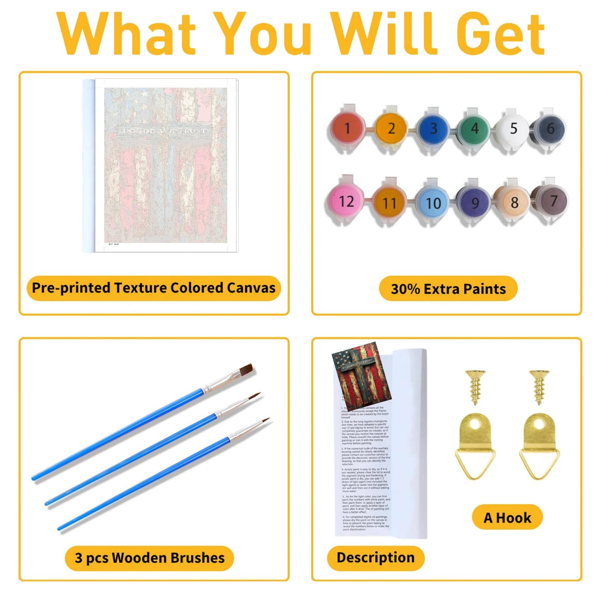 【Paint By Numbers Kit】 Our American Flag paint by numbers kits gives you everything you need to get started: 1x waterproof canvas, 1x matching paint, 3x nylon brushes (different sizes), 1x line drawing, 1x instruction manual, 1x finished effect card, 2x metal hooks. (No frame)