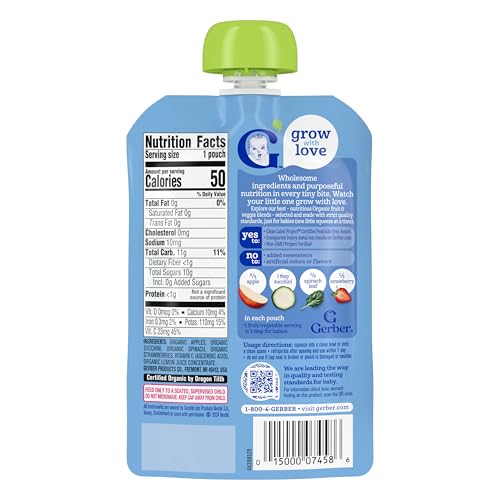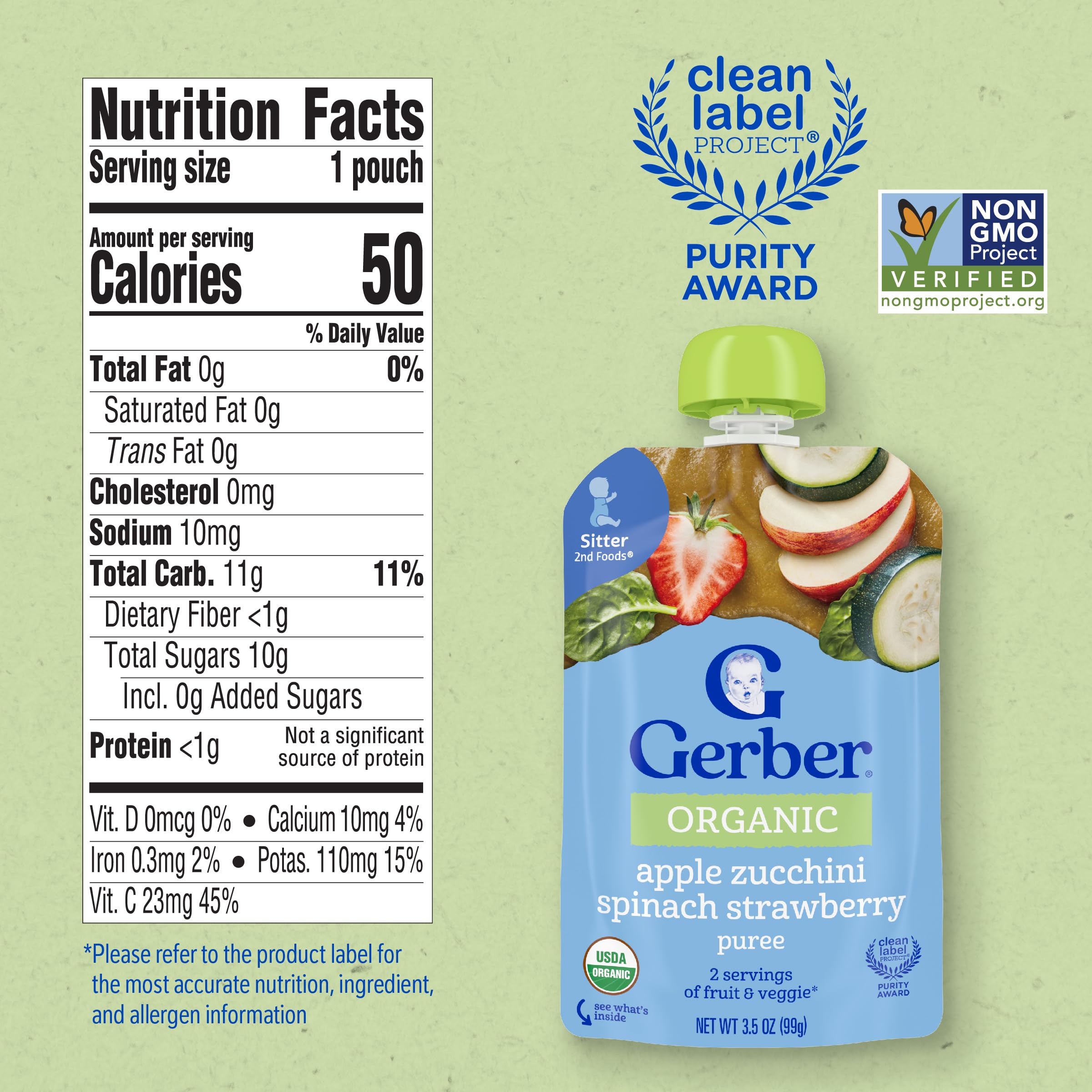 It's not just organic, it's Gerber. For our Gerber Organic 2nd Foods Apples, Zucchini, Spinach & Strawberries baby food we work with US farmers like Campbell Orchards in Yakima, WA, who grow our organic apples with love and care. Now features our proprietary Smart Flow spout: flow control means more on your little one's spoon, not everywhere else.