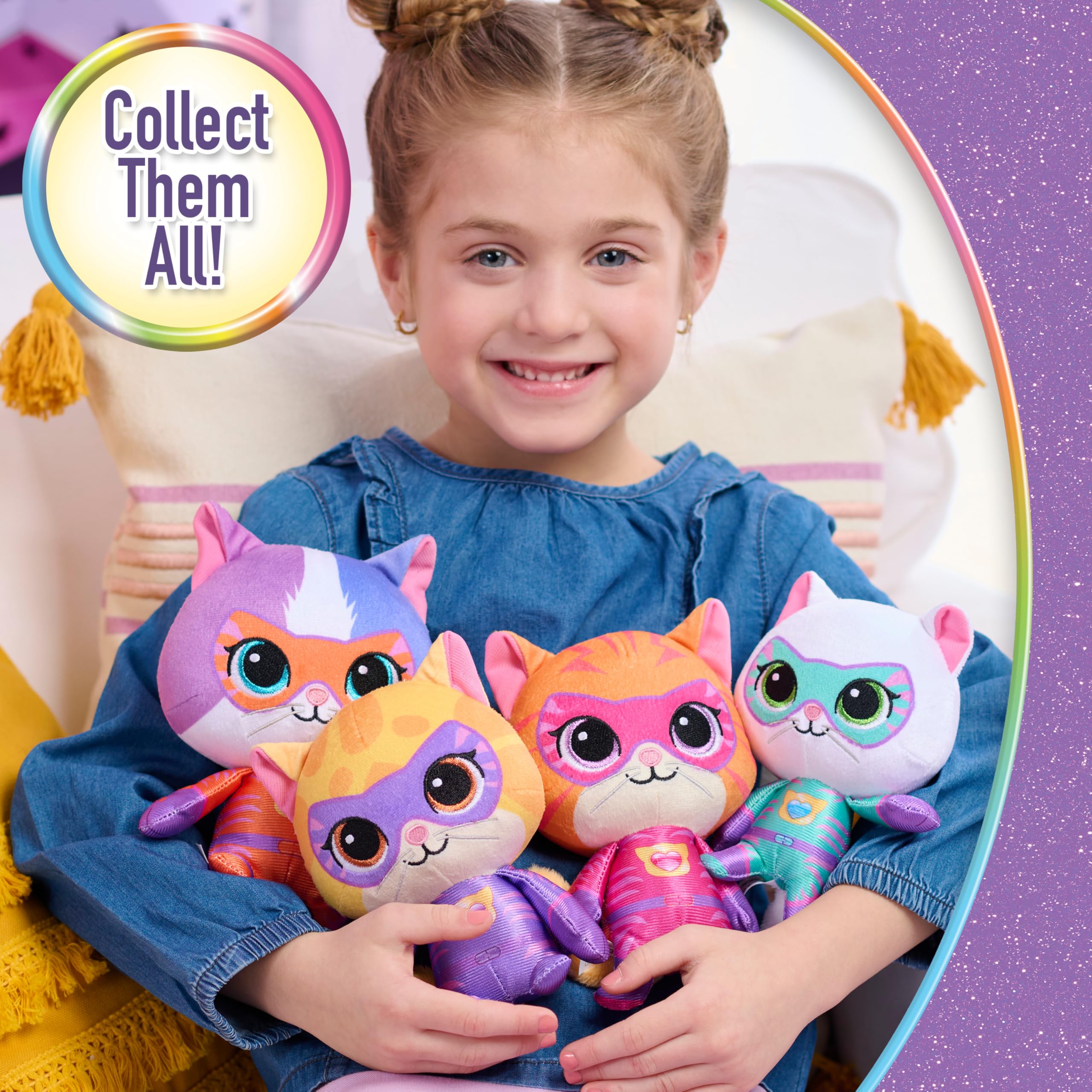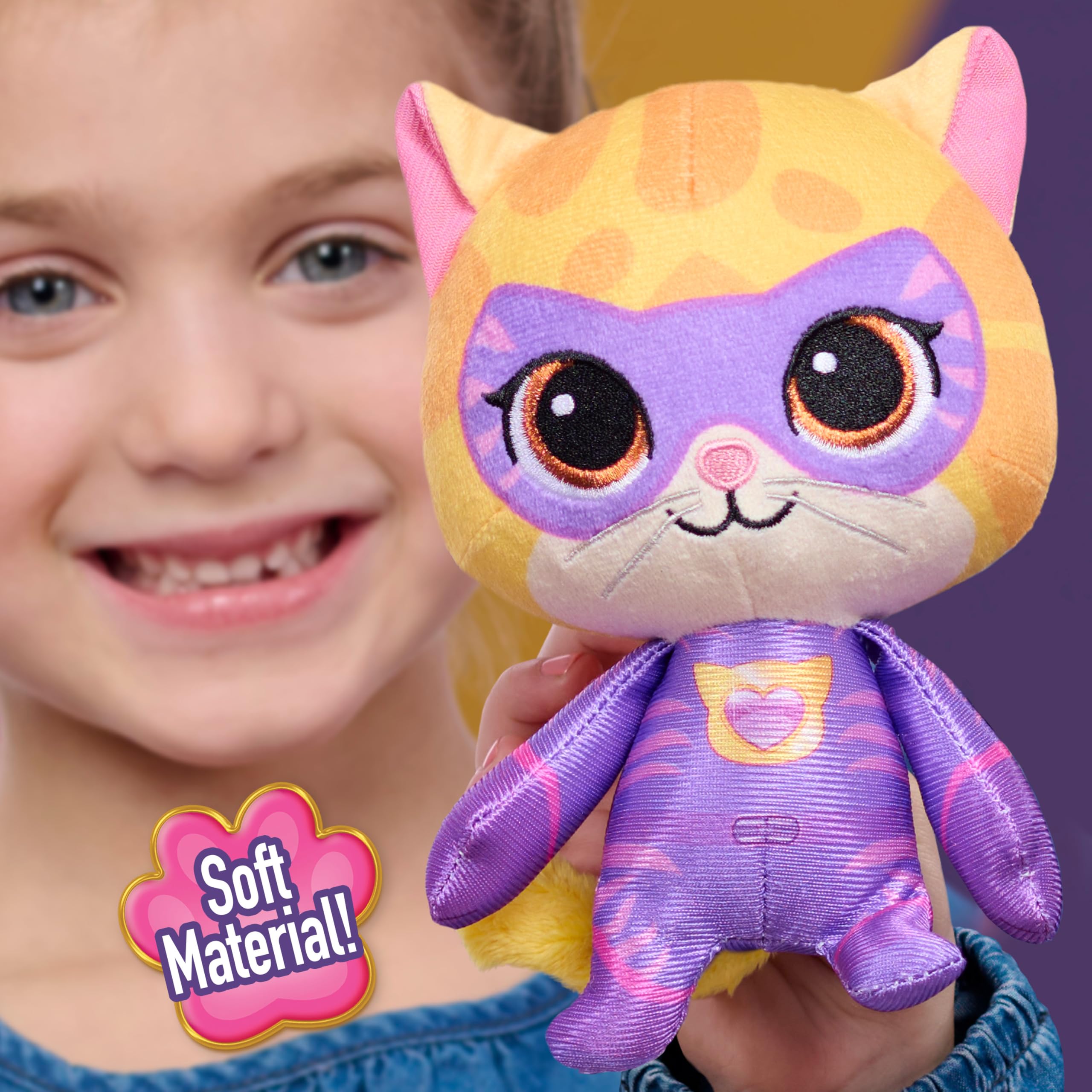 Super Character Details: Made of soft mixed fabrics with printed and embroidered details, this colorful Sparks plushie features yellow fur, purple Su-Purr Wild hero suit, and sparkly brown eyes.