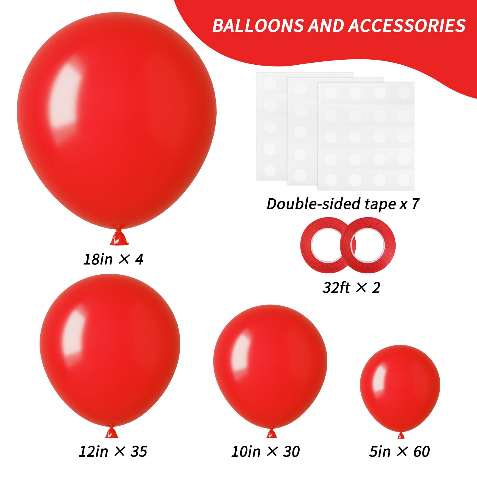 RED BALLOONS KIT: Includes 129 red balloons(globos rojos) - 18inch 4pcs, 12inch 35pcs, 10inch 30pcs, 5inch 60pcs and 7 pieces of glue, 2 rolls of ribbon of the same color.