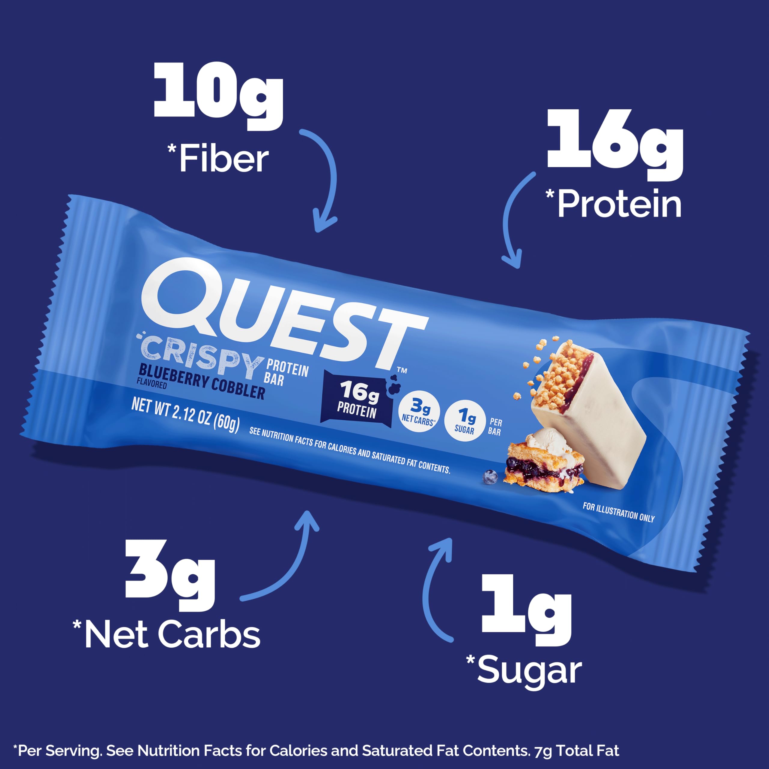PROTEIN FORWARD. 16g of protein, 1g of sugar, and 3g of net carbs* per serving. Support your fitness goals and enjoy a crispy, chewy protein bar with the irresistibly sweet flavor of blueberry cobbler