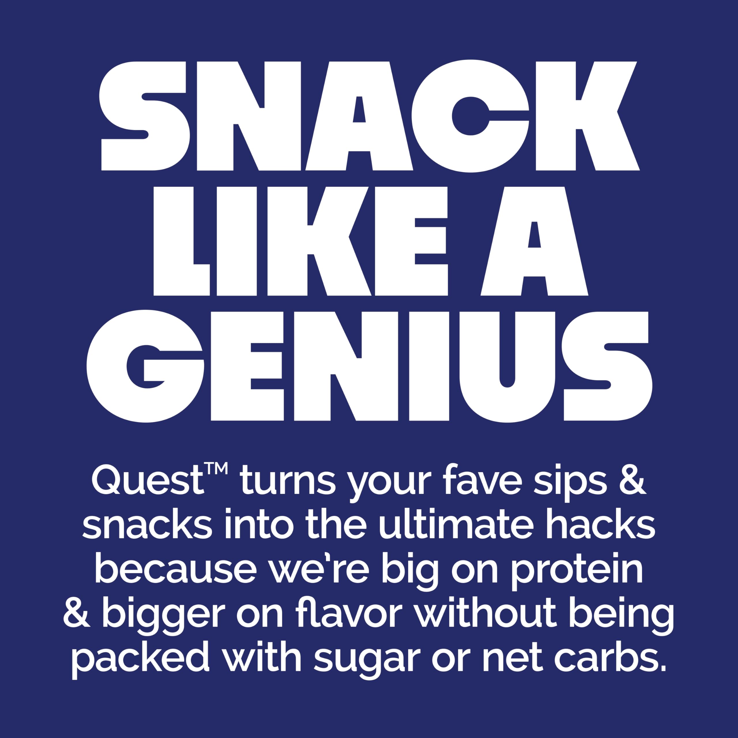 SNACK LIKE A GENIUS. Quest turns your fave snacks into the ultimate hacks. So reaching your goals has never been tastier. Quest is big on protein, low on sugar and huge on flavor. Yep. It’s basically cheating