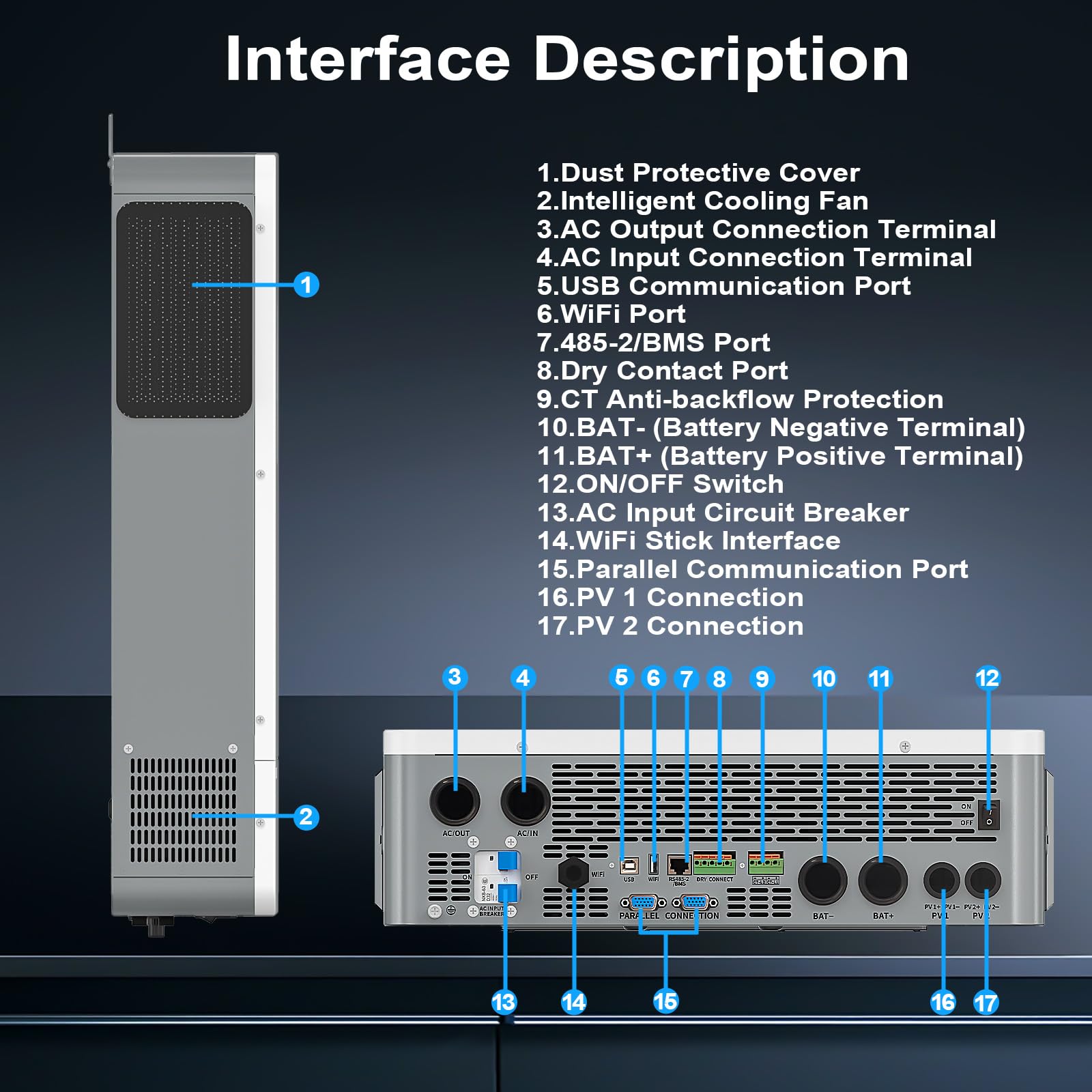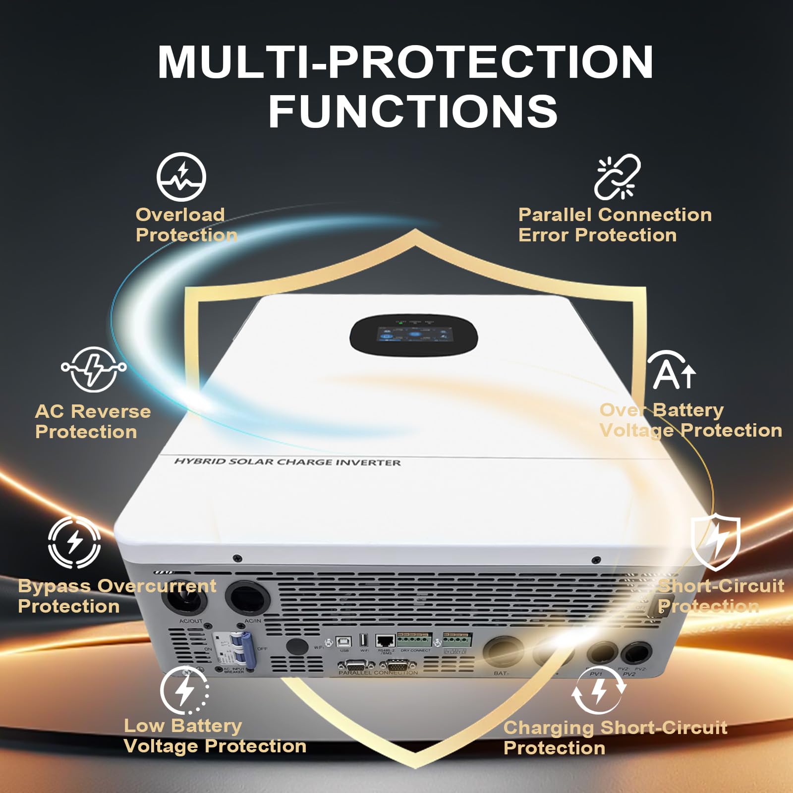 48V All-in-One Multifunction: Integrated solar inverter, dual MPPT solar charger and hybrid UPS in one unit; supports battery-free direct PV supply and hybrid mode, no extra accessories needed, saves installation cost and space for off-grid home & RV use.