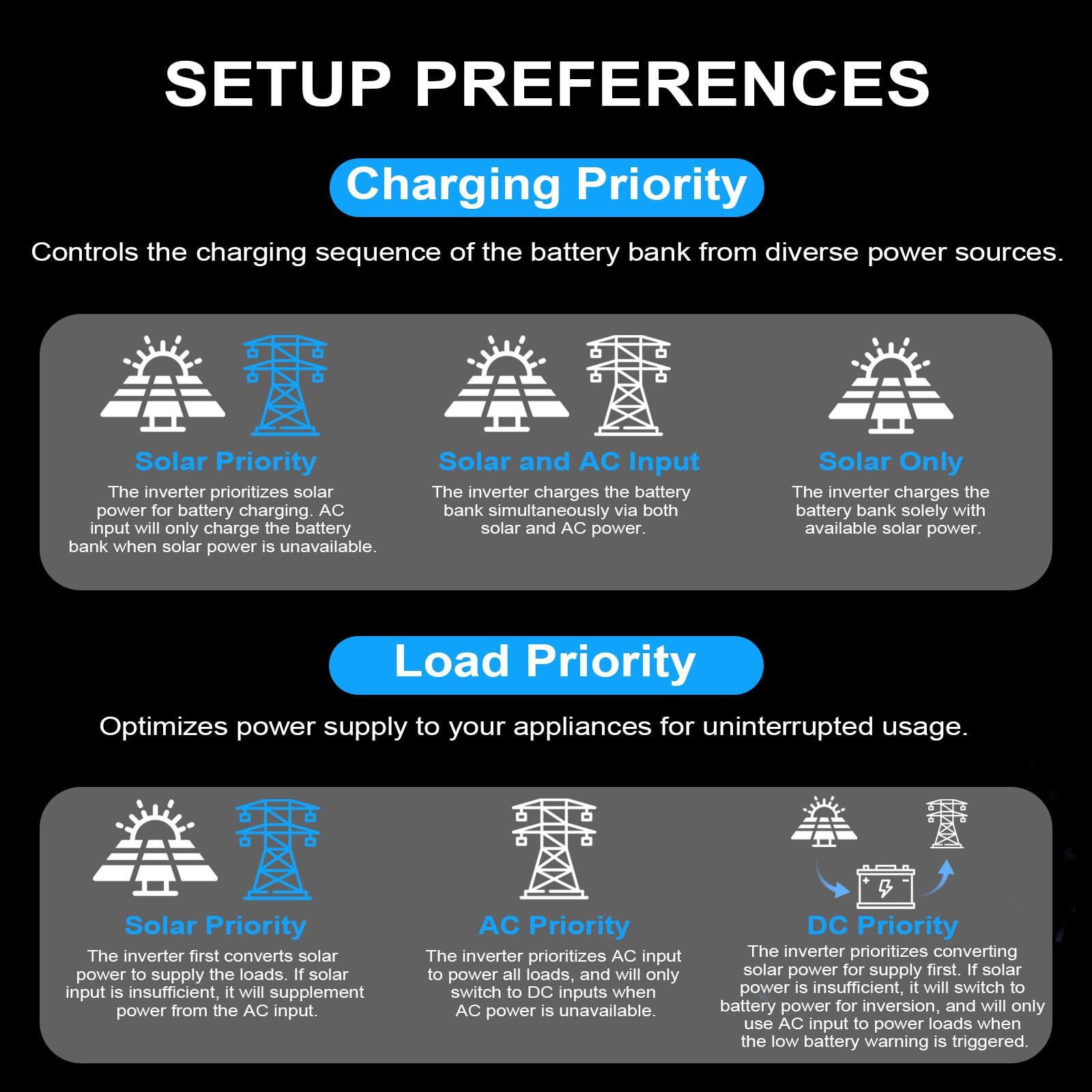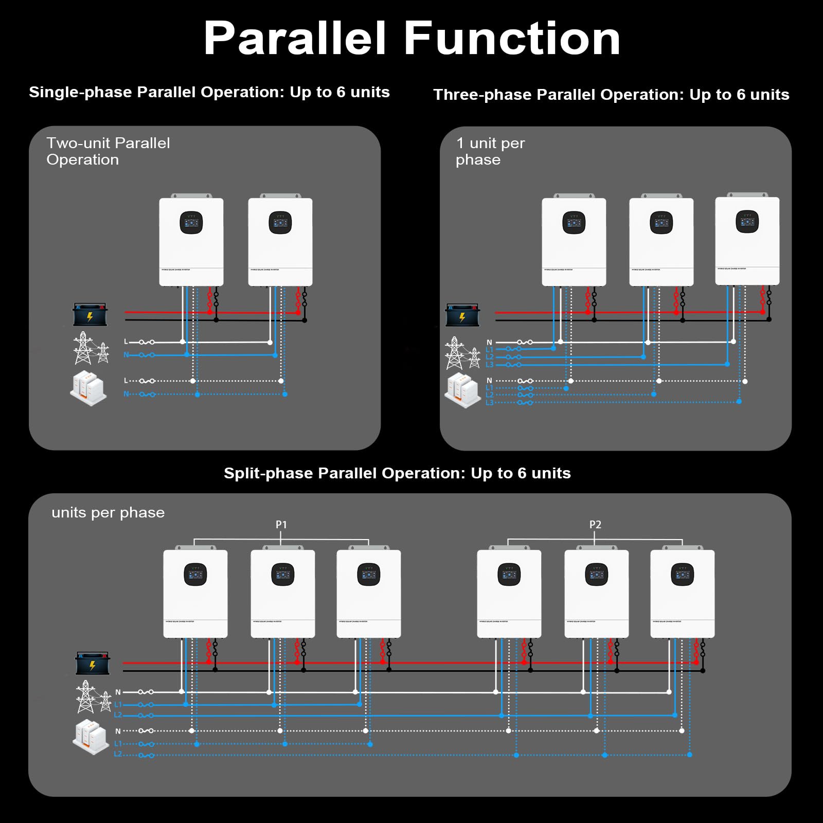 Flexible 120V/240V Output & Parallel Expansion: 48V DC to 120V/240V single&split-phase AC output, perfectly matches North American household circuits; max 6 units parallel to expand total power to 60000W, meets large power demands of big families, farms or small businesses.