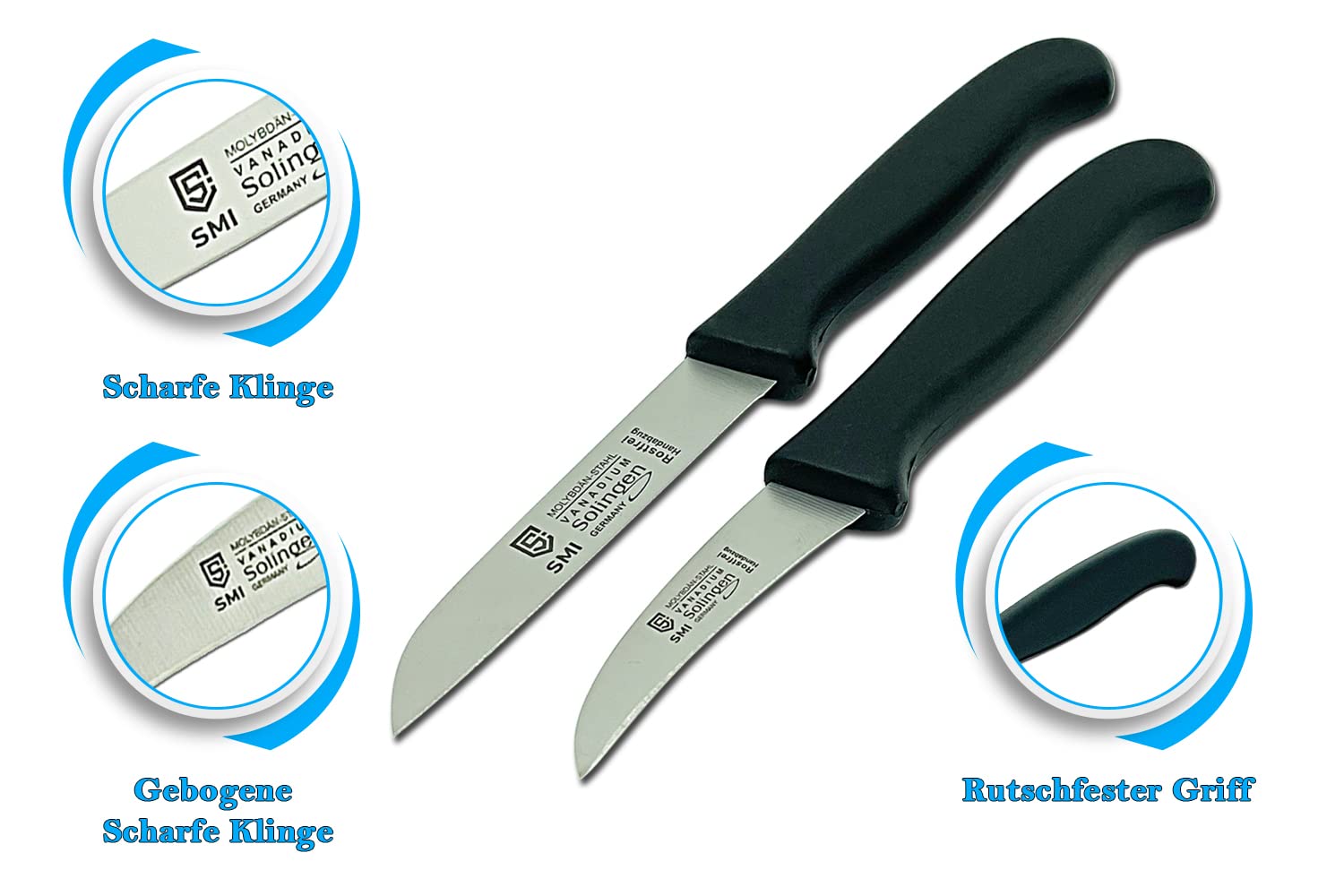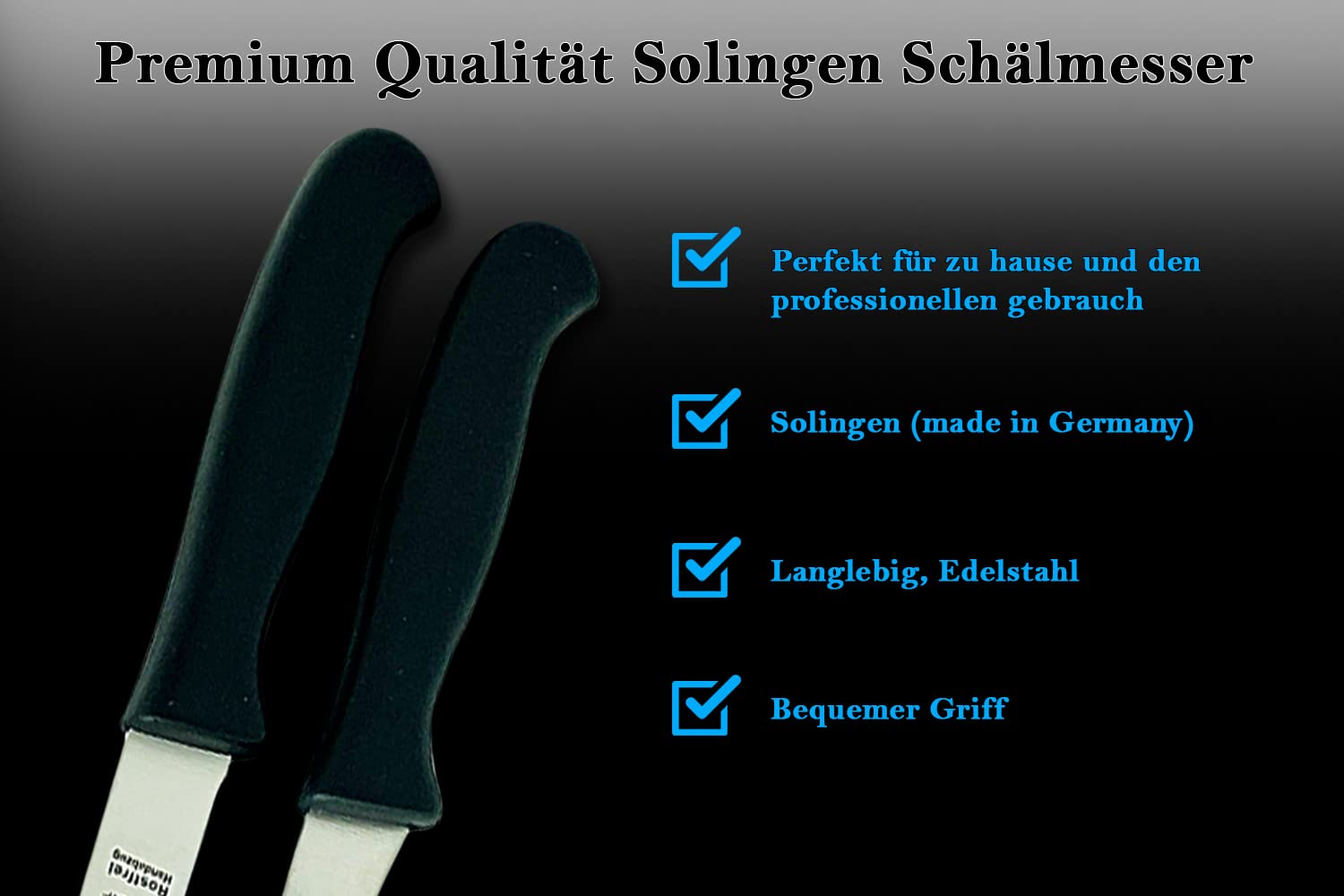 ✅ FOR EVERYDAY USE: Our sharp paring knife / peeling knife set Solingen made is perfect for slicing and chopping of fruits and vegetables smoothly and effectively. Curved blade knife has blade length of 5.5 cm and total length of 15.2 cm and straight blade knife has blade length as 7.8 cm and total length as 17.2 cm.