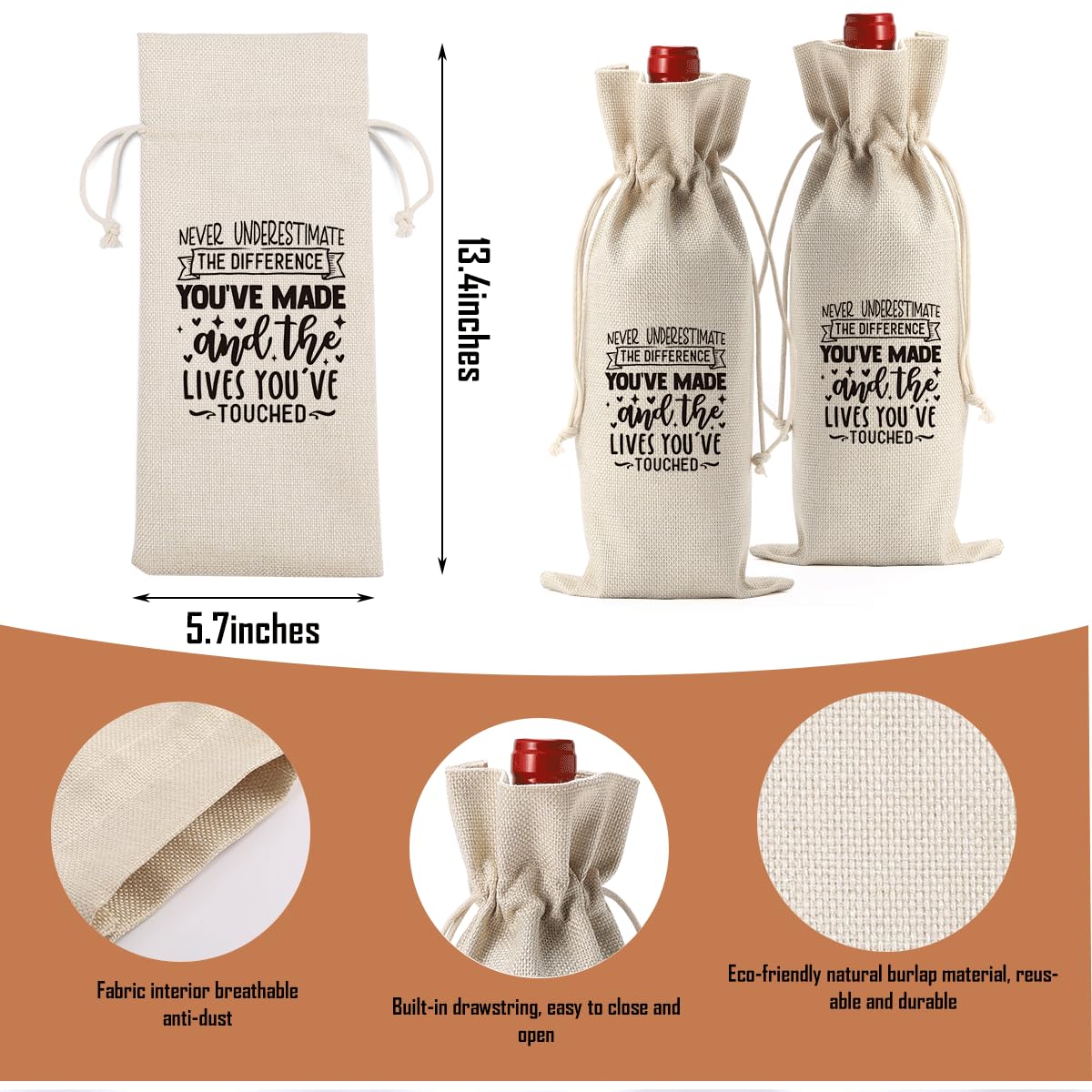 Material and size Our wine bags measure 5.6'' x 12.9'', are made from high-quality burlap and have a drawstring design for easy gift storage. Suitable wine bottle size But Just be mindful of the size of the bottle you choose! A "regular" sized wine bottle would be the best choice to fill the bag. Be suitable for most regular sized 750ml single wine, champagne.