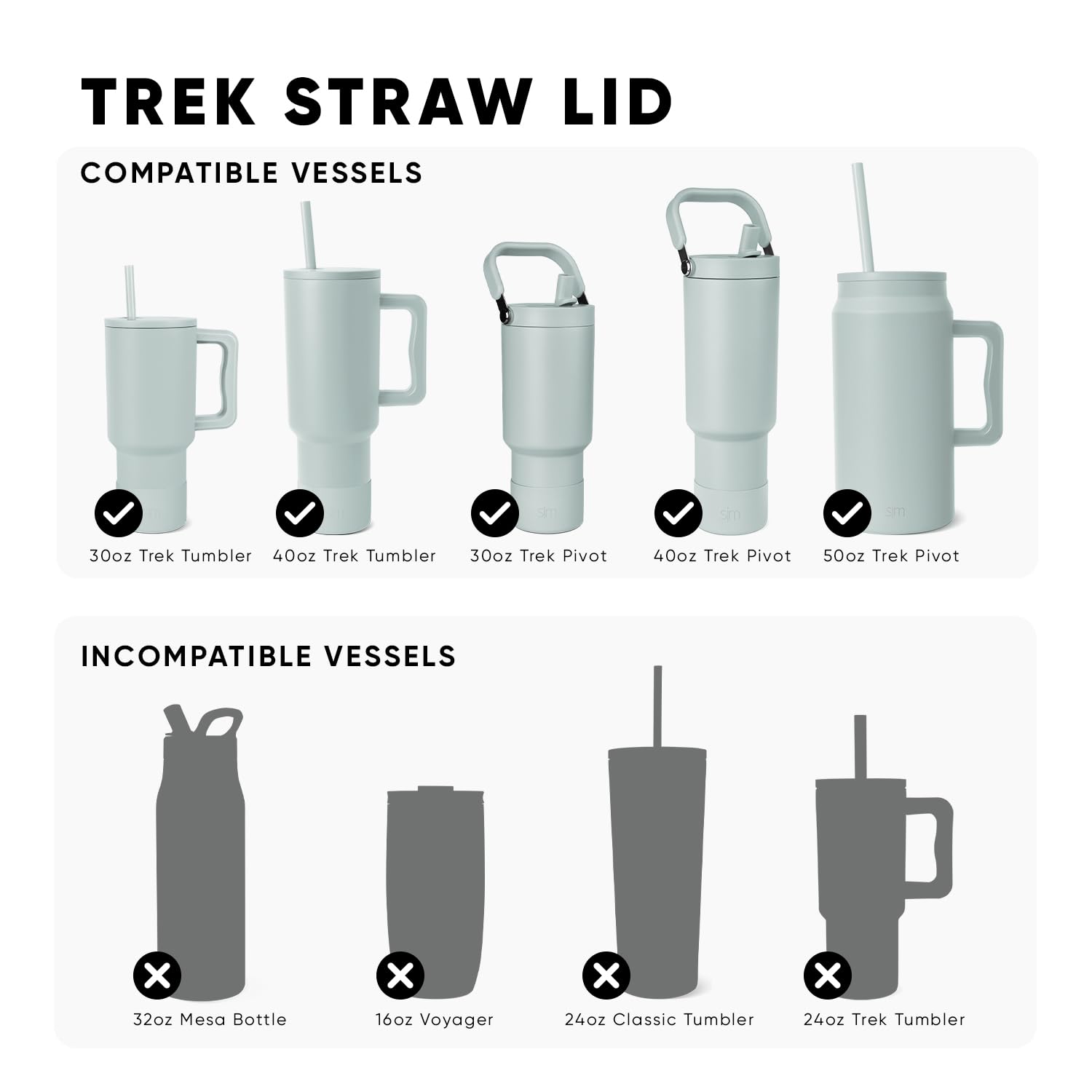 The Simple Modern Trek Straw Lid fits the Simple Modern Trek Tumbler. This Lid has Quarter Turn Lid Technology that allows four different straw placements for your drinking hand preference. With double insulation, keep your water cold for hours, and customize the look of your large form tumbler by choosing from our wide variety of colors.