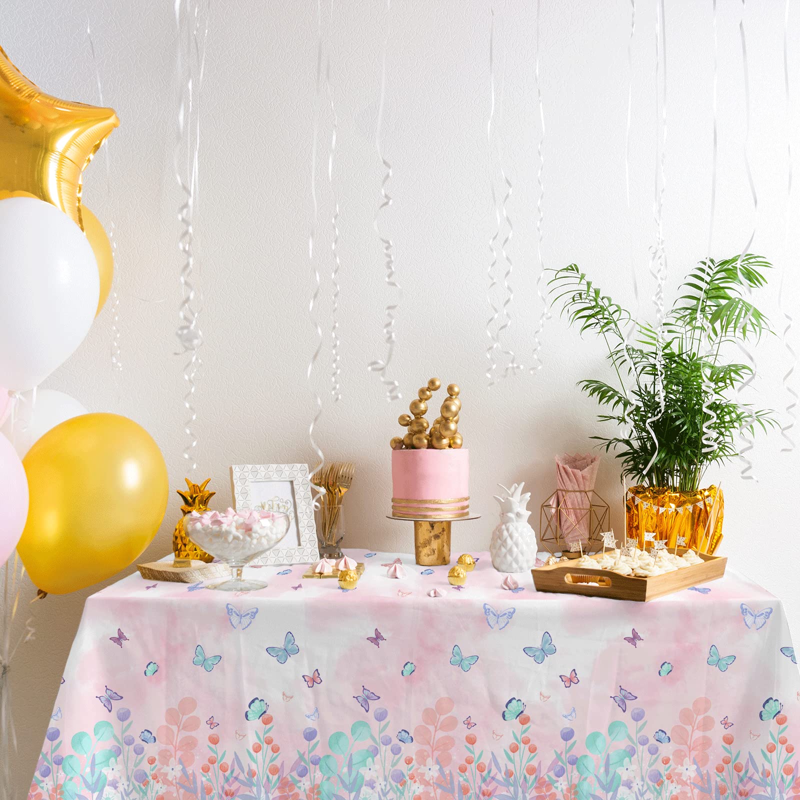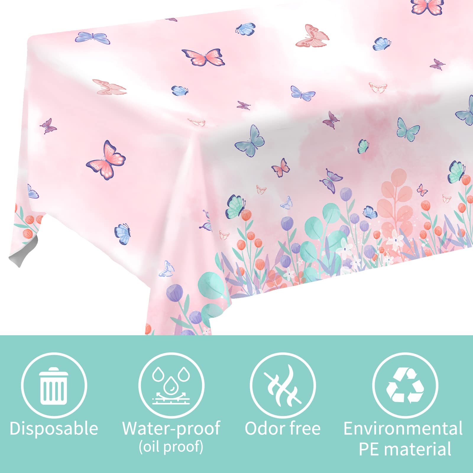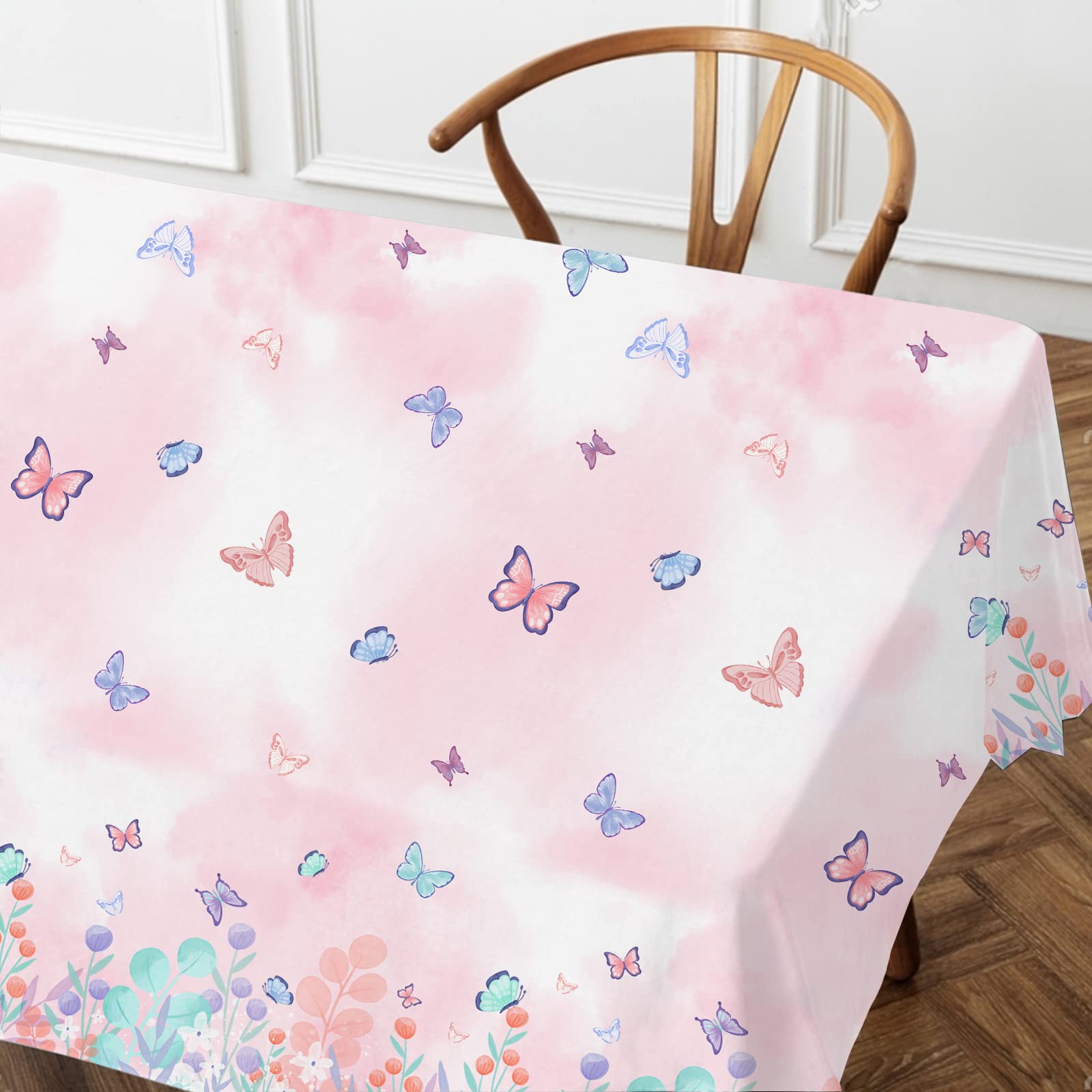 LOVELY DESIGNS: This series party supplies is designed with Butterfly. The Tablecloth have pastel blue, pink, and purple butterflies and blooms on a pink watercolor-style background.