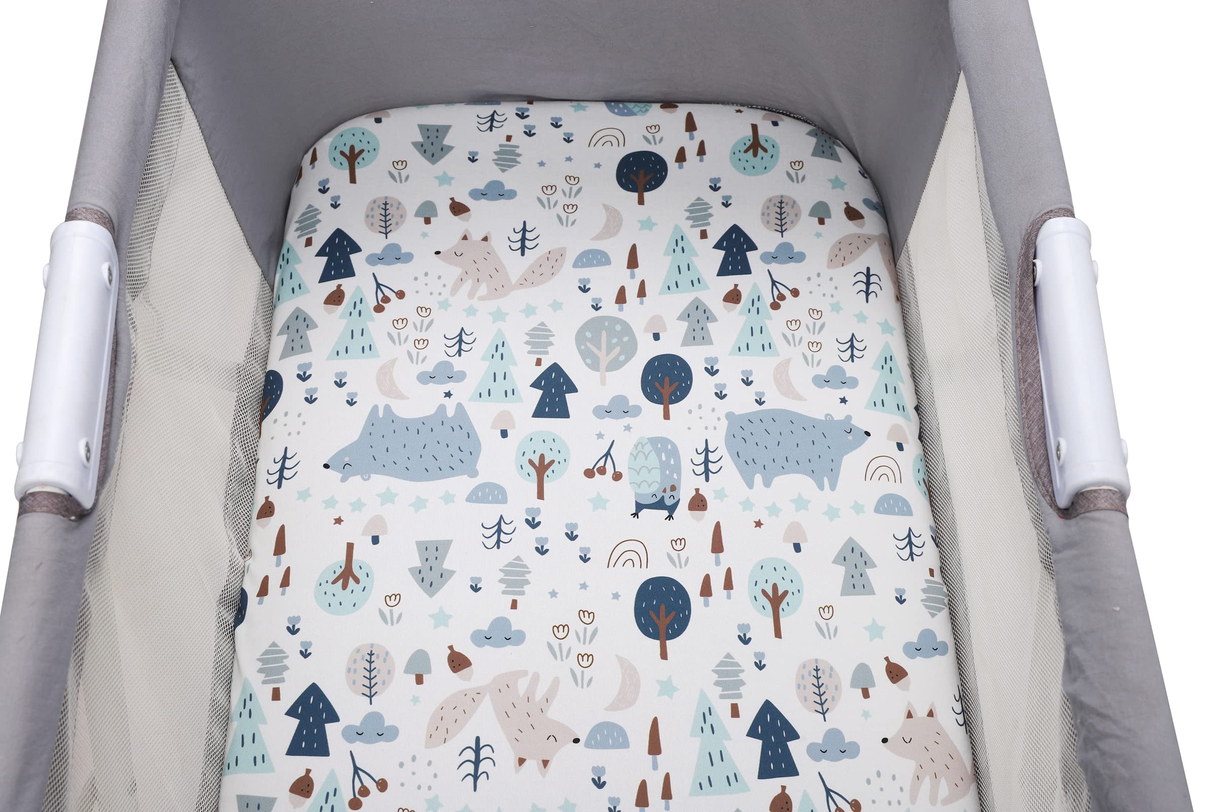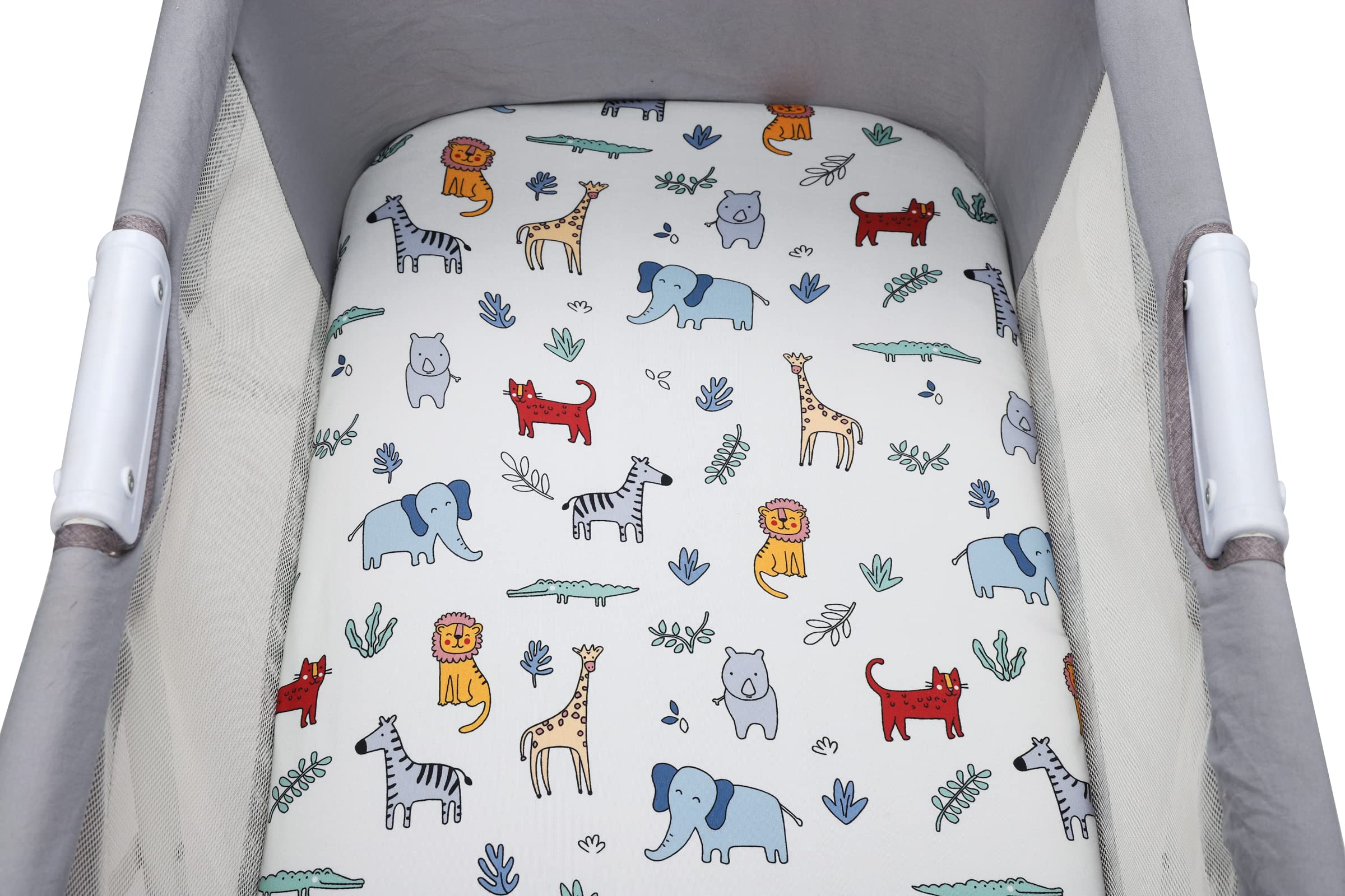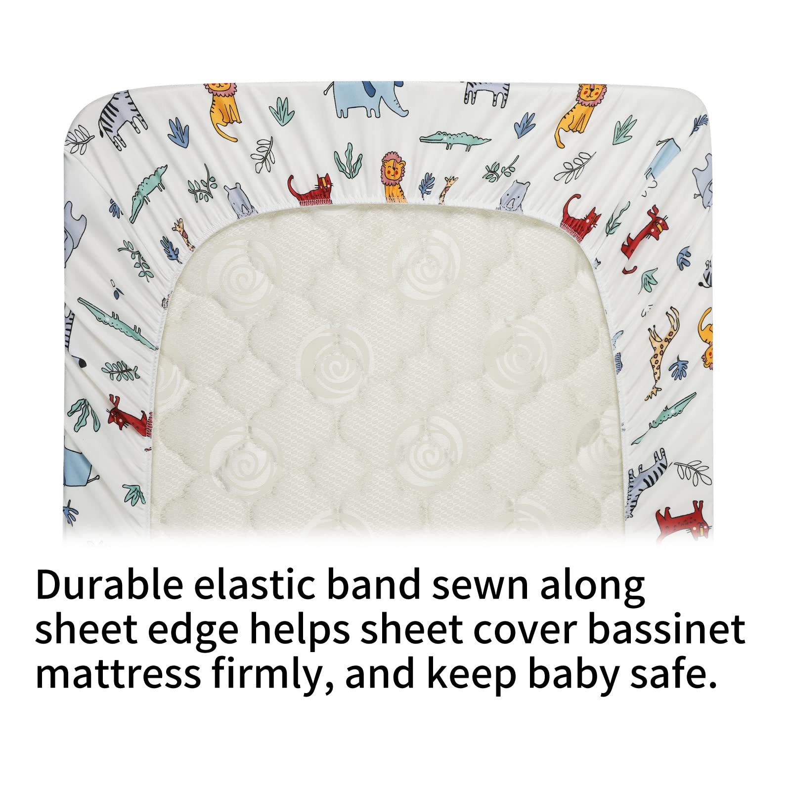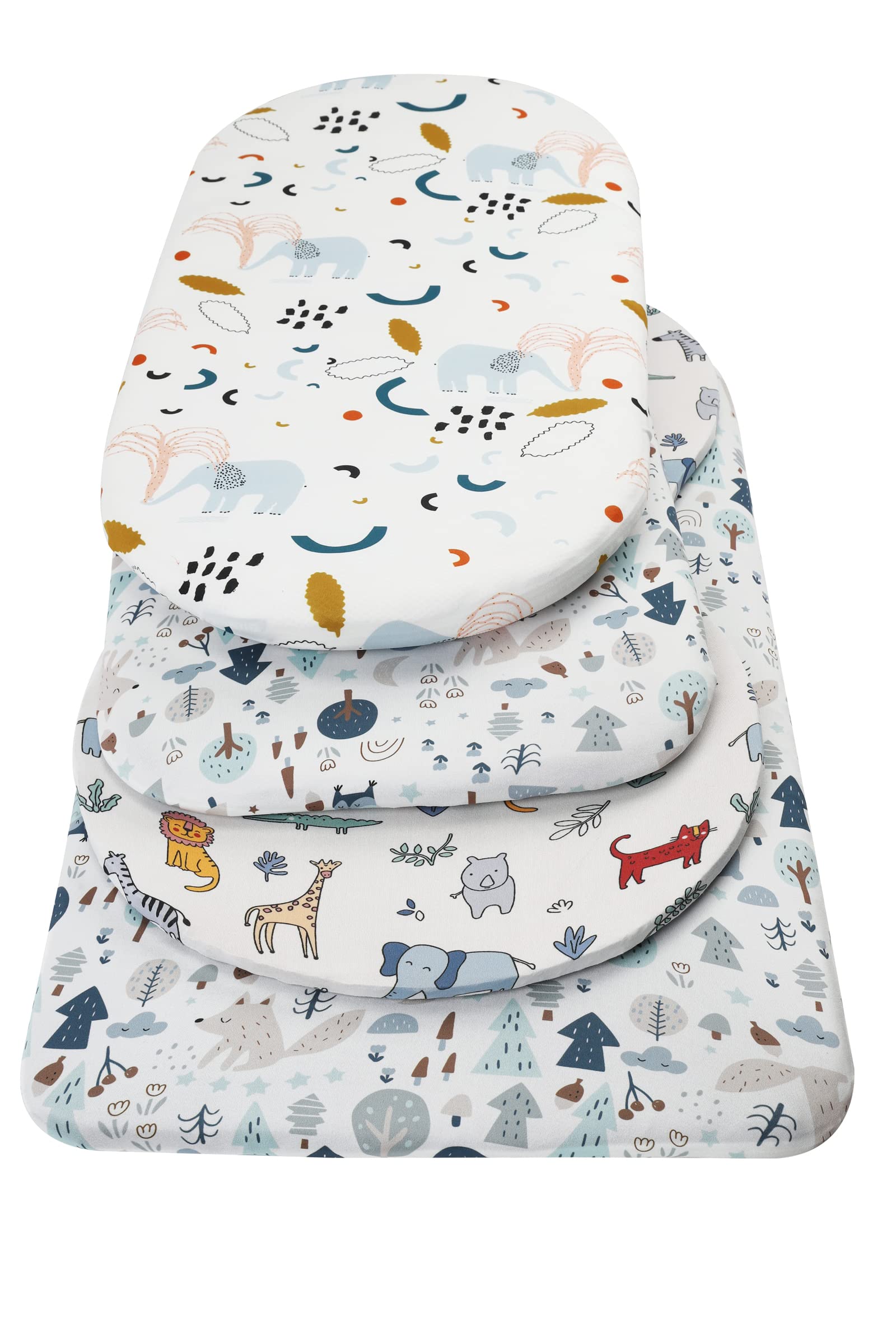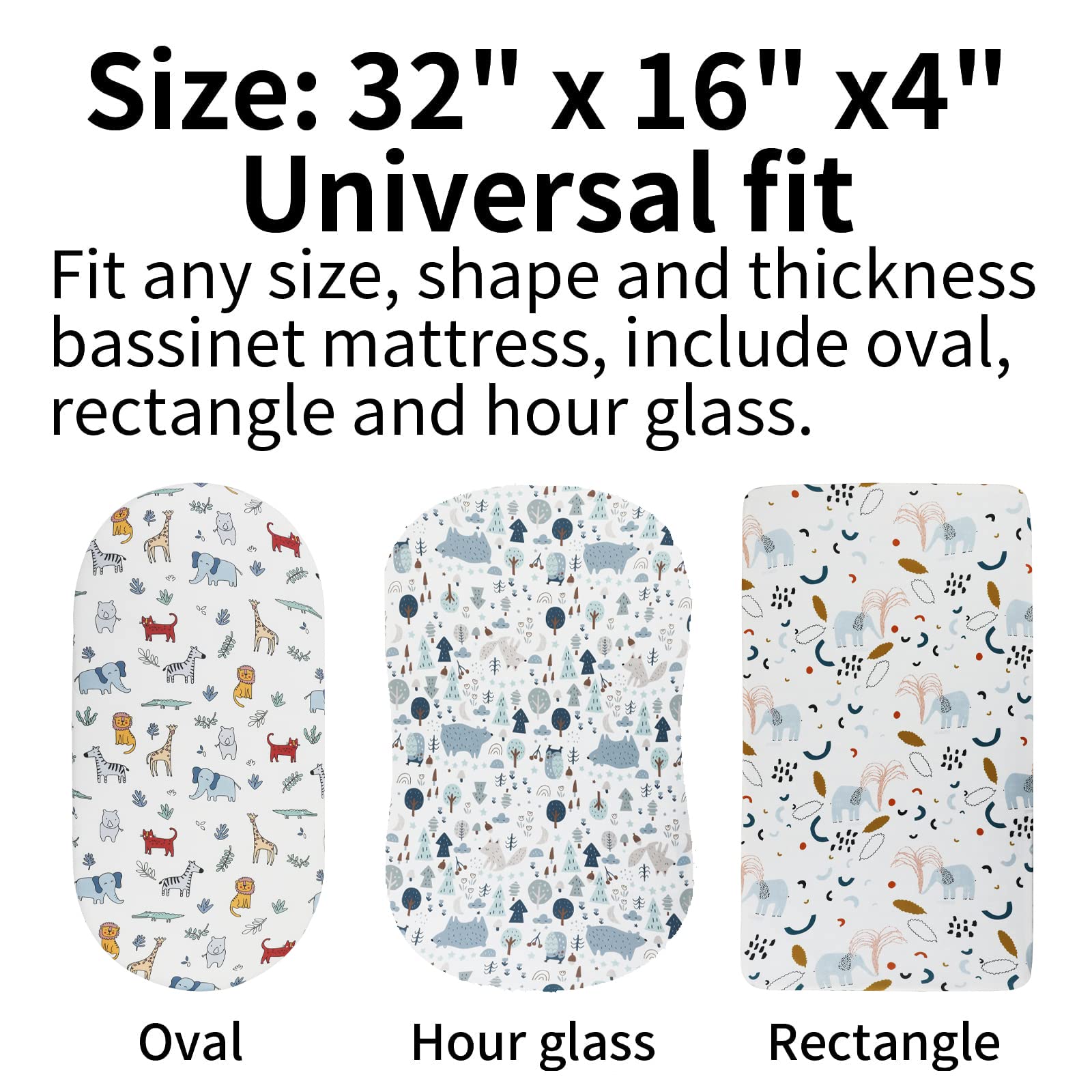 Bassinet Fitted Sheet Set 3 Pack for Baby Boy and Girl UNIVERSAL SIZE Each sheet measures 16"x32"x4", this size allows you to fit our sheets on almost rectangle, hour glass and oval bassinet mattresses. Example: 31 x 15 x 1 inch oval bassinet mattresses; 29.5 x 18 x 1 inch hourglass bassinet mattresses; 32 x 16 x 2 inch rectangle bassinet mattresses and 29 x 14 x 2 inch rectangle bassinet mattresses. 360Β°ELASTIC BAND With long-lasting elastic band around the edge provides a secure and snug fit, say goodbye to those sheets which are ill-fitting or bunched up because too loose or too tight. CUTE ANIMAL PRINTING our bassinet sheets match any style baby's room decoration. SOFT, SKIN-FRIENDLY FABRIC Our bassinet sheets are made of premium quality jersey material, hypoallergenic and breathable, gentle to touch, safe for baby delicate skin. It will help your little one sleep comfortably and peacefully! GREAT VALUE Our 3 pack sheets allows you to always have a clean sheet on hand. CARE TIPS: Warm gentle machine wash separately before use Don't bleach line dry only Warm iron if required Don't dry clean