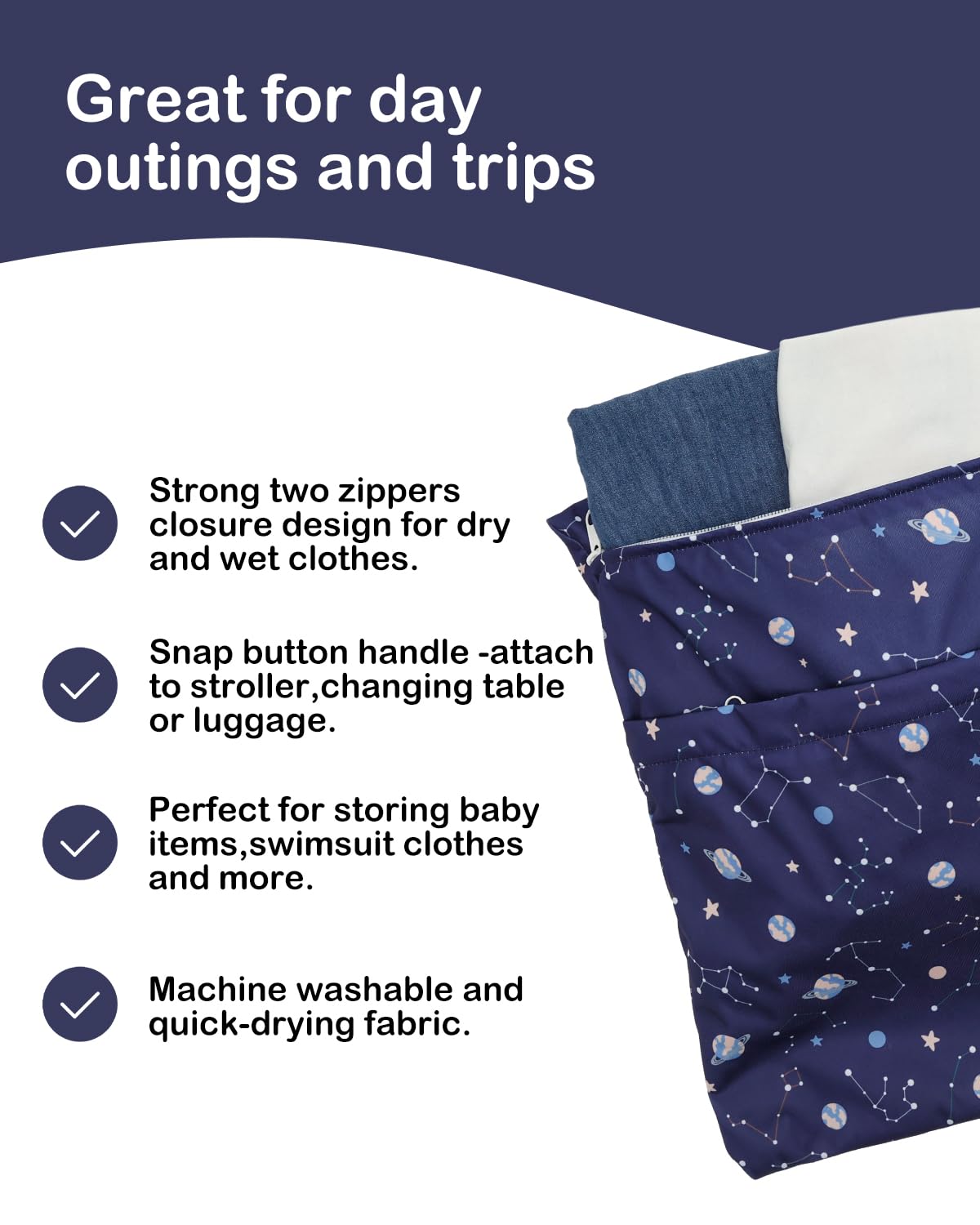 Multi-functional Bags-A truly wonderful bag that allows you to carry your wet and dry items in the same bag. Carry all your items in one bag while keeping your dry items dry and your wet or soiled items separate. Truly an all in one bag! They can be used as diaper wet dry bags,travel bags,storage bags,cosmetic bags,handbags,wash bag,organizer bags.