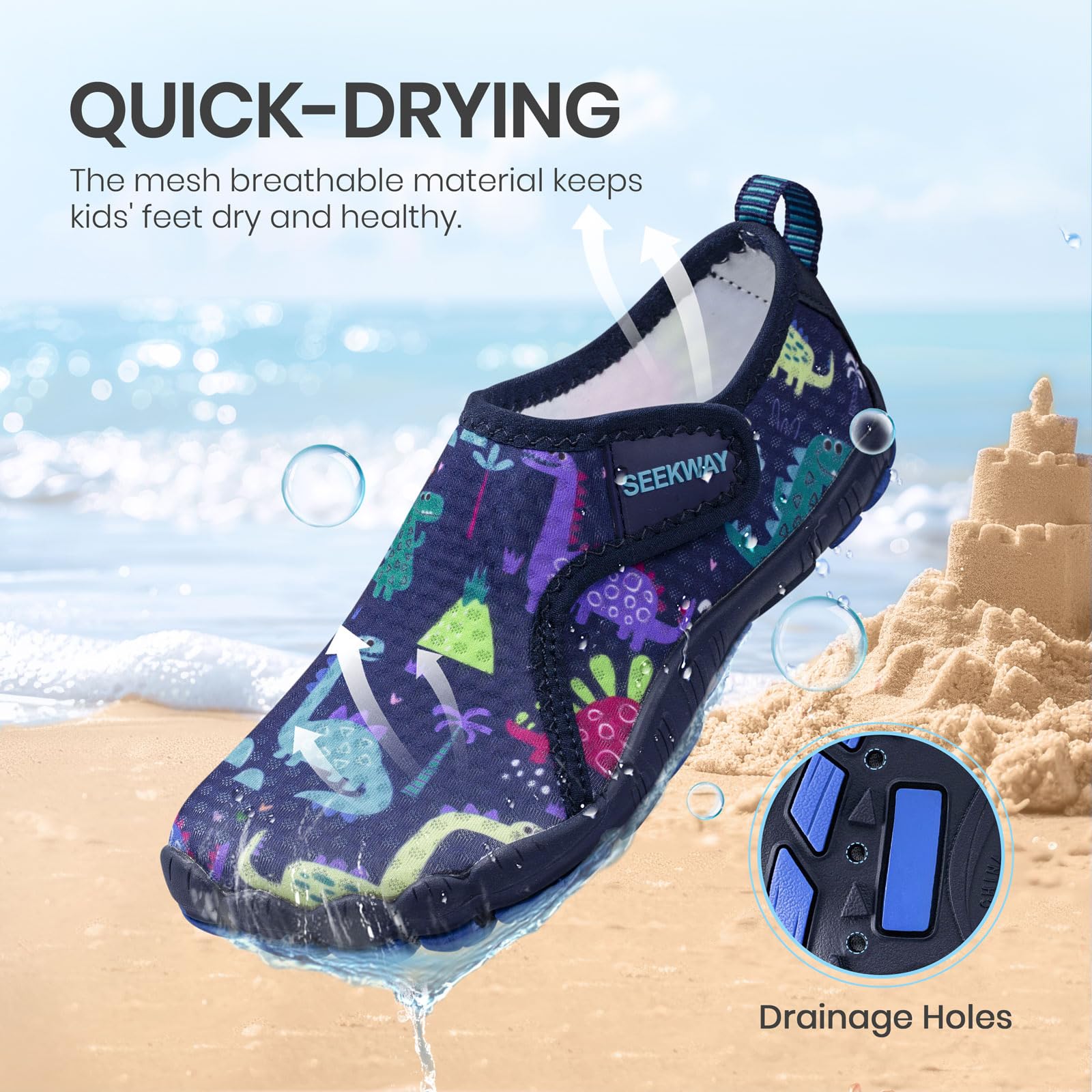 【Breathable & Permeable Material】: The mesh breathable material on the upper combined with drainage holes on the outsole keeps kids' feet dry and healthy.