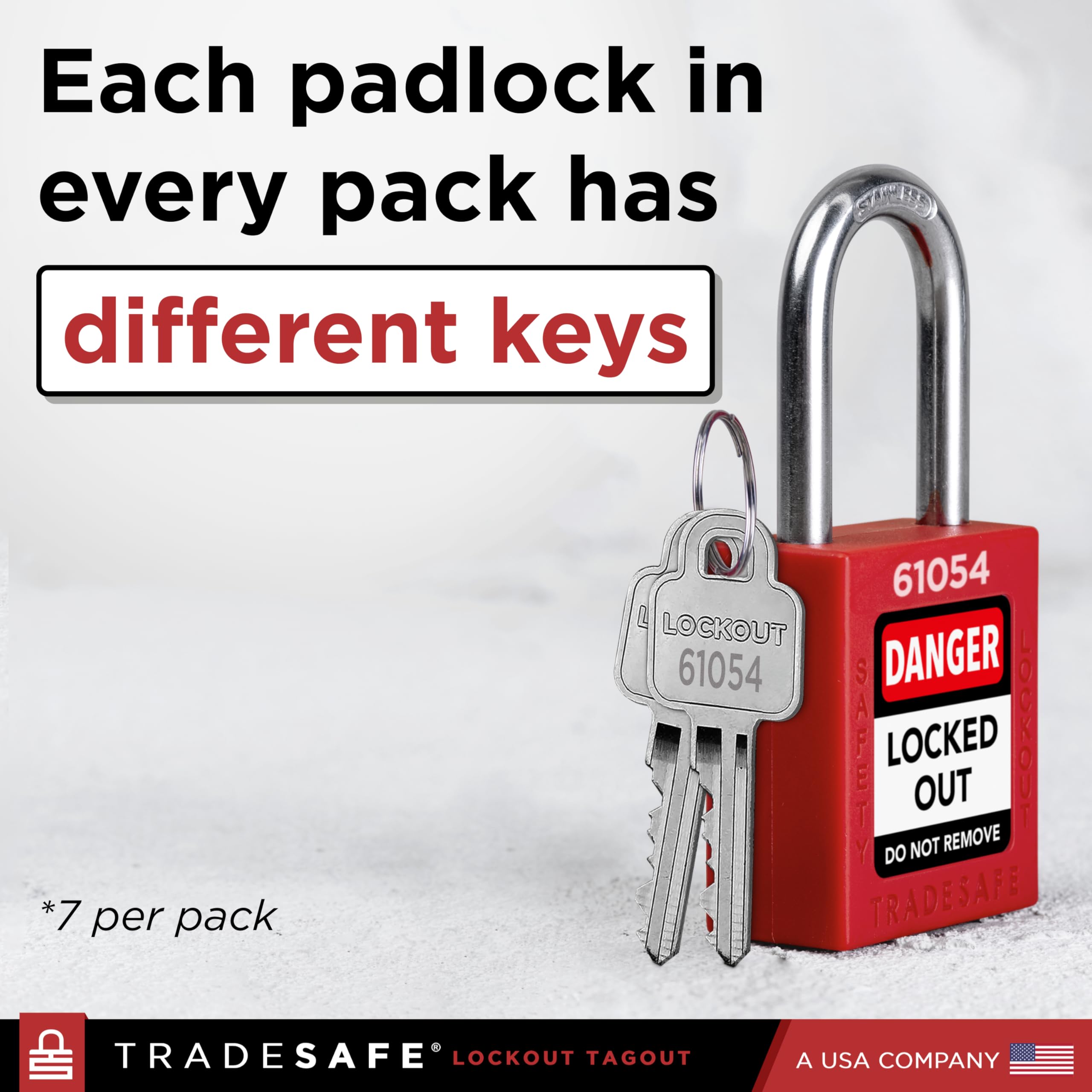 Premium Lockout Tagout Lock Set - (7) Red lockout tag out locks keyed different with 1-1/2 inch long stainless steel shackle, 1/4-inch shackle diameter, 2 keys per tagout lock; matching code on padlock body and keys, each lock in the pack has a unique code
