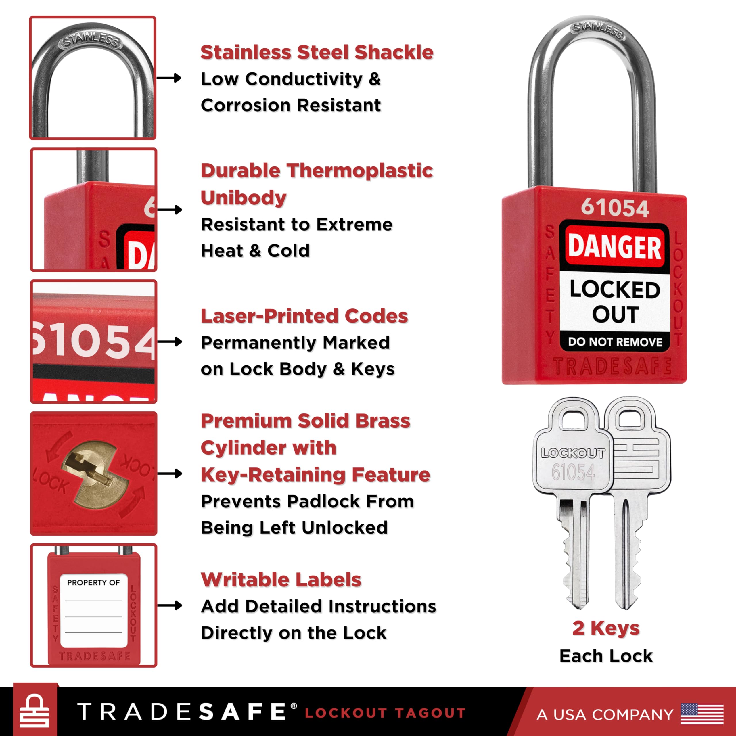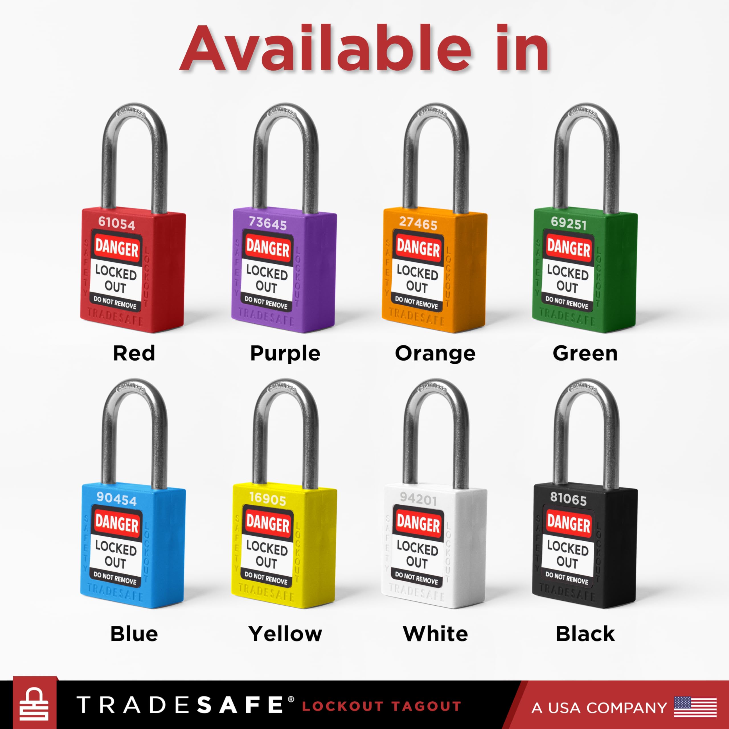 Padlock Lock Out Key Engineered for Safety - Lock out tag out lock with high grade brass core cylinder designed to retain key until shackle is locked, ensures LOTO lock will not be left unlocked