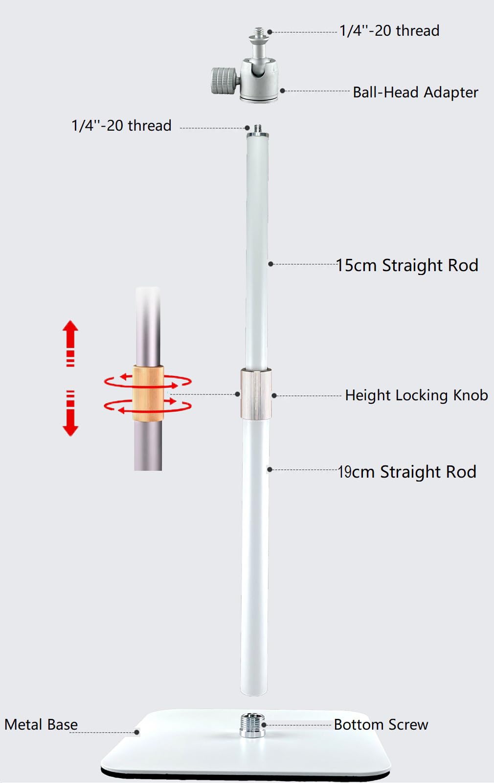 Package Content: 1xWhite Desktop Stand with 1/4''-20 thread; 1x White Metal Base; 1x Silver Ball-Head Adapter;