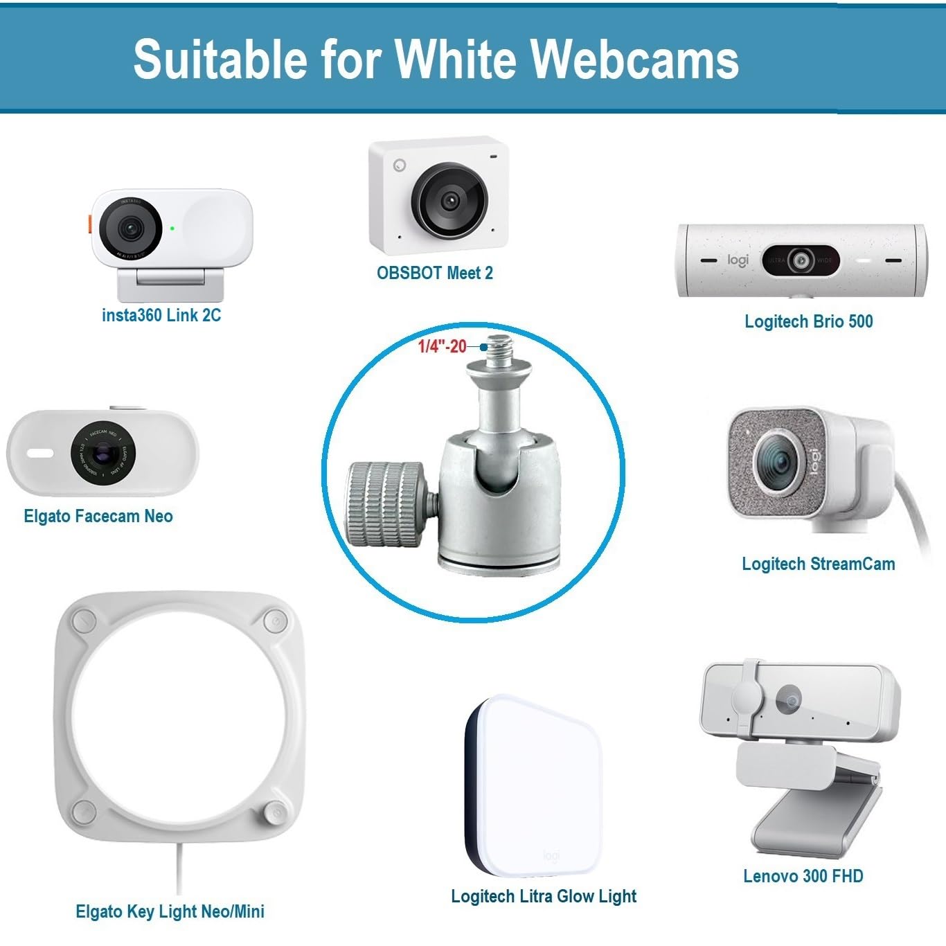 Built-in 1/4" threaded and Ball-Head Adapter included that could be rotated 360 degree, fits for all 1/4" interface webcams, like Logitech Webcam C925e C922x C922 C930e C930 C920 C615,StramCam Brio 4K,MX Brio 4K, Brio 500,Elgate Facecam,Brio 501 500 webcams and LED light,Ring Light,Camera,Camcorder,Key light,light panel etc;;