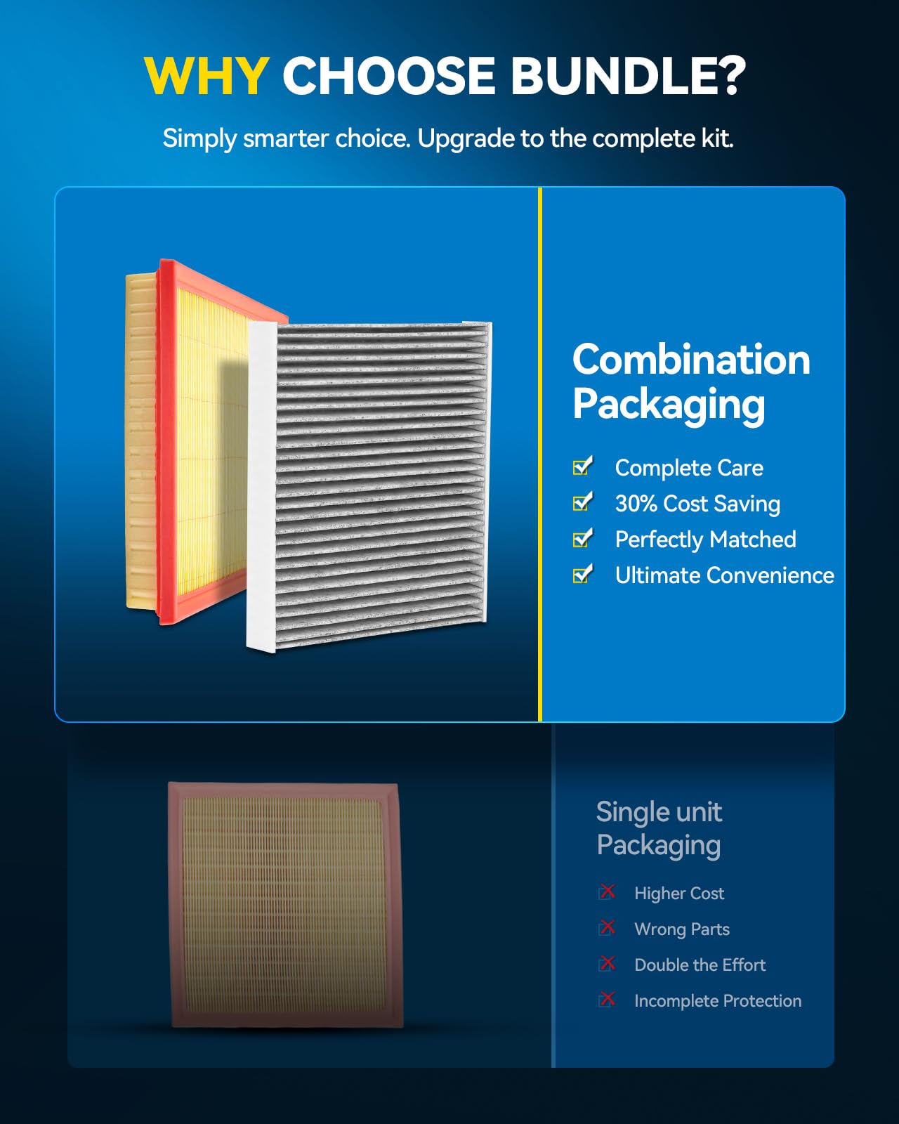 [Ultimate Convenience Bundle]: Skip the hassle of separate purchases! Our curated 2-in-1 kit matches the exact engine & cabin air filters your vehicle needs. Simply enter your make, model, and year for a perfect fit. One click, one box, one-stop shopping that saves you both time and money