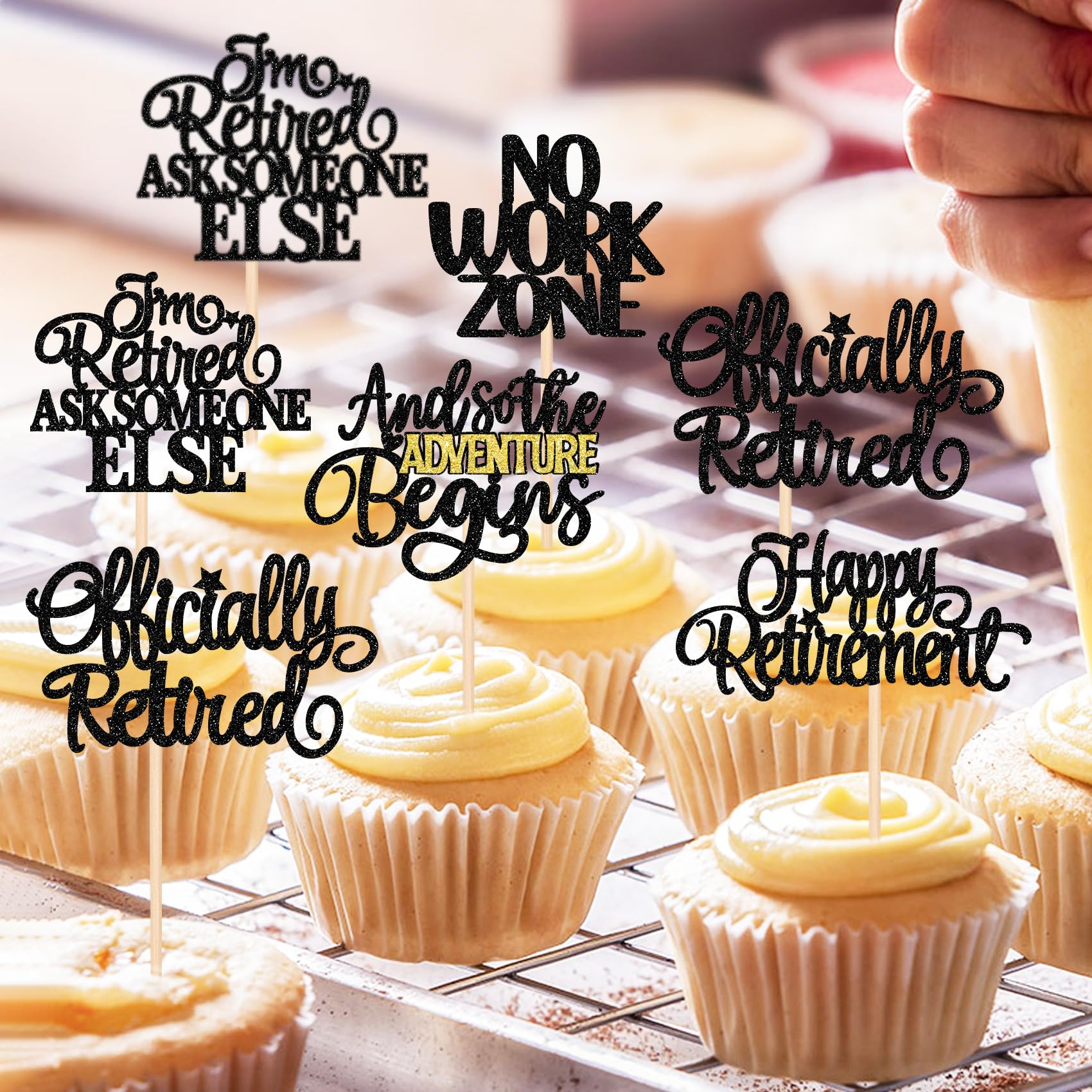 Happy Retirement Cupcake Toppers Officially Retired No Work Zone Adventure Begins Cupcake Picks for Retirement Theme Farewell Birthday Party Cake Decorations Supplies Perfect for happy retirement theme party, official retired theme party, no work zone adventure begins theme party, I'm retired theme party cupcake decorations supplies. Pack of 30 pcs,6 pcs of each design. The size is 1.8 *4.3 inch / 2.7*4.3 inch / 2*4.3 inch / 2.2*4.1 inch / 2.7*4 inch ( with stick ) Made of high quality paper card stock and food grade sticks,thick and sturdy. These cupcake toppers are single glitter, the back is white, and they are intended for decoration only, please do not put them in oven or microwave. If the item you received has any defects, please contact us for refund.we will deal with it within 24 hours.