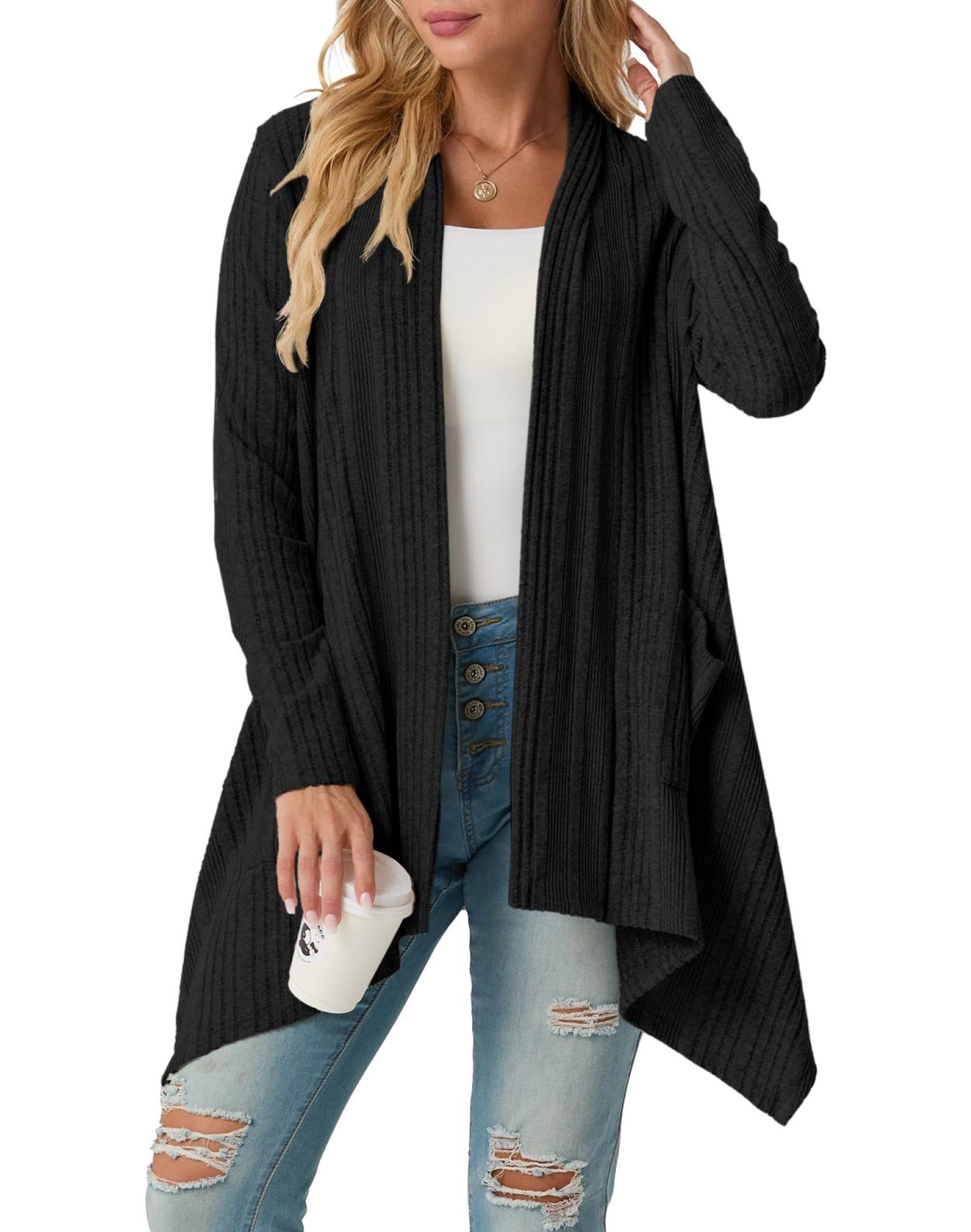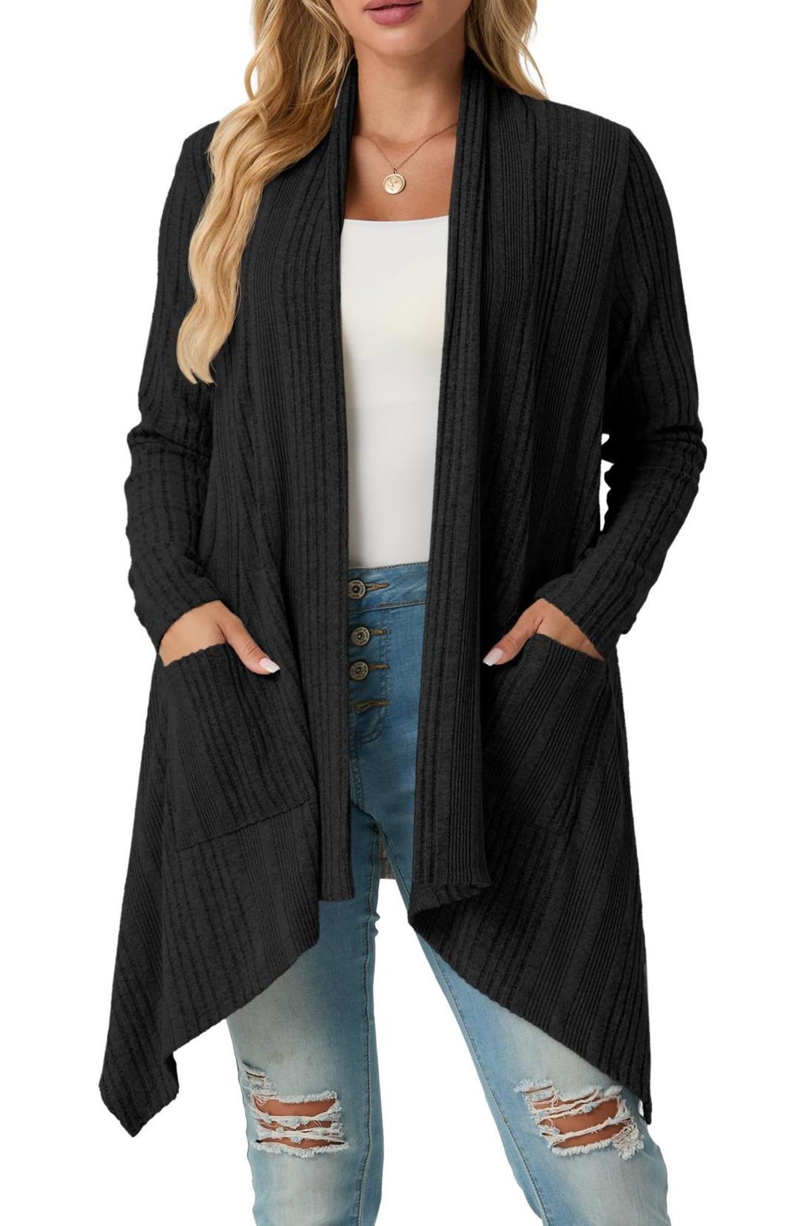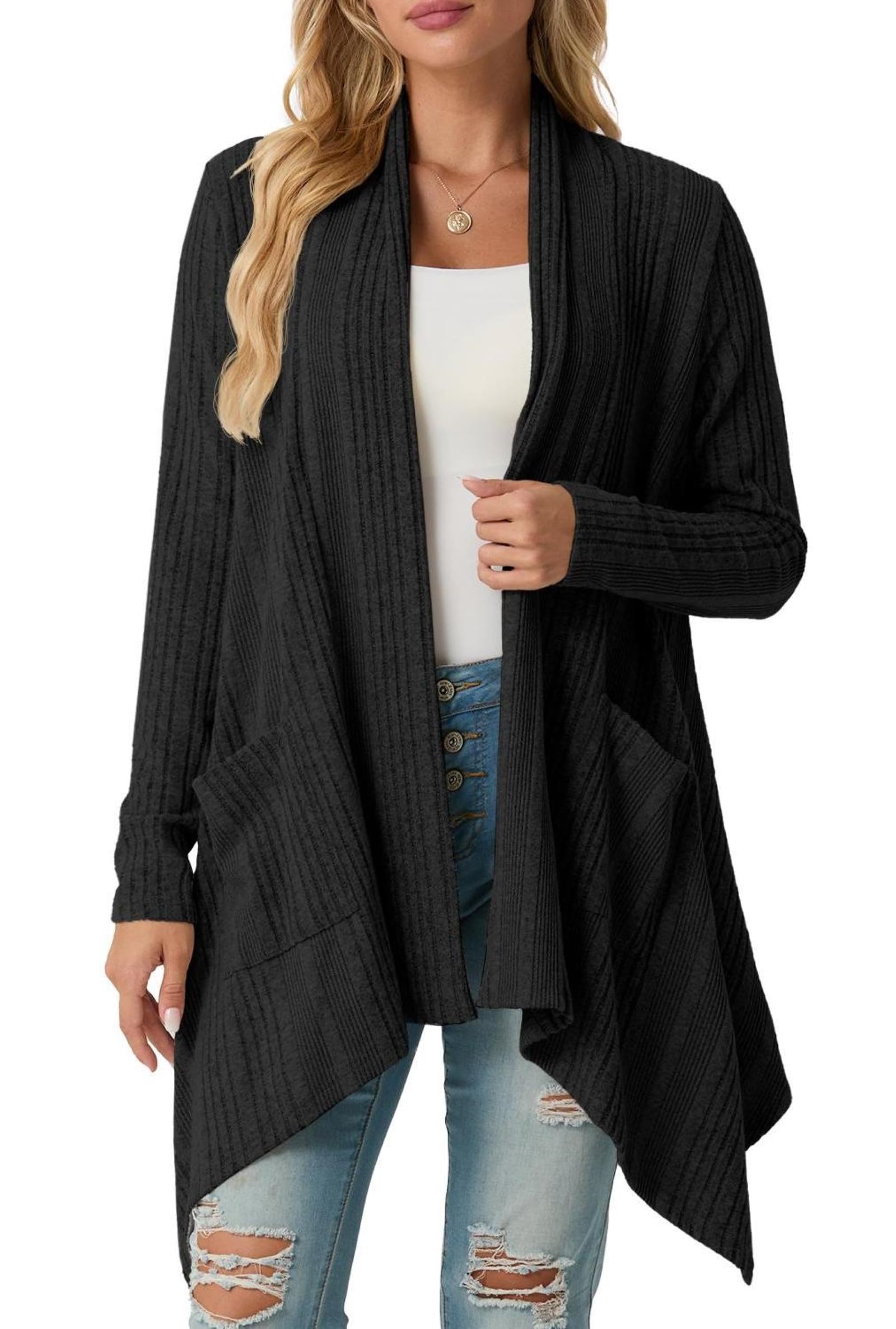 Unique Design: The basic lightweight cardigan features an asymmetrical hem and a shawl neck, while the open-front placket effortlessly creates a refined look.