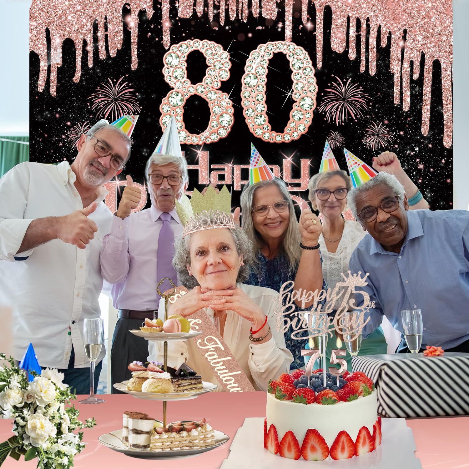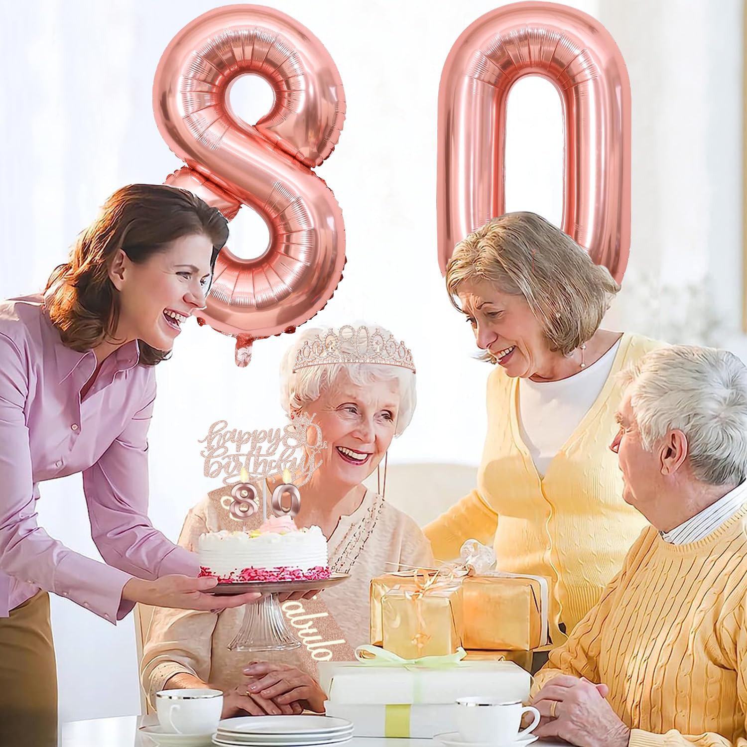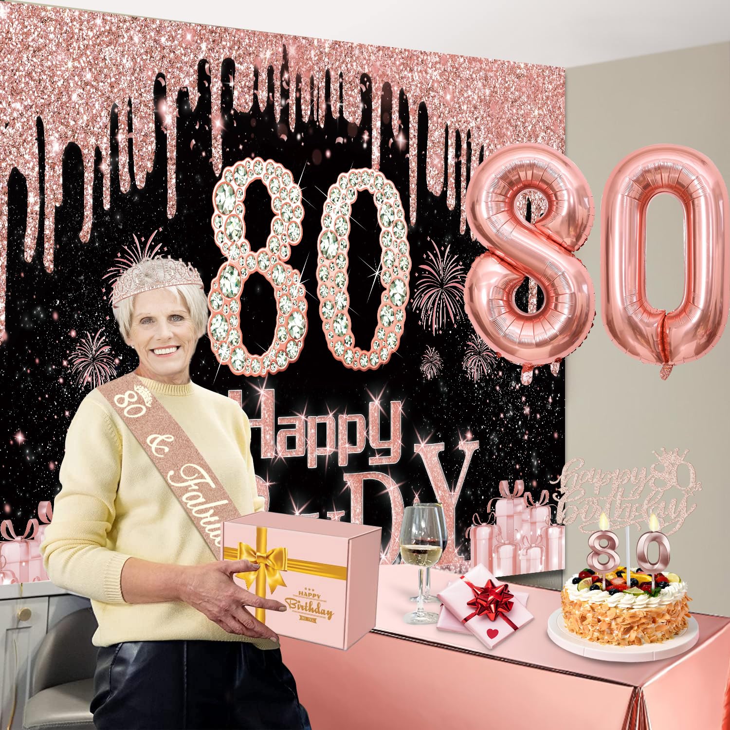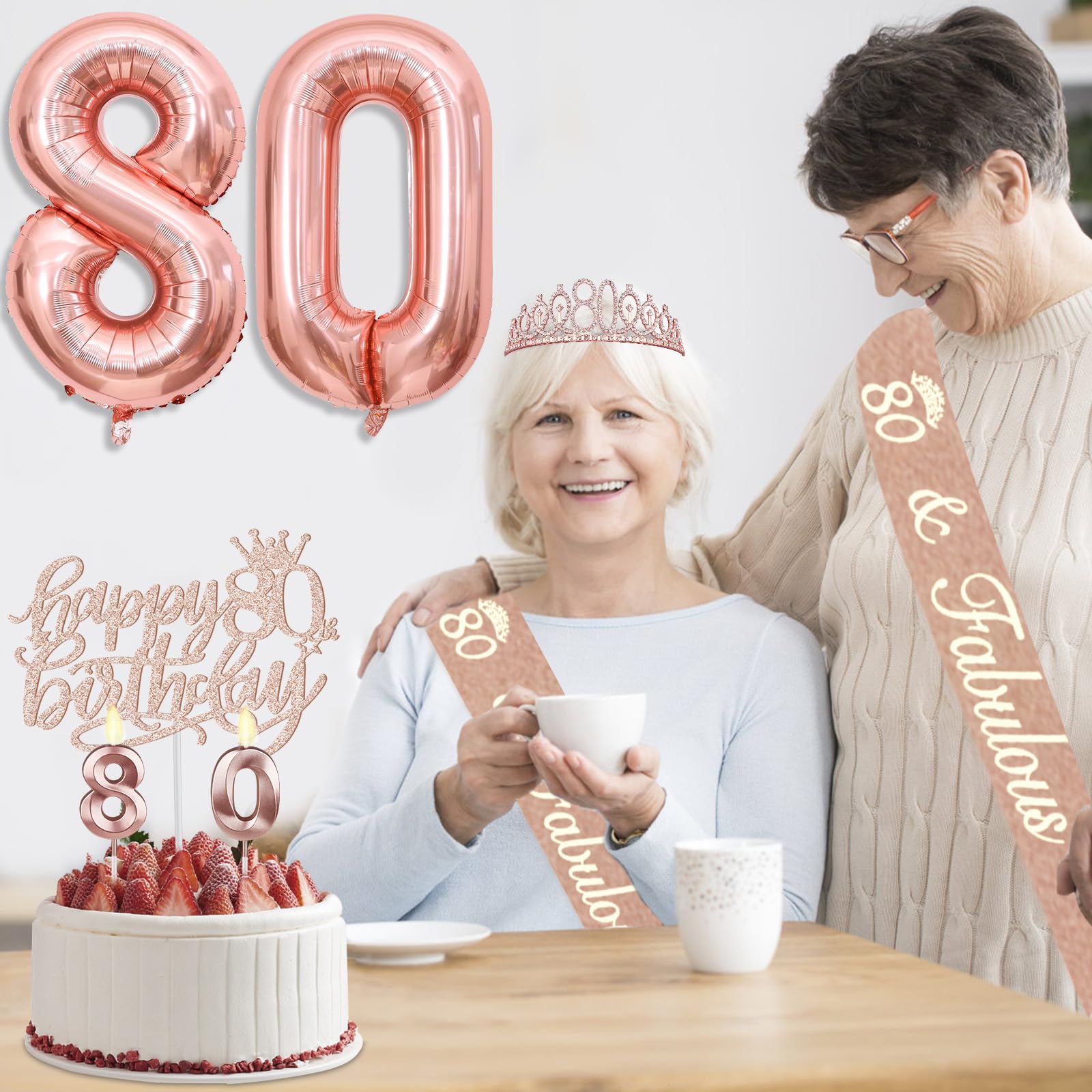 80th Birthday Decorations: Package coming with 80th Birthday Banner *1pc, 80th Birthday Tiara *1pc, 80th Birthday Sash *1pc, Happy 80th Birthday Cake Topper *1pc, 80th Birthday Candles *1set, 80th Birthday Balloons *1set, Rose Gold Tablecloth *1pc. The rose gold 80th birthday party decoration pack is the best way to meet different decorating needs; the all-in-one kit is perfect for creating an elegant and dreamy 80th birthday