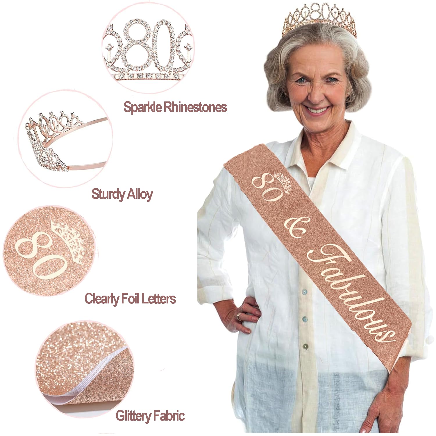 80th Birthday Tiara and Sash: The 80th Birthday Crown is made from quality alloy and rhinestone. Glittery 80 Birthday Tiara has Combs at the end of both sides, which ensures that it can grip the hair more tightly and comfortably for most women. Our 80 and Fabulous Sash is made of high quality glitter fabric with foil lettering. The sash is in 63 inch length and comes with a Gold Charm Pin that you can easily adjust the length in your need
