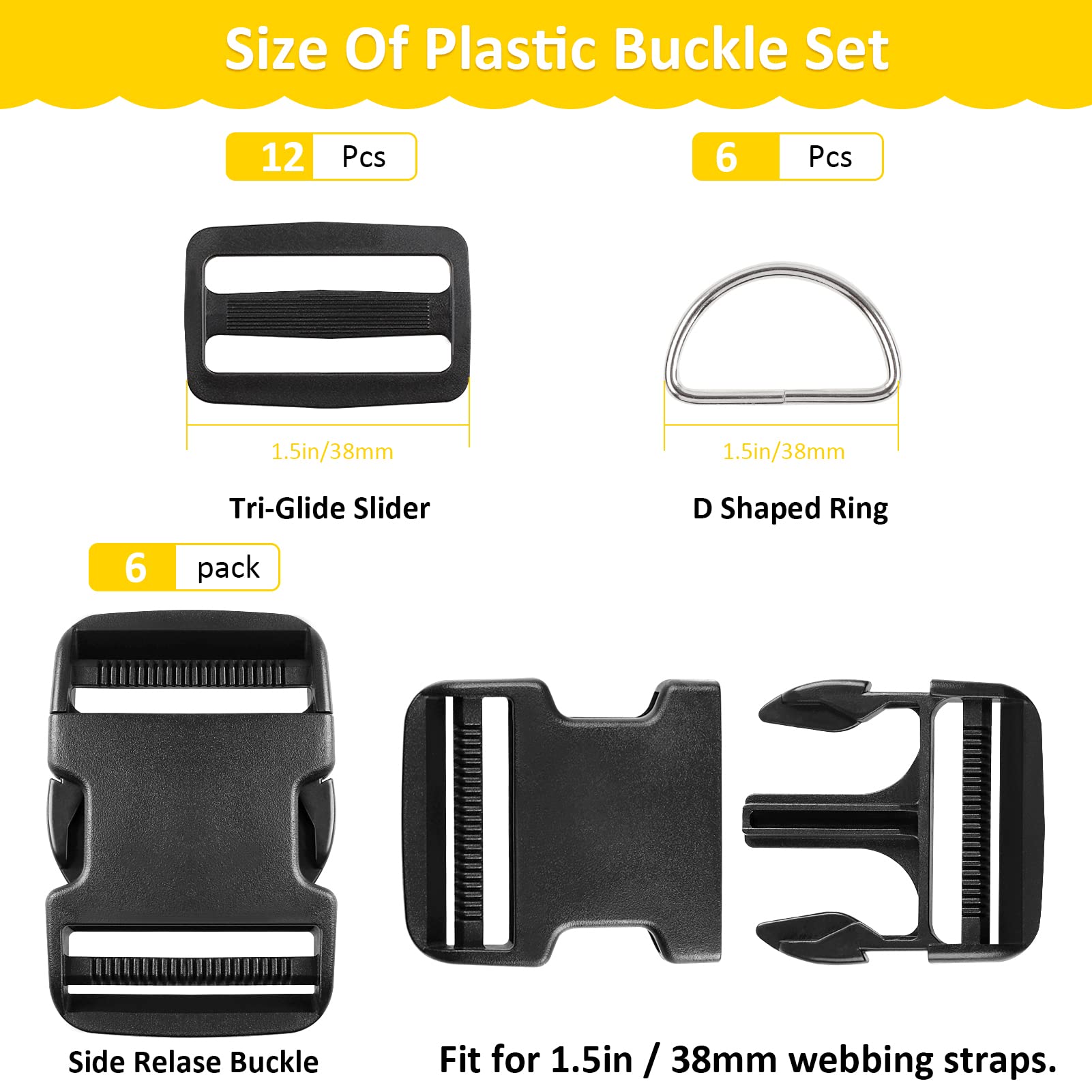 Package Includes: 1 Roll 6 Yards nylon webbing 1.5 inch with 6 Pcs quick side release Plastic Buckle and 12 pcs Tri-glide slide clip + 6 Pcs Metal D rings