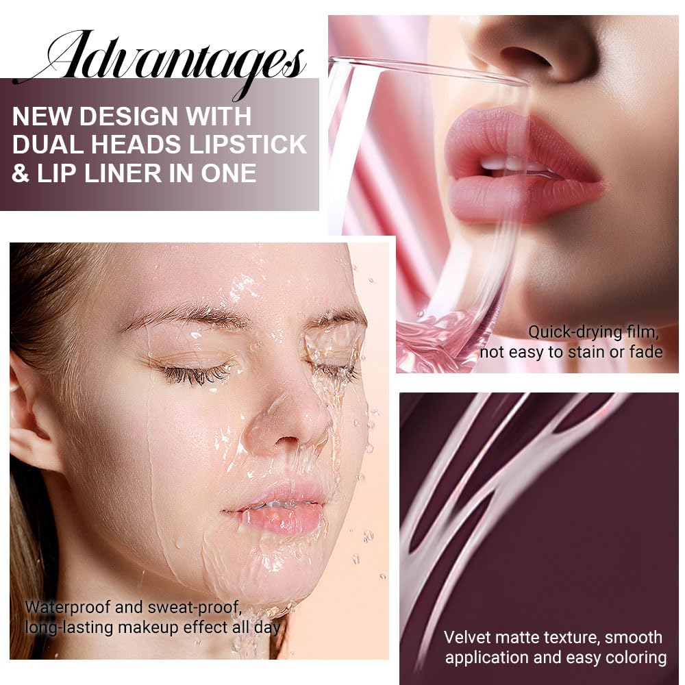 2 IN 1 Lip Liner & Matte Liquid Lipstick: The double ended design made you can use lipstick and lip liner on both ends. New design with dual heads lipstick & lip liner in one, for draw delicate lip line before applying lipstick. It combines lip line and metallic lipstick and makes double-end lipstick more perfect,meets the need of all occasions.