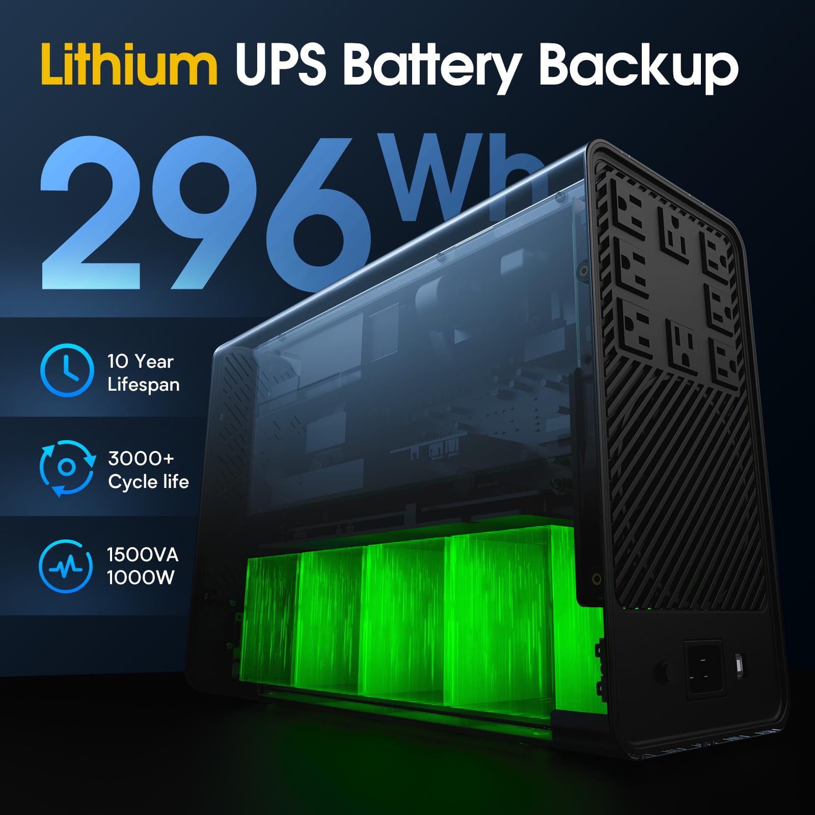 [LiFePO4 Battery & Ultra-long Endurance]: This lithium UPS features a cutting-edge Lithium Iron Phosphate (LiFePO4) Battery Pack (51.2V, 5.8Ah), offering an impressive lifespan of over 10 years and more than 3,000 charge cycles. Compared to conventional lead-acid batteries, it reduces the total cost of ownership (TCO) by over 40%. The advanced battery technology ensures long-lasting performance while eliminating the need for frequent replacements, making it a cost-effective and reliable power backup solution (Note: The LiFePO4 battery does not require replacement or any other hassle maintainance like Lead-acid battery)