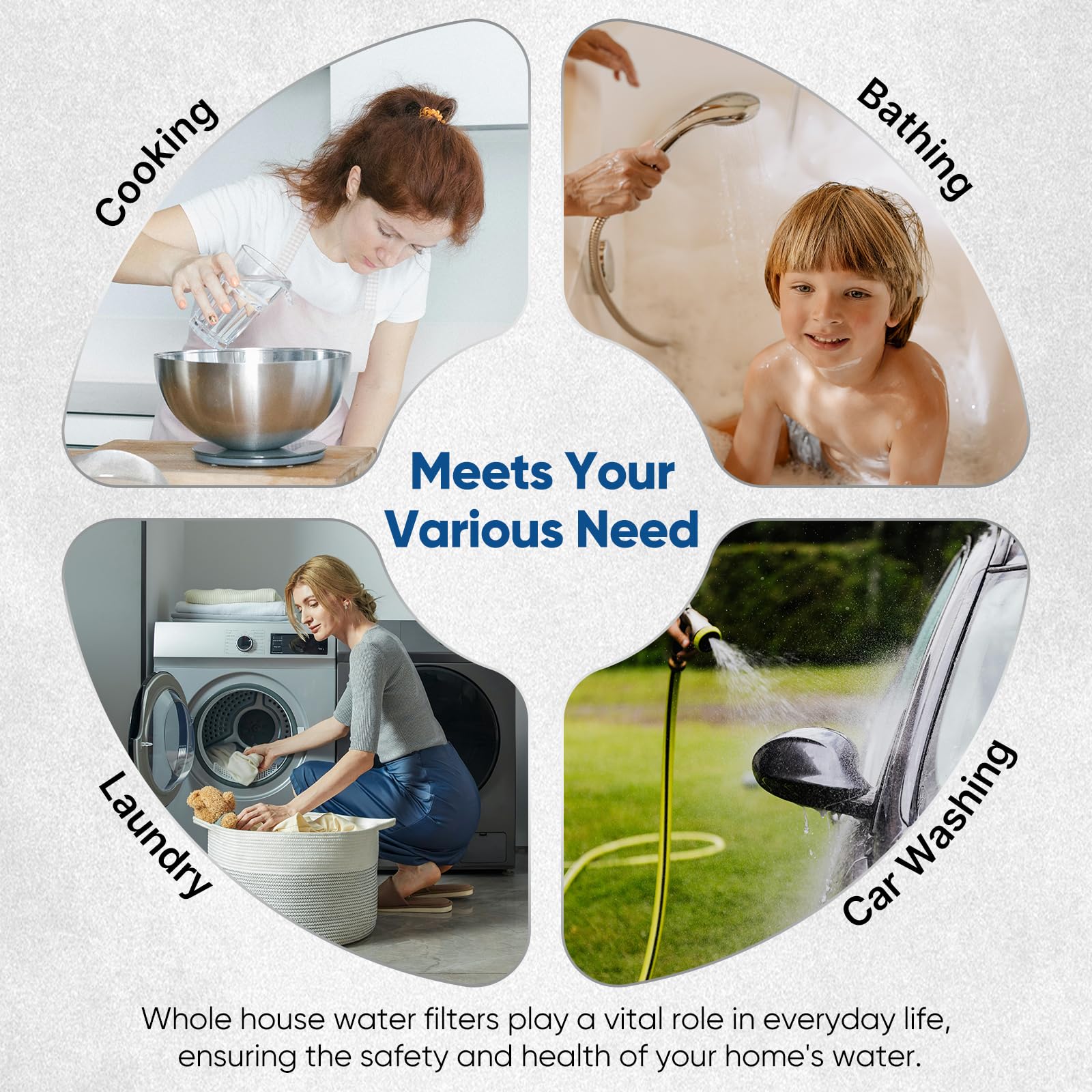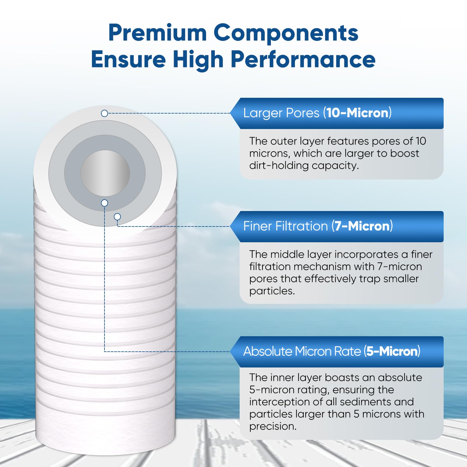 ❄️ 【Grooved Sediment Design】 This whole house water filter is designed with density three PP layers to remove most particle and sediments. Featuring a grooved design, this cartridge maximizes filtration efficiency, providing cleaner water for your household. The multi-layer density tech can capture impurities targetedly and have 30% longer service life than the other common type.