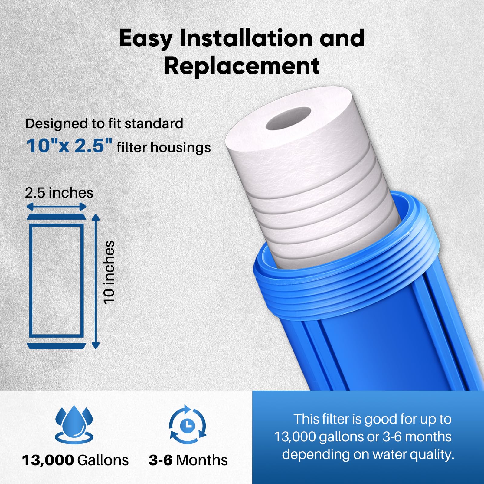 ❄️【Compatible Replacement Cartridges】Compatible with most standard 10" x 2.5" sediment filter cartridge, such as AO Smith AO-WH-PREV-R2, Aqua-Pure AP110, Whirlpool WHKF-GD05, Culligan P5/P5A, GE FXUSC, Pentair Pentek P5, DEV9109-08, Hydronix SGC-25-1005/SGC-25-1001, DuPont WFPFC5002, Aquaboon AB-SGR5M, American Plumber W5P/WPD-110, Pentair OMNIFilter RS14, 3M Cuno CFS110, Membrane Solutions GPP-F10, KleenWater KW2510G, Neo-Pure MBG-25098-05, Purtrex PX05, Watts FPMBG-5-975, 4WH-STDGR-F02, Project Source PS-WHS-MB2, etc.