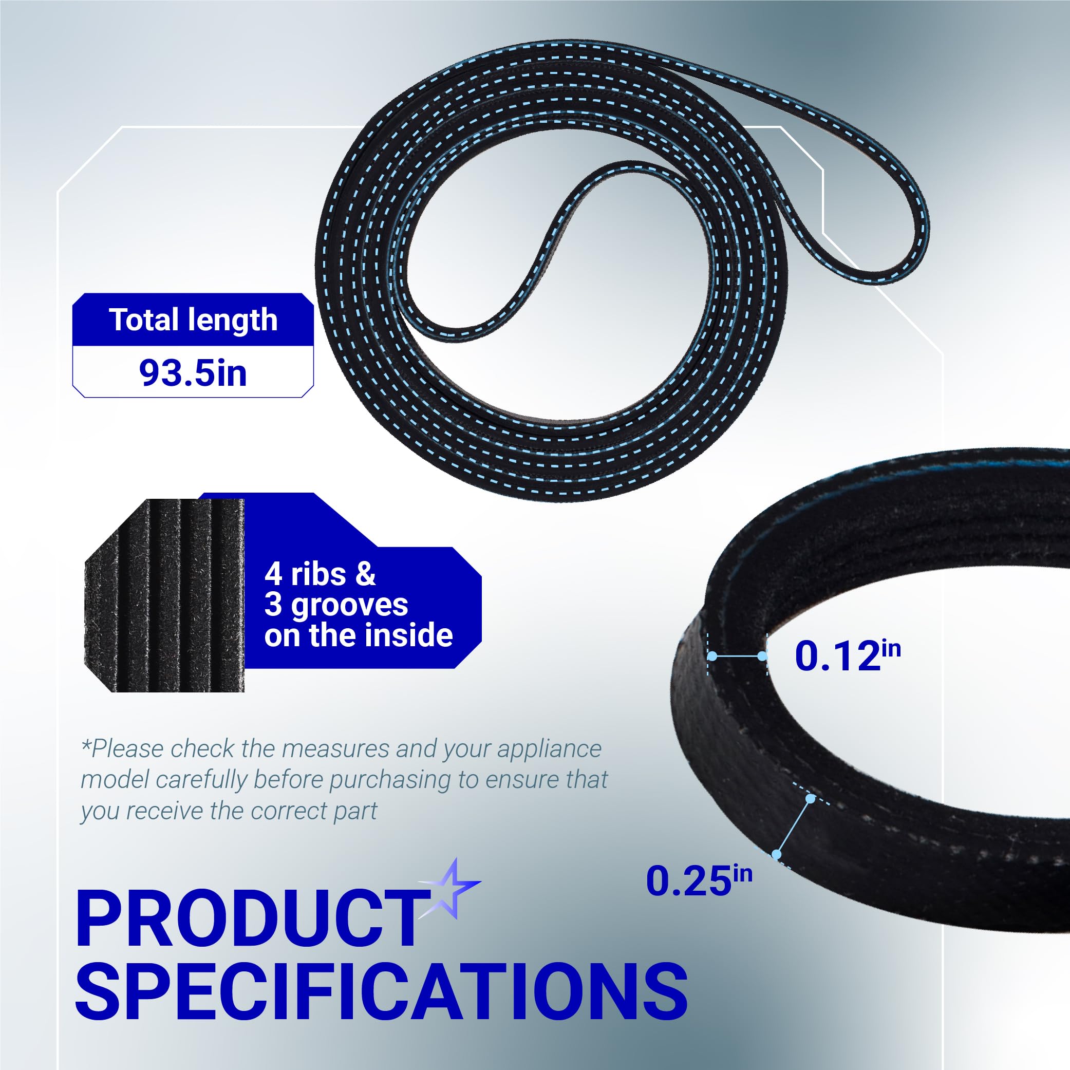 PREMIUM QUALITY: The belt is made from durable high-quality material, which features a high wear resistance and non-cracking design - Meets OEM standards - Ensure long-lasting and effective performance. It is 93 1/2 inches long, and 1/4 of an inch wide, with 4 ribs and 3 grooves