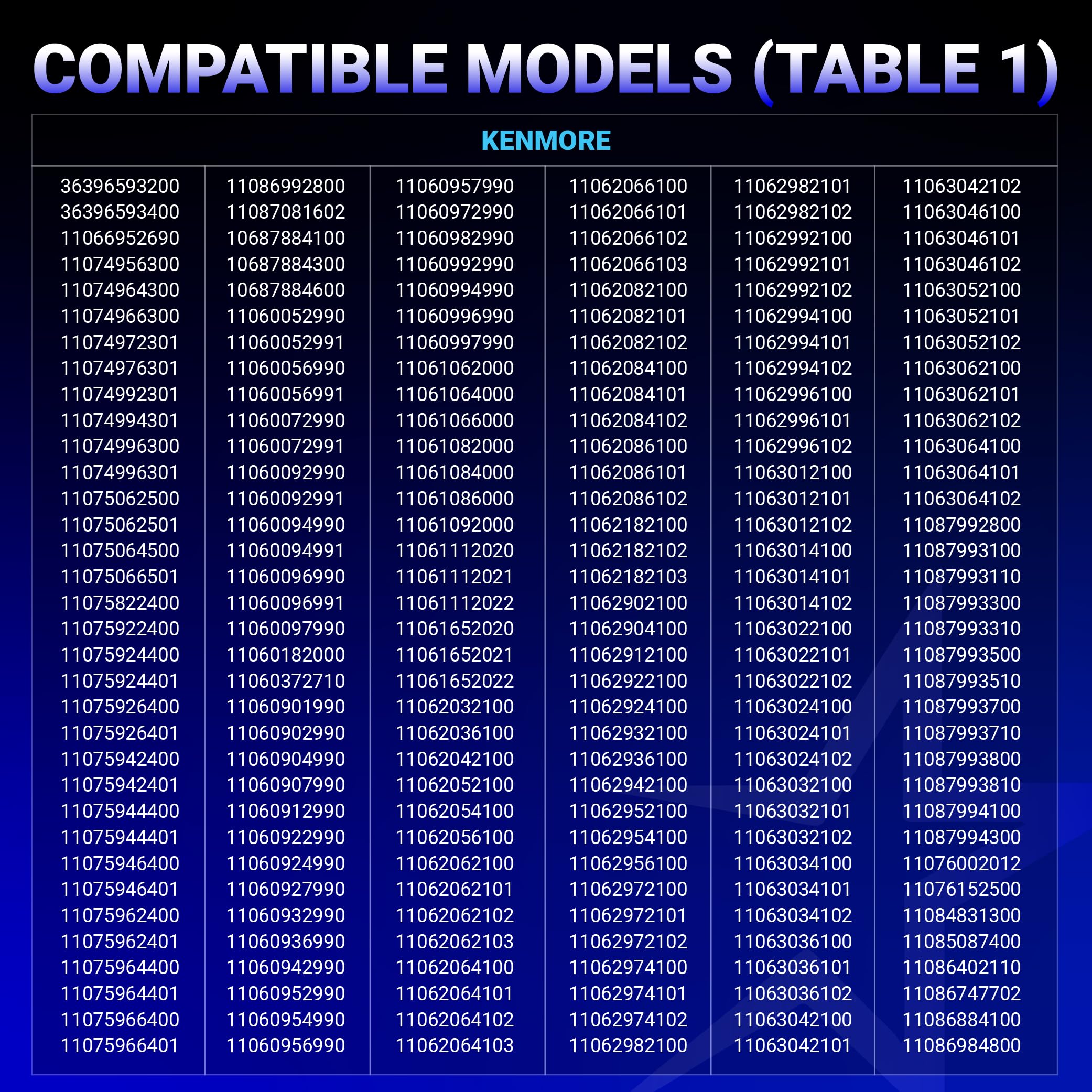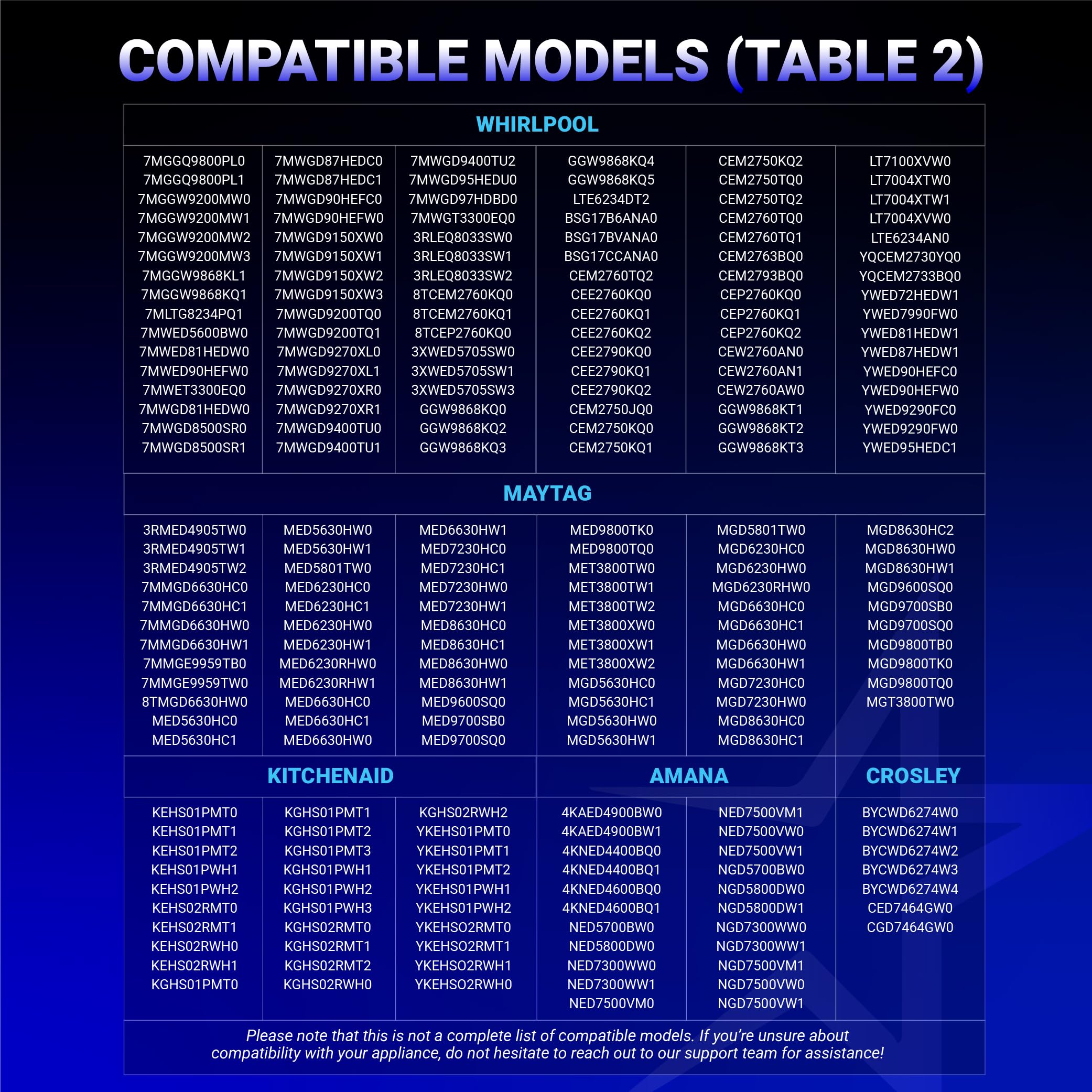 WIDE COMPATIBILITY: Fits models 106.97502820, 106.87884100, 106.87884300, 106.87884600, 110.6007299, 110.6090199, 110.6093299, 110.63022101, 110.66992501, 110.67761600, 110.7090199, 110.76901690, 110.77902792, WED9550WW2, WED9600TW0, WED9750WW0, WGD4985EW0, WGD72HEDW0, WGD72HEDW1, GEW9200LT1, GEW9250PW1, GGW9200LQ0, GGW9200LW0, GGW9250PW0, MED6630HC0, MED7230HW0, MED9600SQ0, NED5700BW0, NED7300WW1, 7MGGW9200MW0, 7MGGW9200MW1, 7MGGW9200MW2, CEP2760KQ0, CEP2760KQ1, CEP2760KQ2, etc.