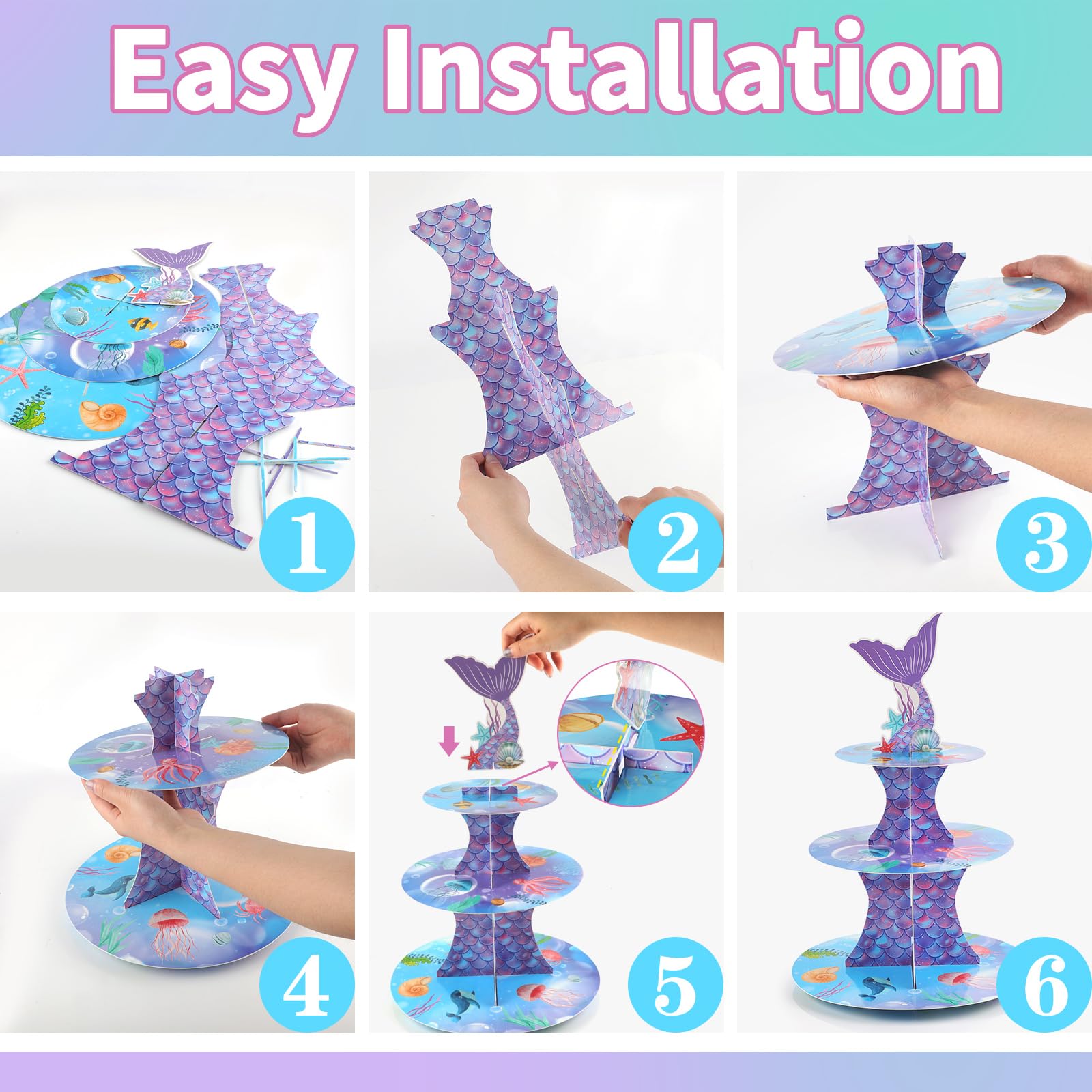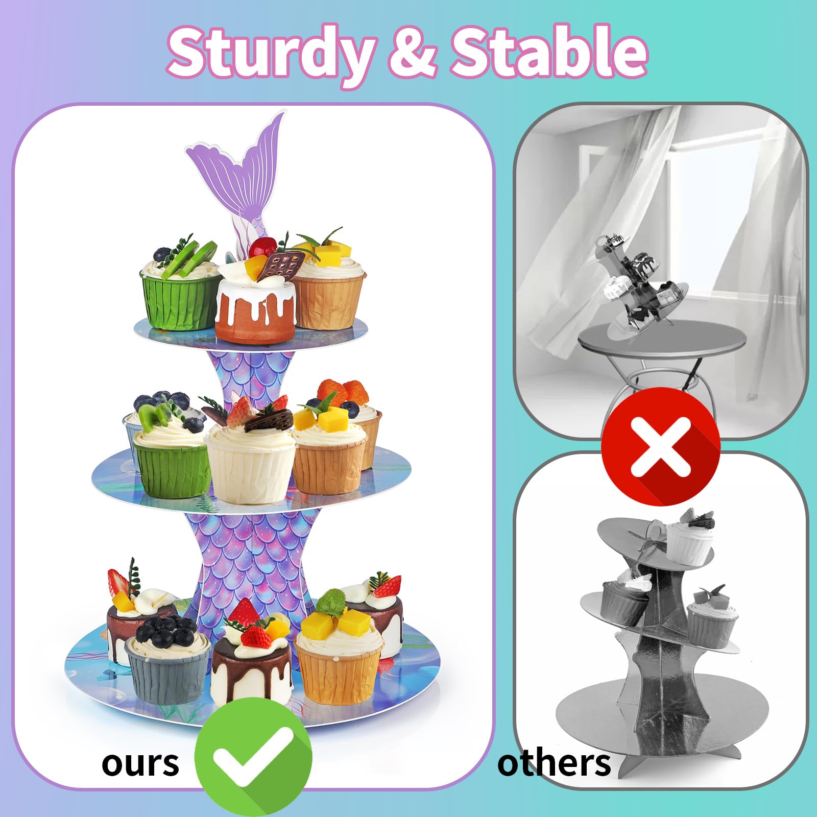 30s Quick Install: The 3 tier cupcake stand is made of a sturdy central stand and 3 round paper discs, easy to assemble by pre cut notches; even little kids can easily assemble the mermaid cupcake tier stand within 30s