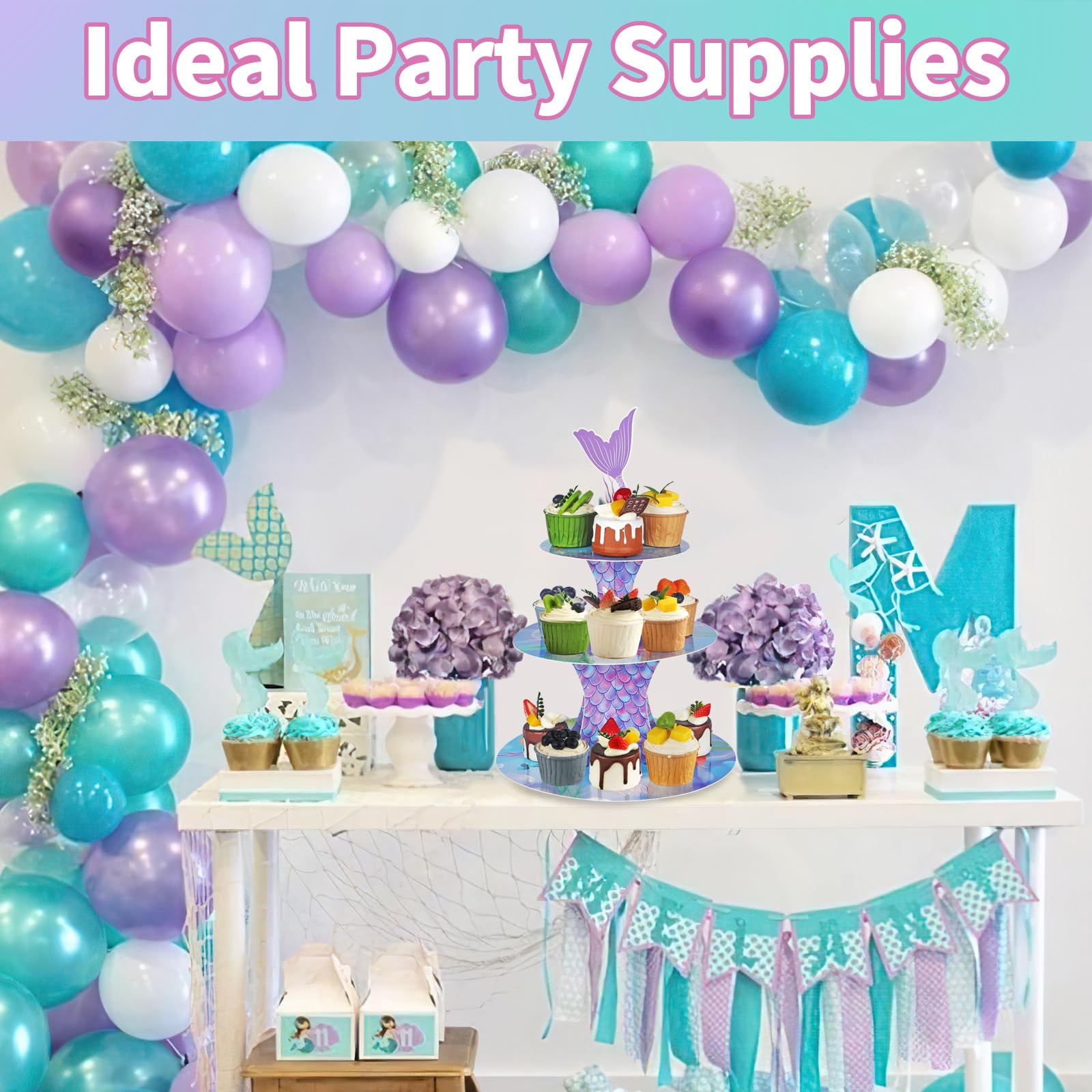 Mermaid Party Decorations: The cupcake tower comes with beatiful mermaid design; perfect for mermaid birthday party and baby shower supplies and under the sea party decorations; adding a great touch on the dessert table