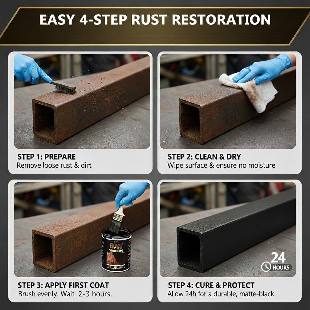Easy Application Process: Remove grease, oil, and other foreign substances from the metal surface, wipe dry, and apply Meuvcol Rust Stopper Converter with a brush. For best results, Always apply thin coats, a minimum of two anti rust paint for metal, and allow 24 hours to dry and form a protective film.