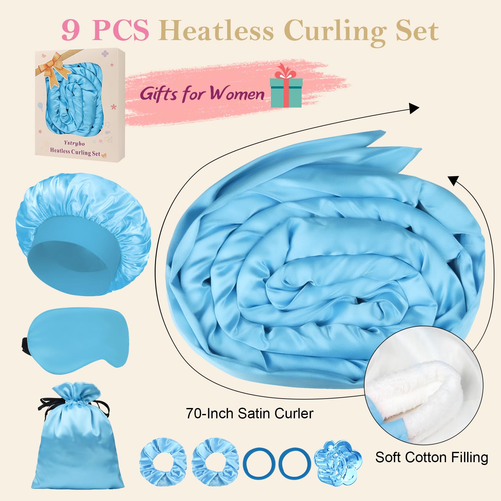 9 Pcs Hair Curler Set: All-in-one kit includes a heatless curling headband, a floral hair clip, a storage bag, a hair bonnet, an eye mask, two satin scrunchies, and two elastic hair ties. This heatless curling set is suitable for all hair types