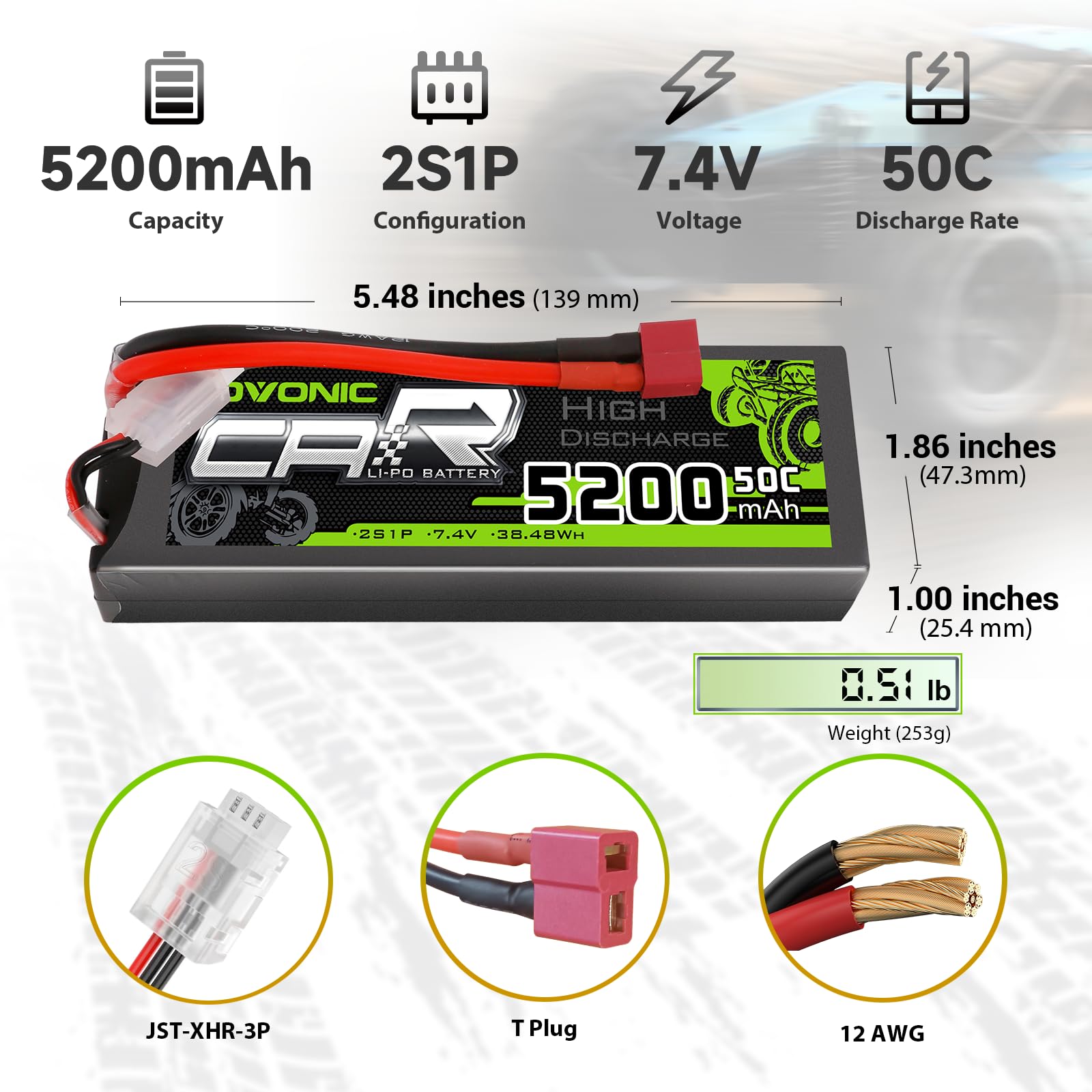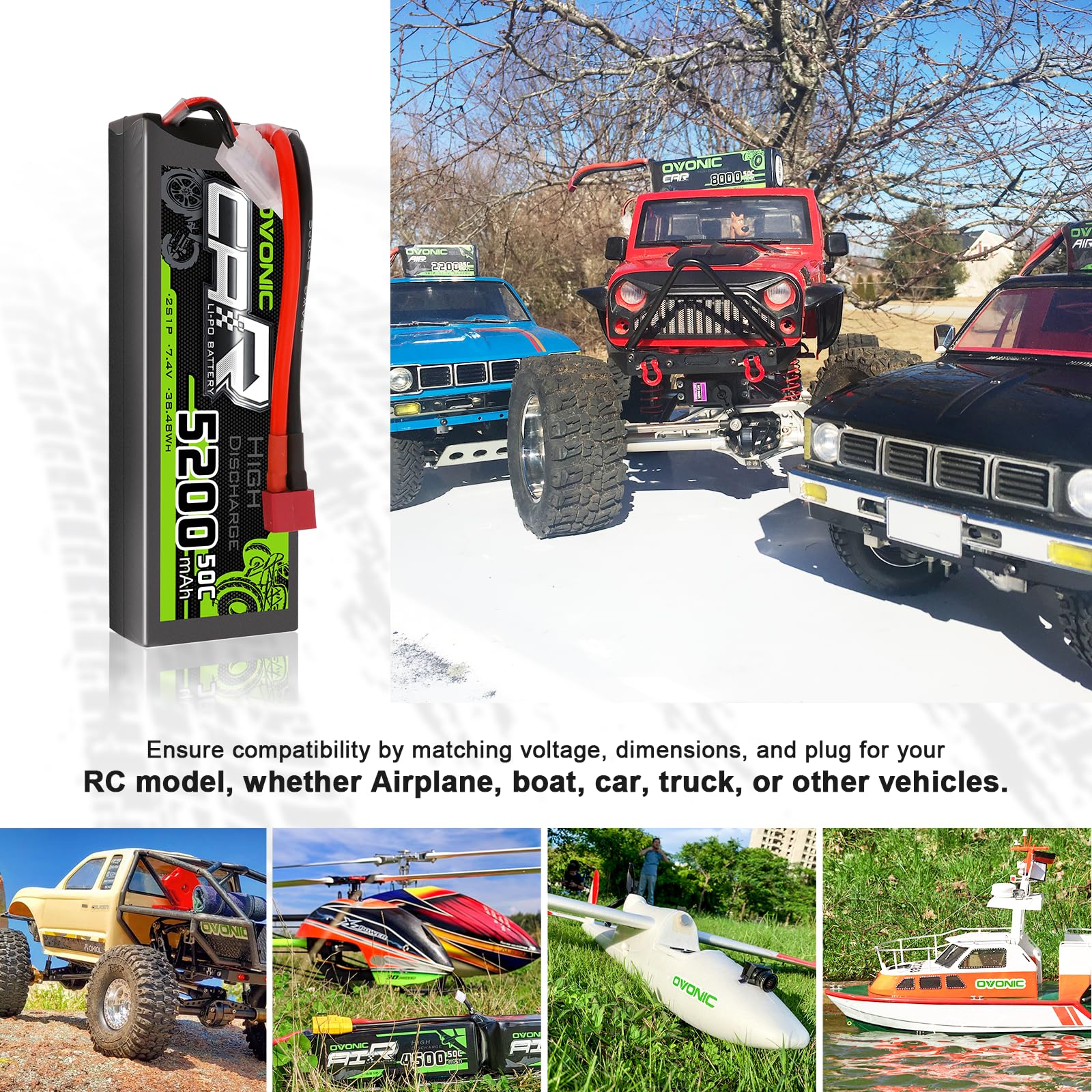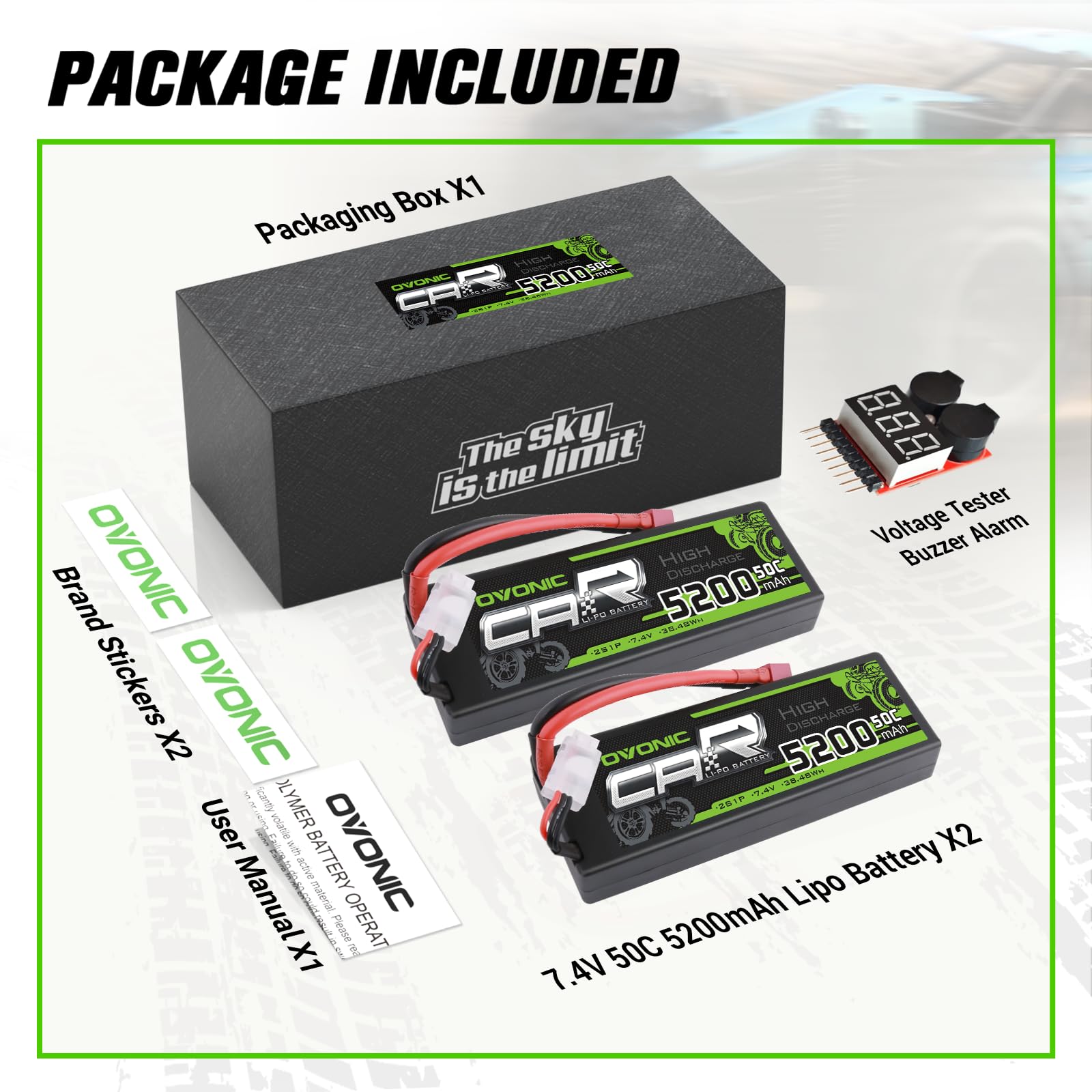 OVONIC 2s Lipo Battery 50C 5200mAh 7.4V Lipo Battery with Dean-Style T Connector for Car Truck Boat Vehicles (2 Packs)(with Lipo Voltage Checker)
