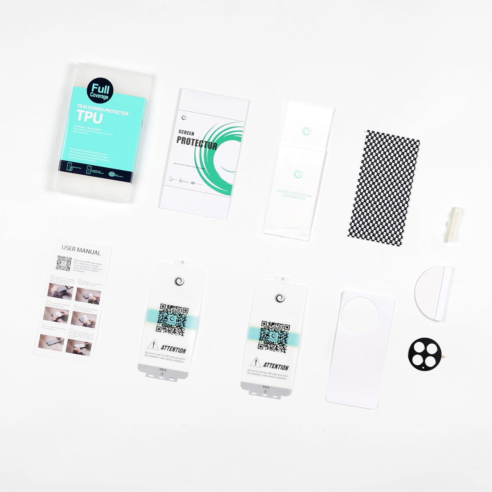 [Package Including]2Pcs TPU screen protector;1Pc Metal Camera Lens Protector("Hollow out" design);1Pc Back Carbon Fiber Skin Protector(transparet color);1Pc Easy Installation Frame; 2packs installation accessory kits,1Pc Installation Instructions