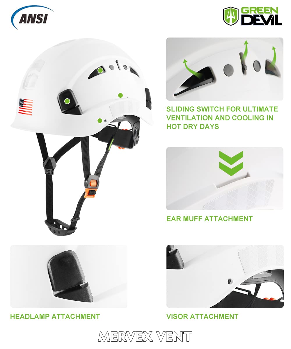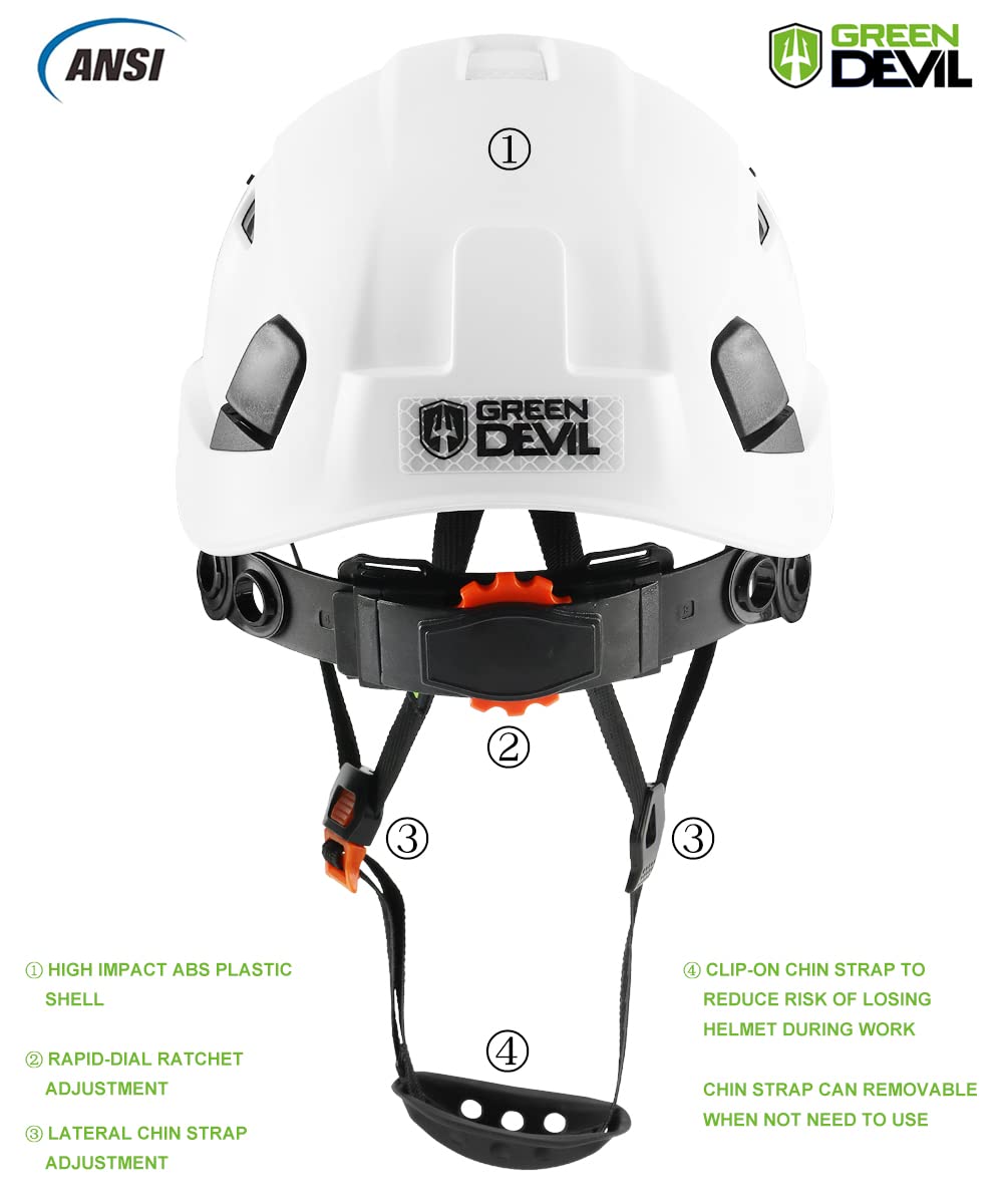 【Ideal For】:GREEN DEVIL Mervex Vent safety helmet is suitable for construction,tree climbing work,woodworking,mechanics, forestry,manufacturing,height and scaffolding work ,in any trade that requiring general head protection.