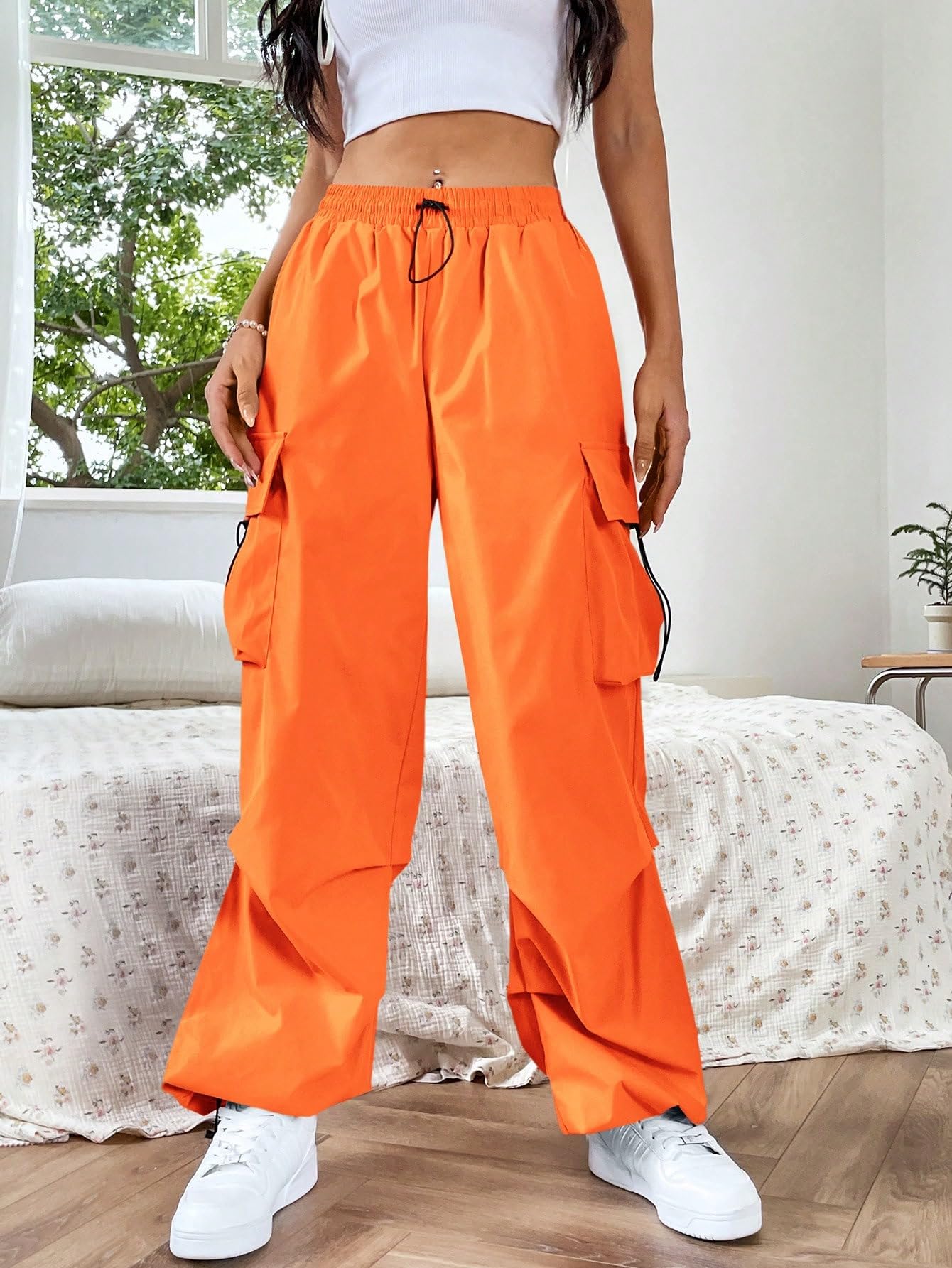 Features: Drawstring waist and hem, flap pockets, wide leg, loose fit, full length, plain color