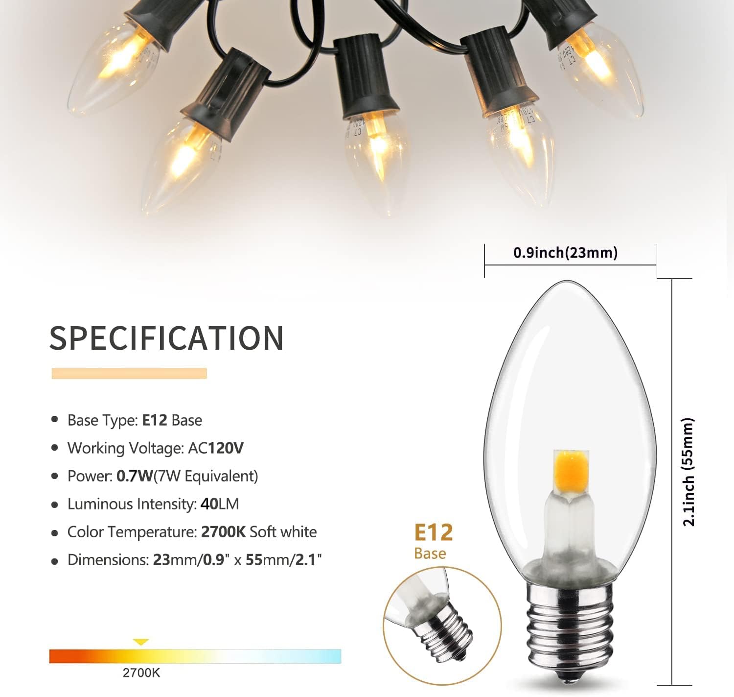 Wide Application: C7 LED bulbs are easy to install and are good choice for led Chandelier bulbs, nightlights, plug-in night light, decorative lighting, salt lamps, salt baskets, Christmas string light, Christmas villages, exterior patio light, dust electric candles, led candle light bulbs, window electric lights, wall sconces, living room cabinets, hanging lights and lamps, signs, exit signs, refrigerators and more. Create the right mood and atmosphere for your home.