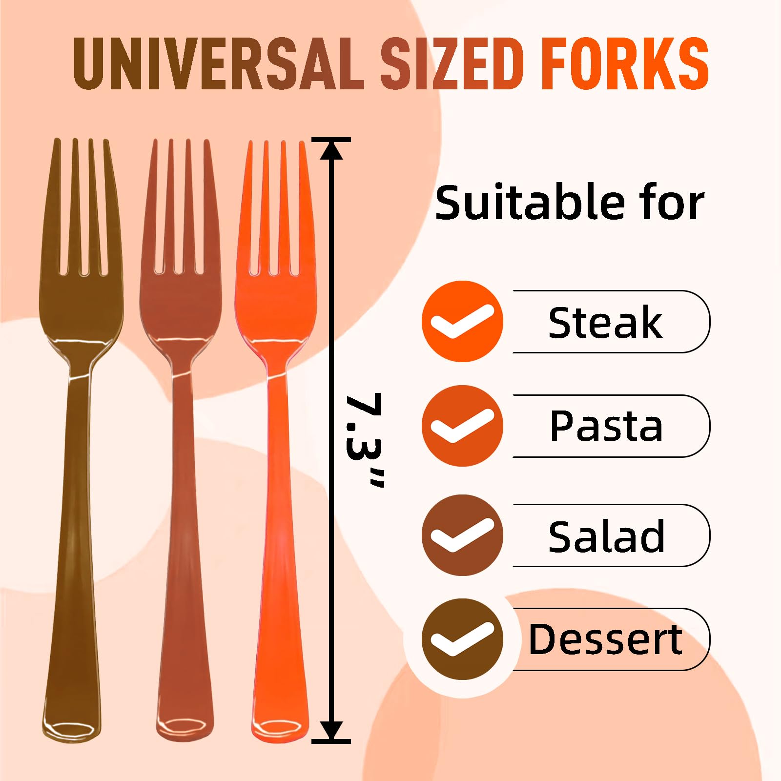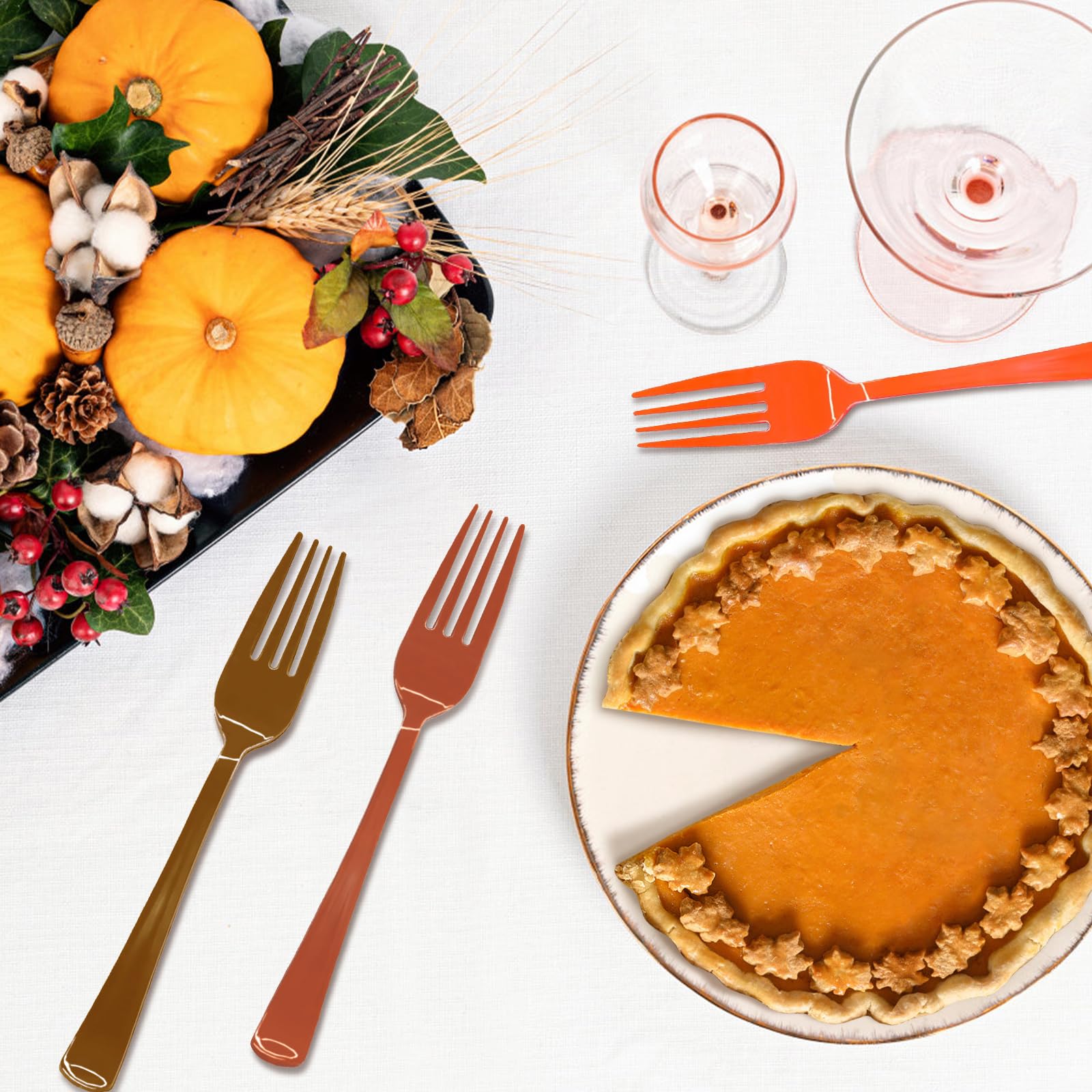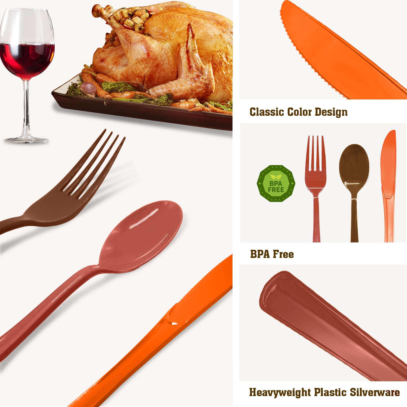 【Food-grade Material】: The Thanksgiving plastic silverware is made of food-grade plastic material, which is non-toxic and harmless and can be in direct contact with food. Thickly designed at the handle, it is less prone to breakage and deformity, and has excellent durability and reliability. High-temperature resistant and suitable for all types of food, the orange and brown plastic forks meets customers' needs.