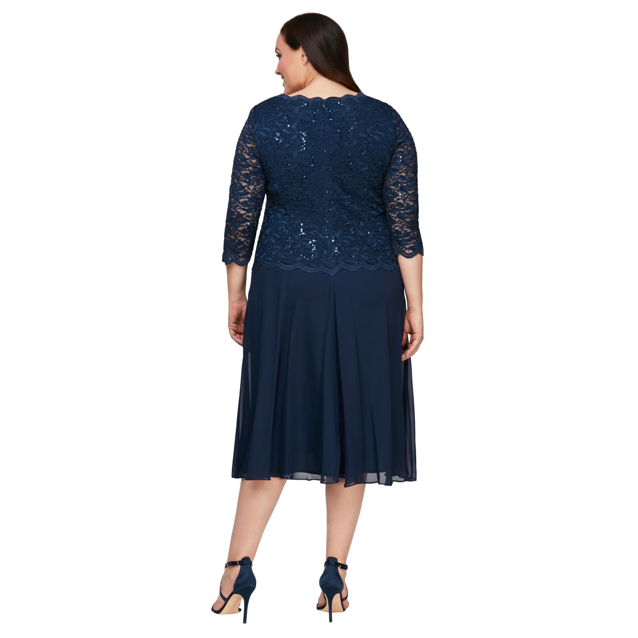 Description Our tea-length mock 2-piece cocktail dress is the picture of elegance with sheer lace sleeves, silky chiffon skirt & scalloped lace edges. Perfect for Mother-of-the-Brides (& Grooms)! Hand wash in cold water Lay flat to dry Items must be unworn, unwashed and undamaged, with all tags attached Final sale items cannot be returned Items sent back without authorization, or an Alex Evenings return label, may not be eligible for refunds