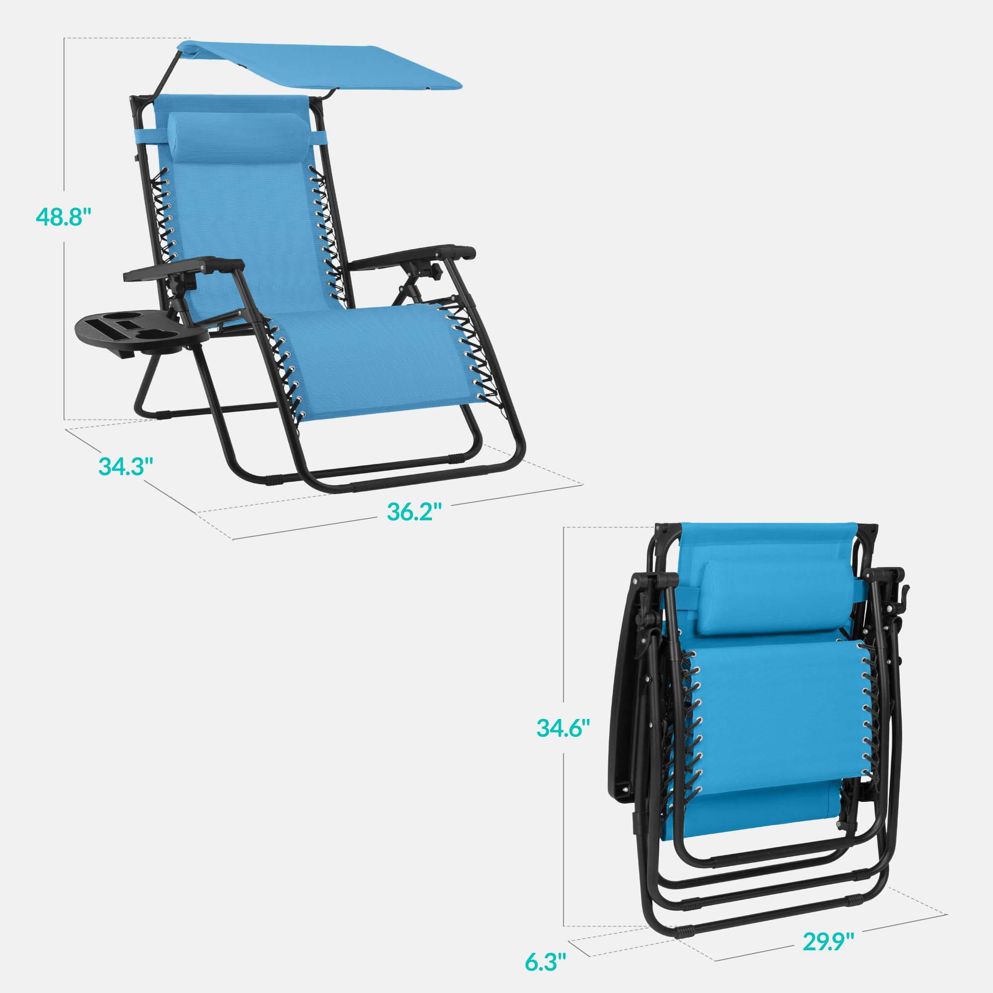 BUILT-IN COMFORT & CONVENIENCE: Features a removable headrest for personalized neck support and a detachable tray with cup and phone holders, keeping your essentials close while you lounge in zero gravity comfort; OVERALL DIMENSIONS: 34"(L) x 30"(W) x 49"(H); WEIGHT CAPACITY: 440 lbs