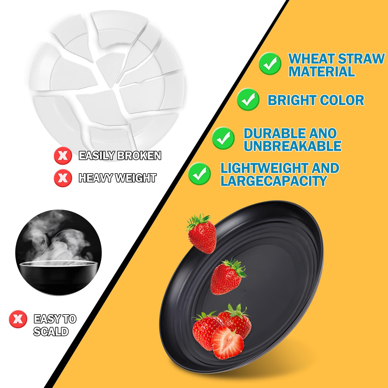 Durable and Unbreakable: Our 4-person wheat straw plastic dinnerware set are made from a unique blend of wheat straw and plastic materials, ensuring they are 100% BPA-free and resistant to breaking, unlike traditional ceramic or porcelain dishes.